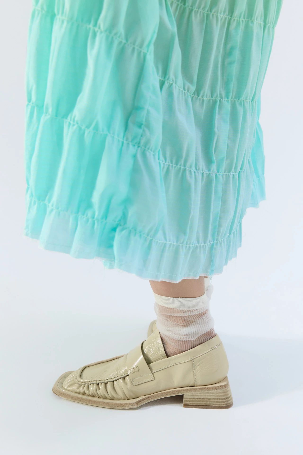 A classic unlined penny loafer with ruched apron detailing is handcrafted from soft glossy beige leather and juxtaposed with an angular stacked leather heel and oversized sole, finished with a doubled welt and metal staples.