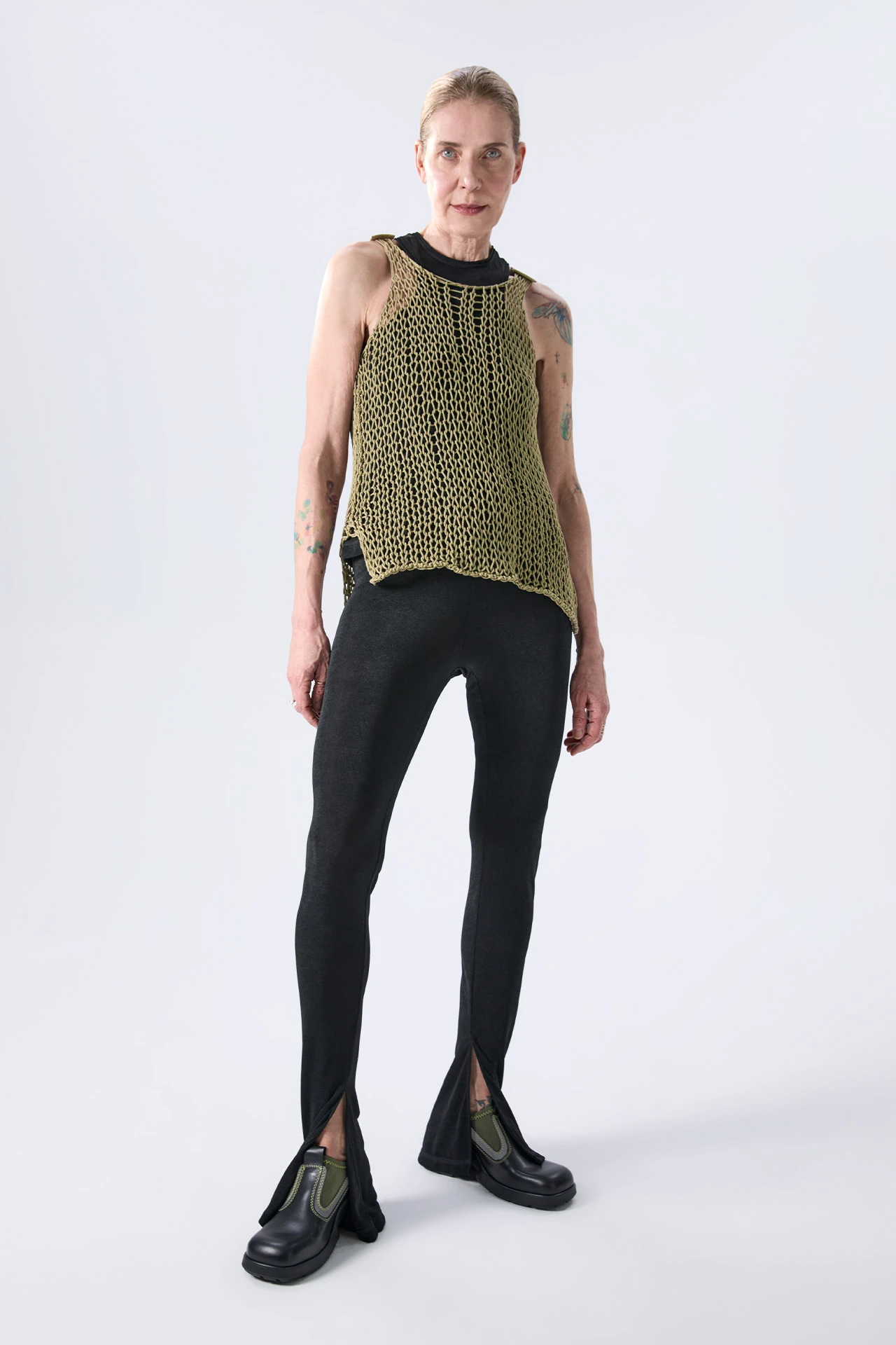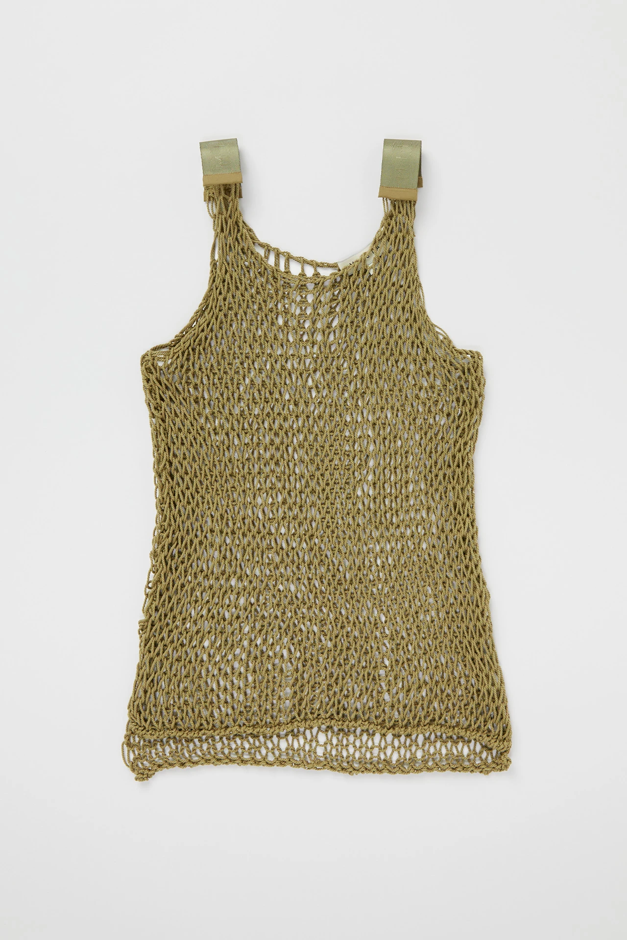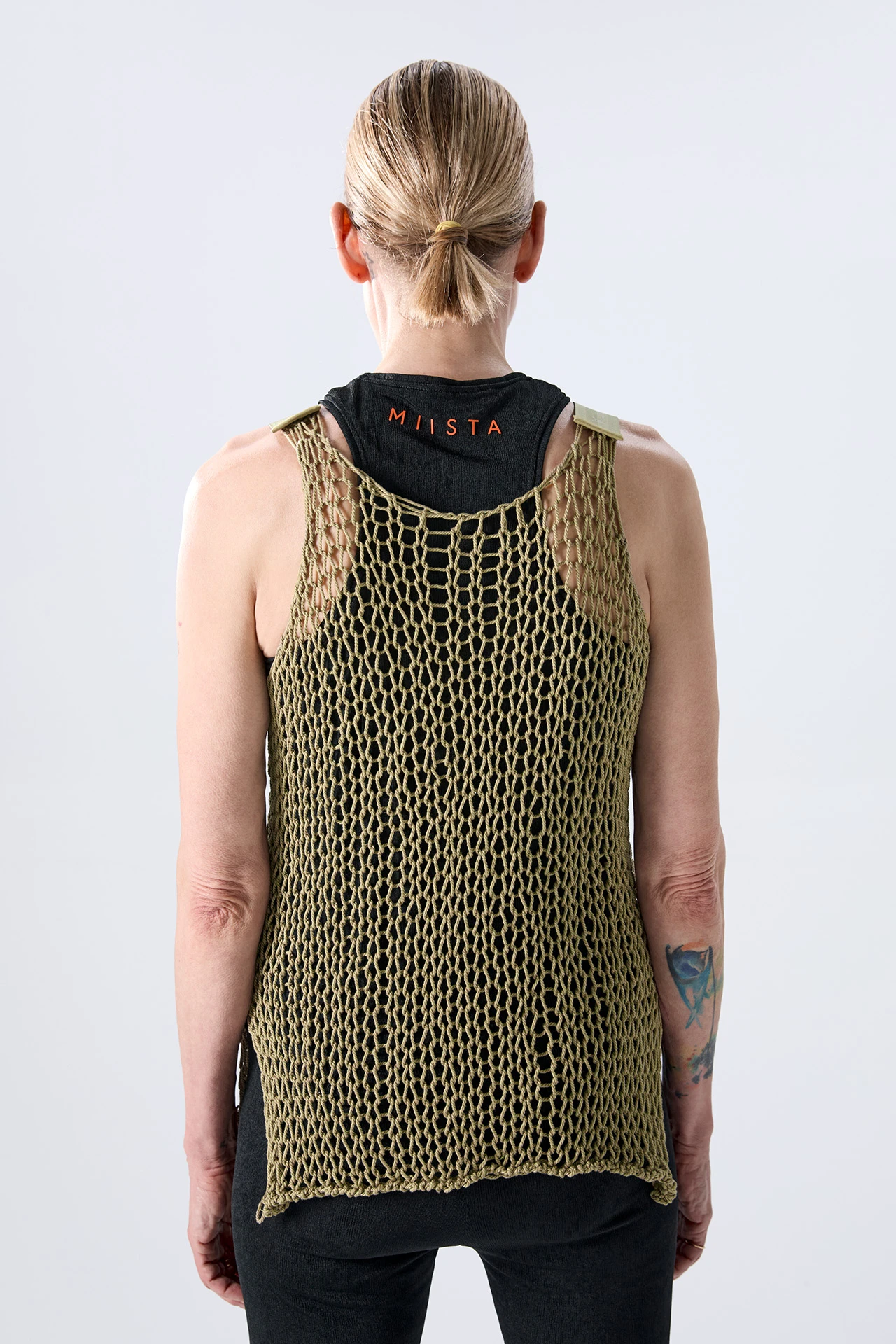 Aliak’s full of holes. Made from 100% cotton, her irregular, wide-open knit serves as a window to whatever lies beneath. She’s got a scooping, loose neckline that curves up to meet short nylon seatbelt-style straps, subtly branded with the Miista wordmark – expertly contrasting with her natural fibre construction.