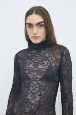 Alves might be high-necked and long-sleeved, but she’s no prude. Formed of elasticated black lace, she weaves across the body like a second skin, forming floral-esque patterns as the lace’s density ebbs and flows. She clasps at the neck and has suspender straps to either attach or leave dangling over clothes. She can be layered under or over – or with nothing else at all.