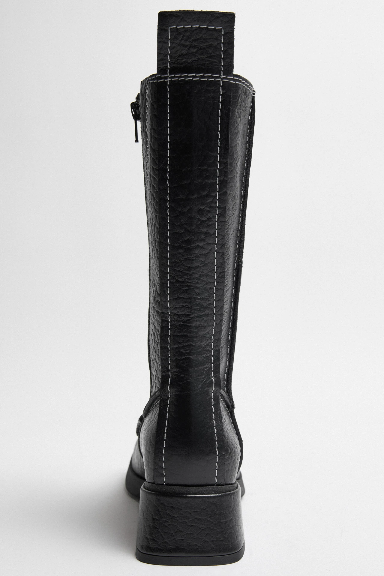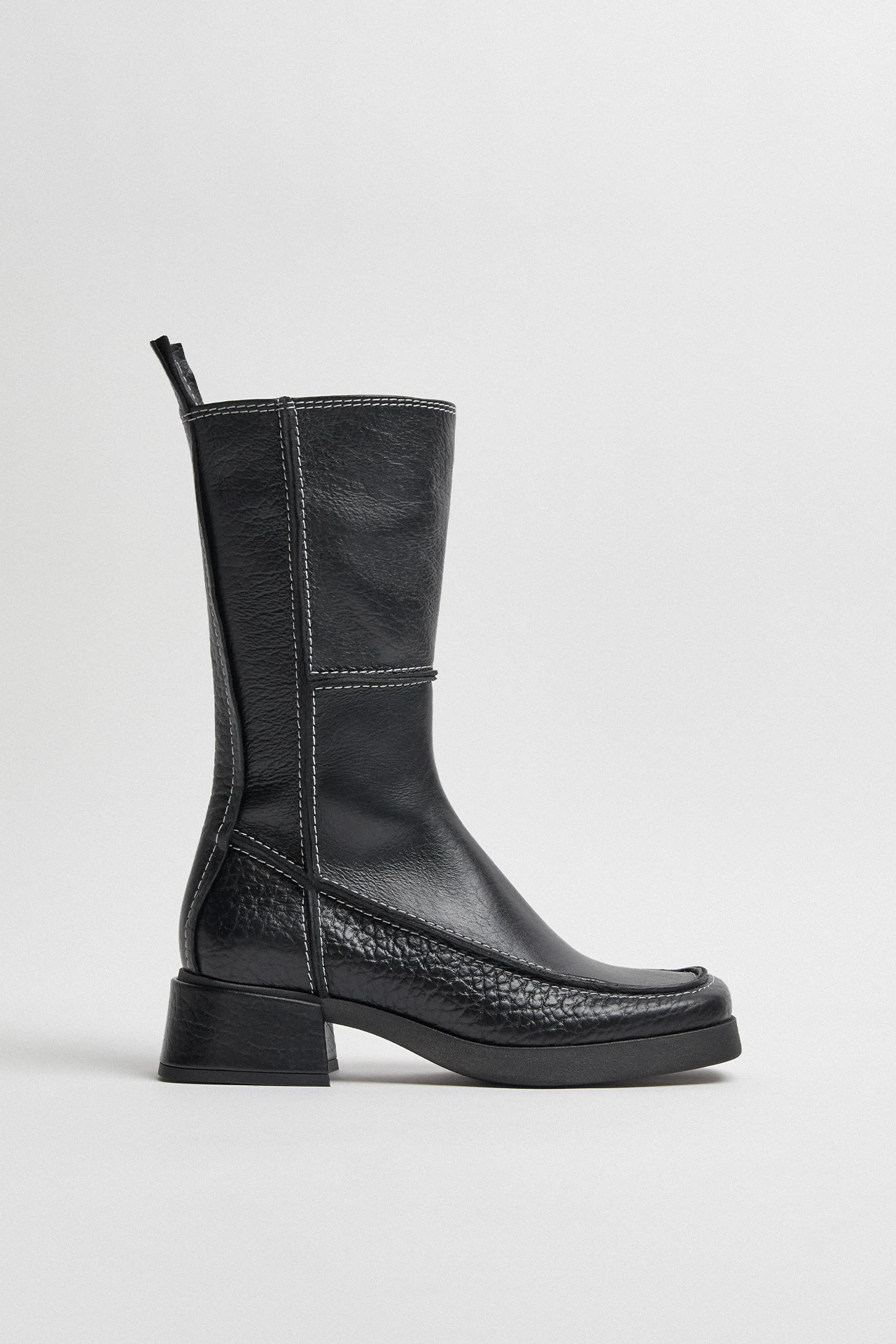 Alzira’s mid-calf, platform silhouette flirts with the 1970s before looking to the future. In a playful panel design, her contrast white stitching and lightly embossed leather steps her forward into the modern day, set on a raised sole and complete with a statement boot-pull tab.