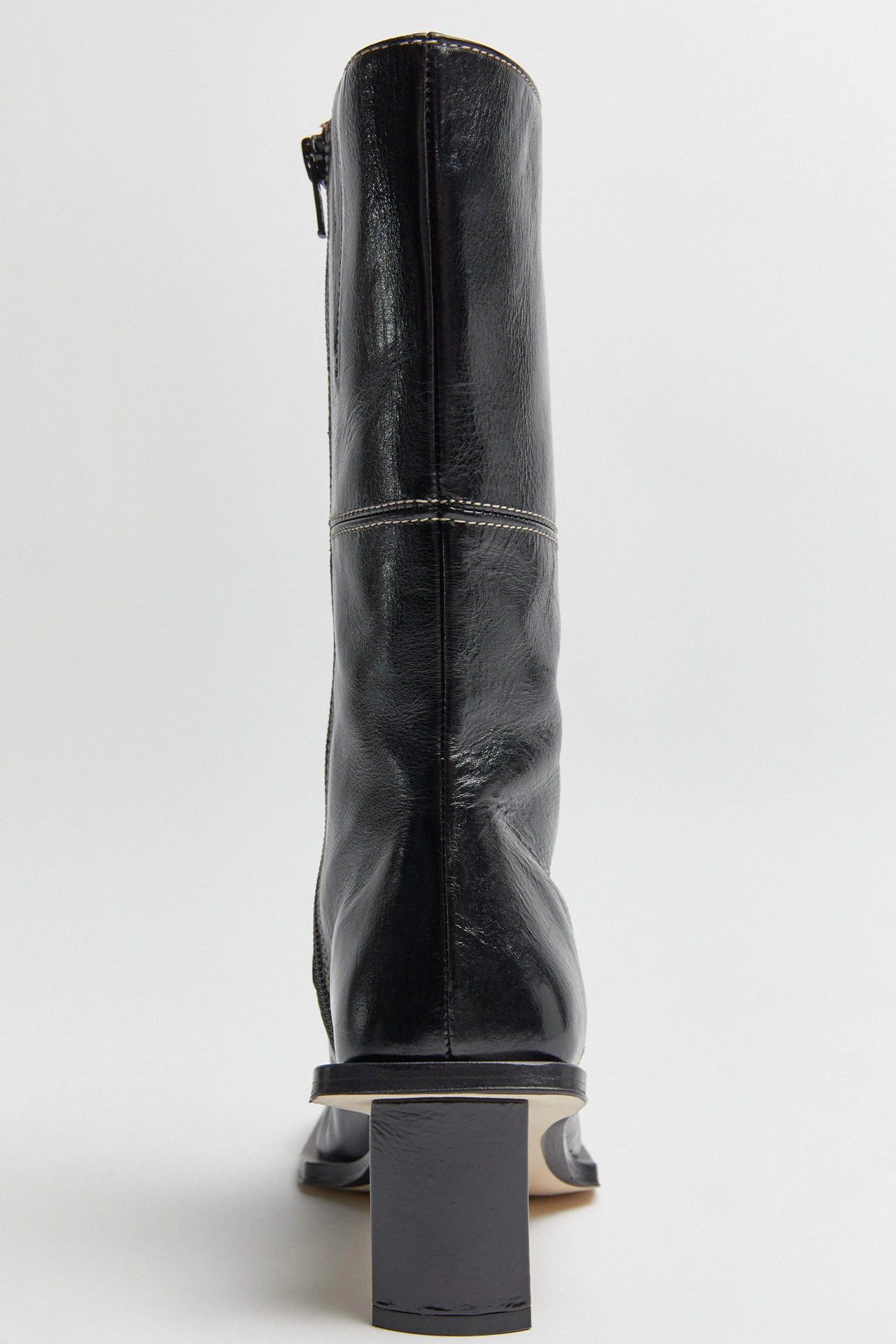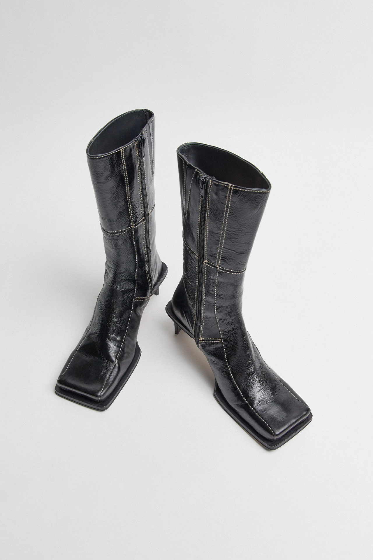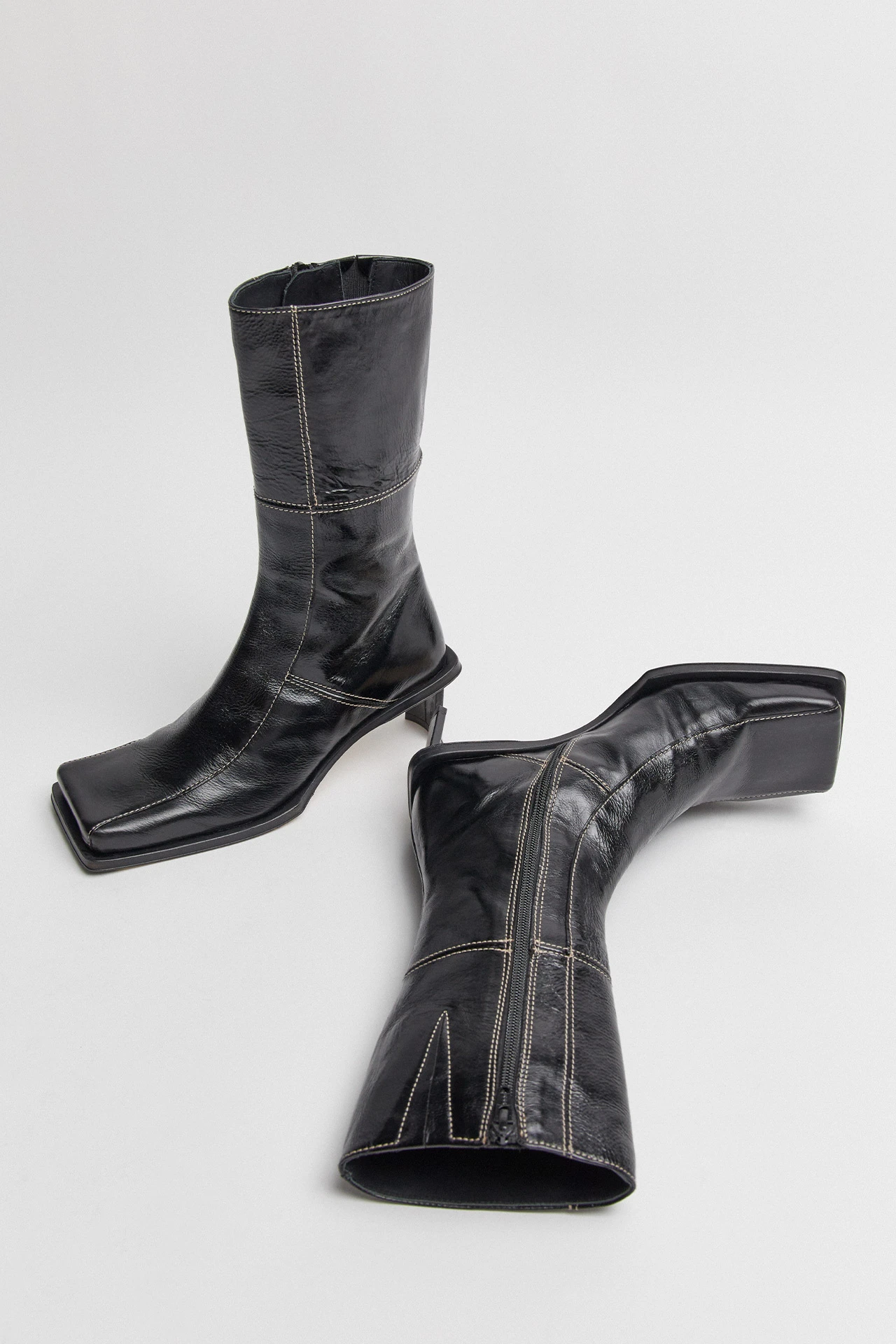 Amparo toys with the power of opposites, contrasting her statement square toe with an ultra-slimline curved heel. Her toe drops off at an oblique angle, reaching down to join her extended outsoles. She’s built from black leather paneling, joined with contrast white stitching. A discreet zipper runs the length of this mid-calf Icon, with an elastic gusset allowing for the perfect fit. Amparo is finished with memory foam insoles and vegetable tan cow leather lining for enhanced comfort, plus a rubber heel cap and rubber-invected toe on her vegetable tan cow leather sole for robust durability.