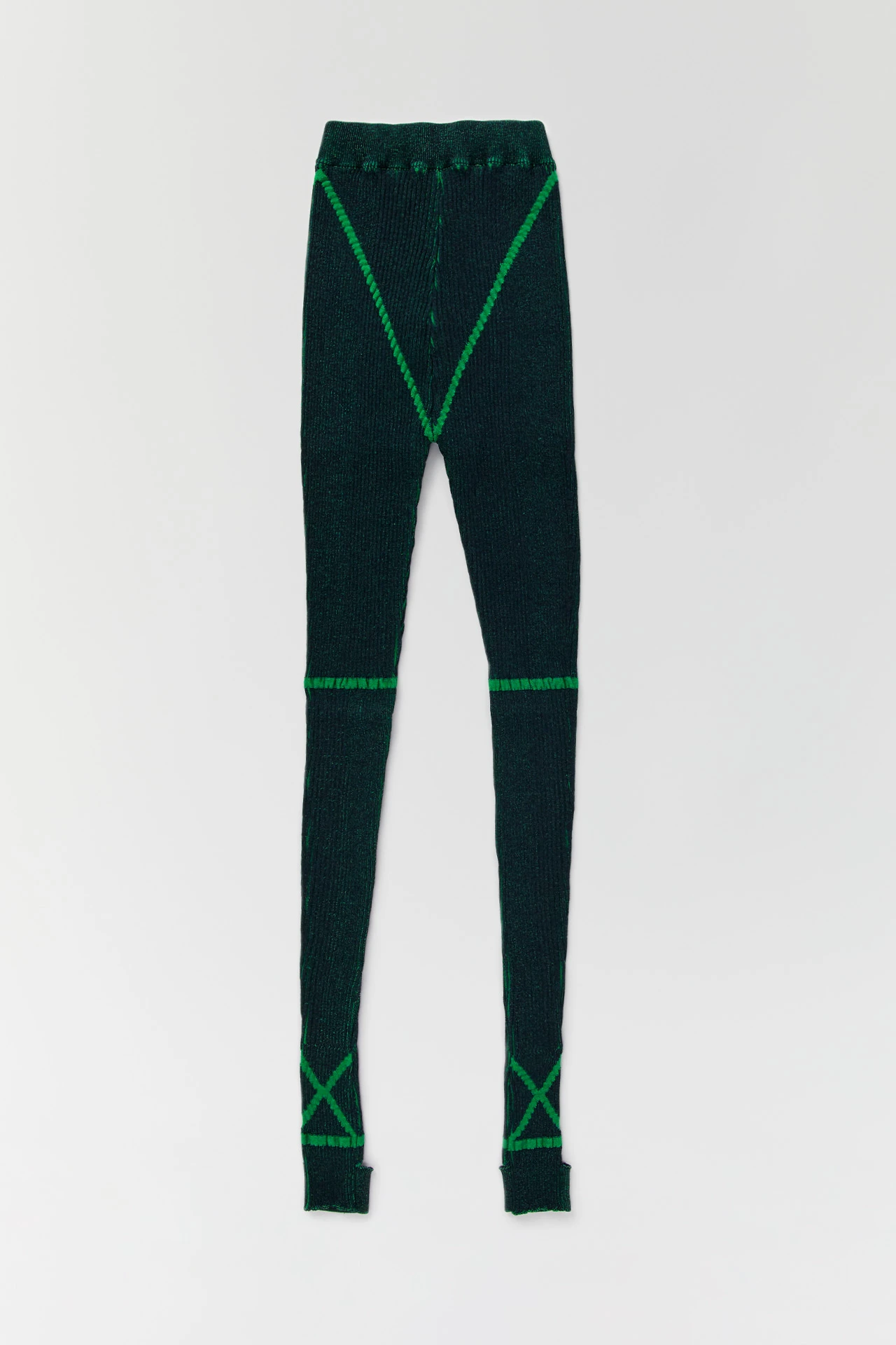 Bernice strikes unchartered territory – where knitwear materiality meets sportswear sensibilities. Formed of a stretch viscose knit, the ribbed finish creates a two-tone effect, with green peeking out between the linear black ribbing. Thicker green lines run from the hips to the crotch, across the knees, and then criss-cross the ankles – which, at odds with convention, are not where these trousers end. Instead, they hug the upper foot, held by stirrups running under its arch.