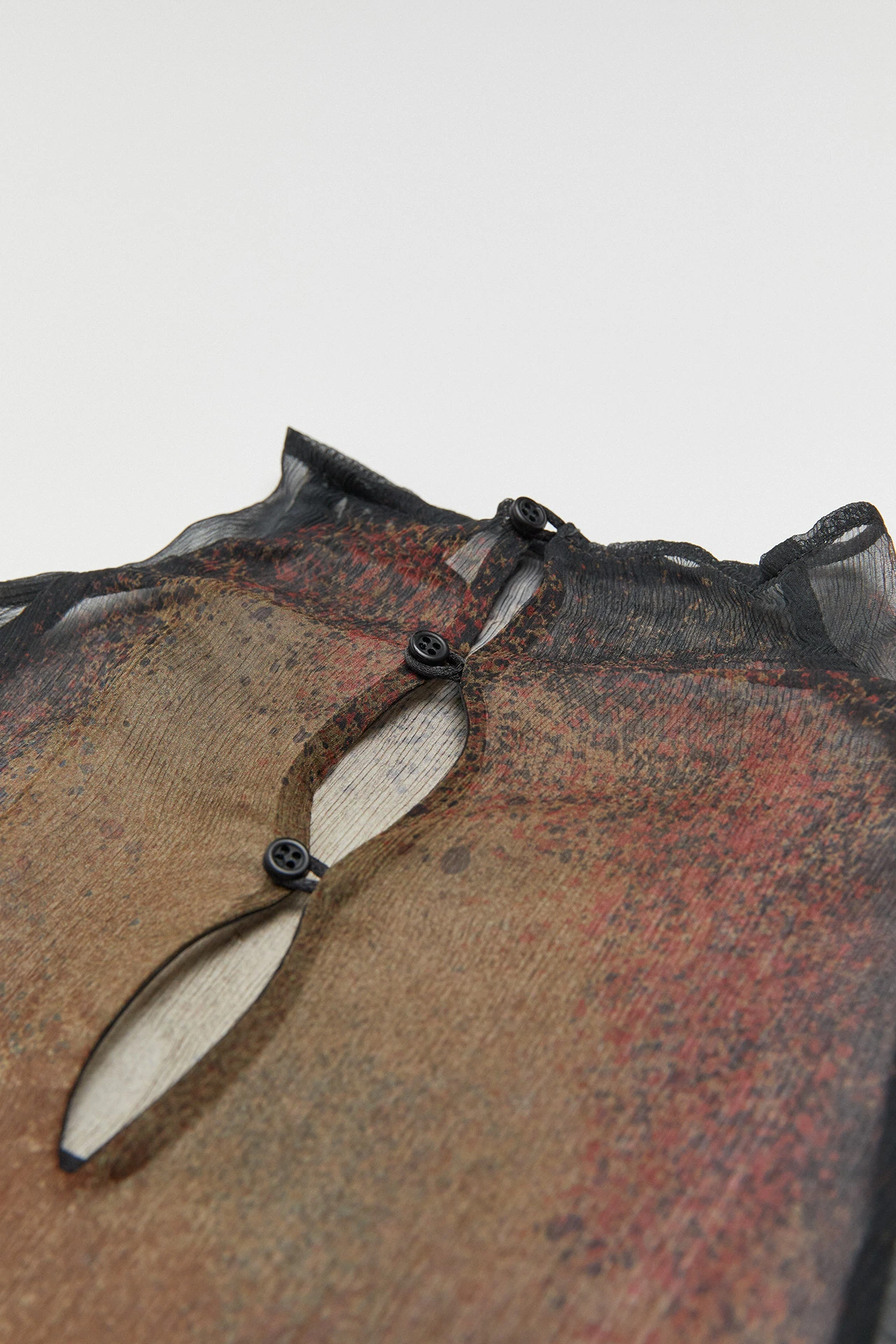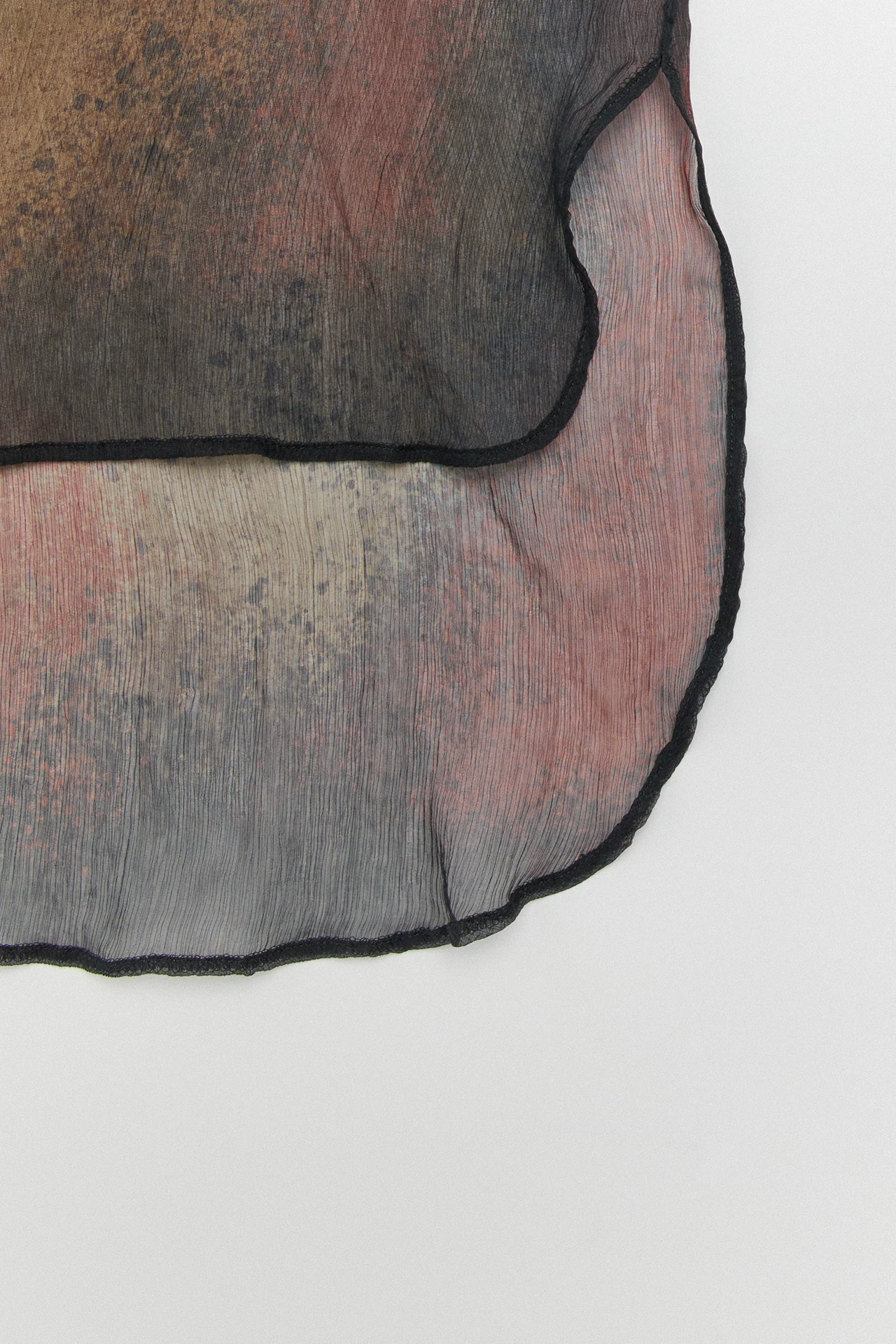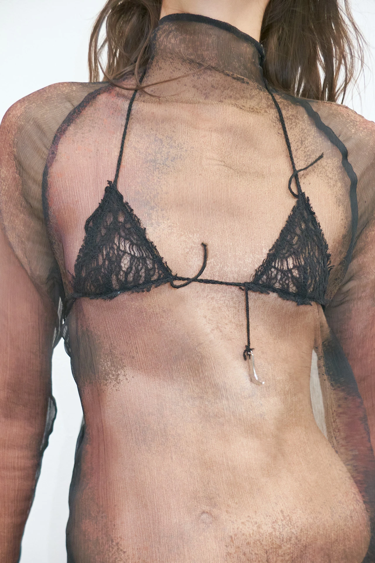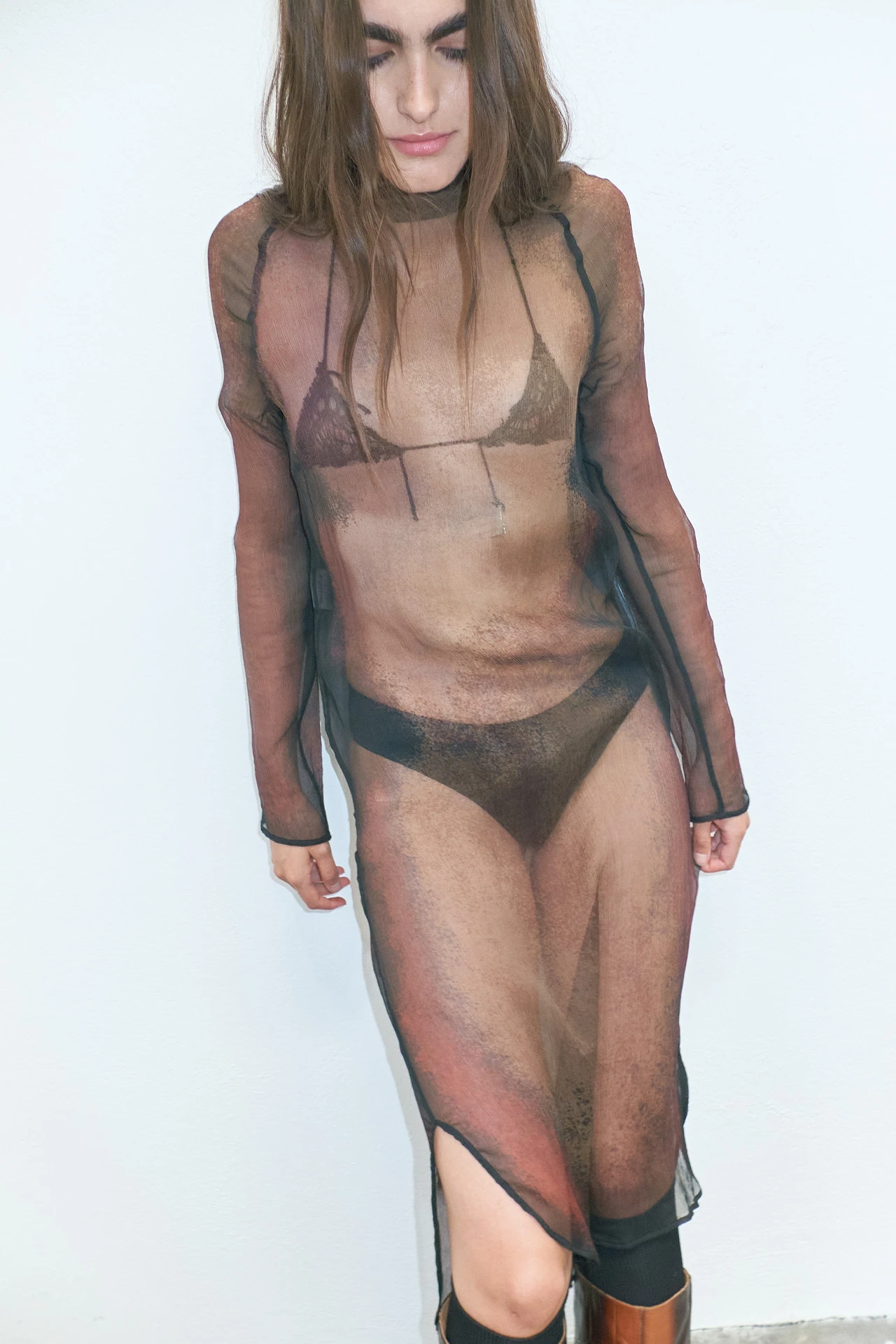 Through the medium of a sheer mid-length, long-sleeved, and high-necked dress, transformative bodily forms are laid bare across Caetana, blurring the lines of where the body ends and its surroundings begin.