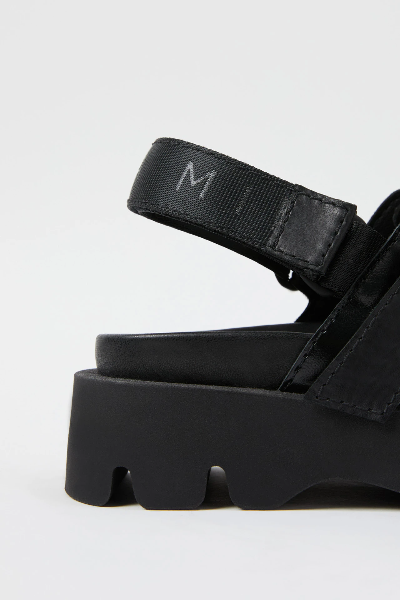 Clive is a pseudo-sporty mule-clog. His upper is robust, formed of shiny box cow leather and featuring a central seam to the front that’s been part sttiched and part rubberised. A top strap runs across said upper to meet a soft-touch rubberised plastic buckle, with a velcro branded nylon strap protruding from its back to hold Clive’s wearer comfortably in position. His rubber sole is grounded in curved cleating to form a wave effect. Slip Clive on, and you’ll find a raised dimple massage sole within. Surprise!
