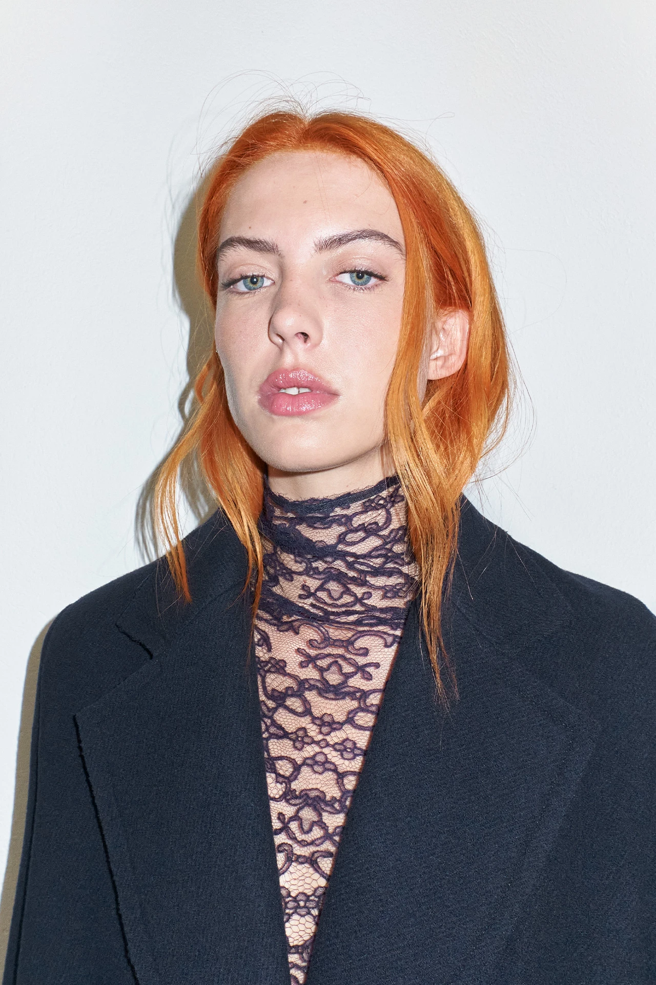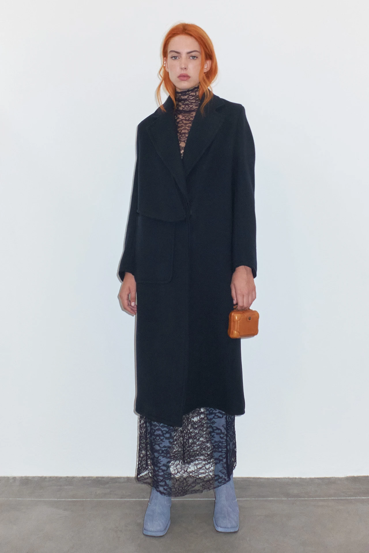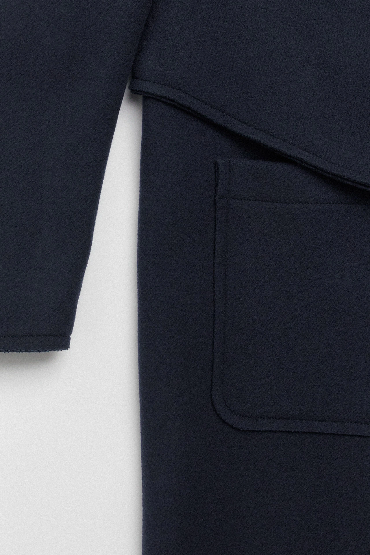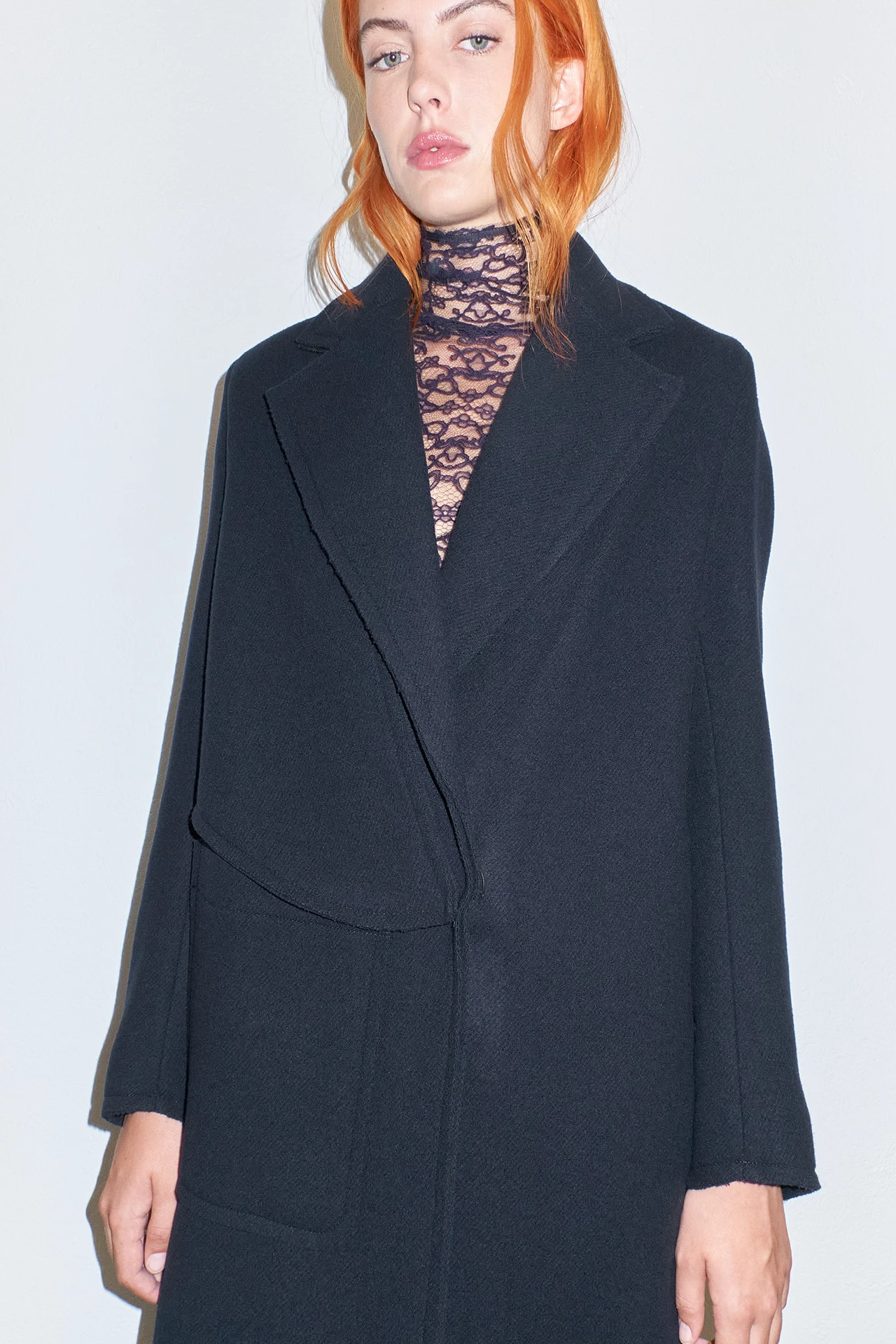 Constanta is a classic, sumptuous wool mid-length navy peacoat. She’s got a slightly oversized collar, with an overlaid swooping flap joining from the right shoulder down to the centre. She’s got one square pocket to the front and has a slightly androgynous boxy fit.
