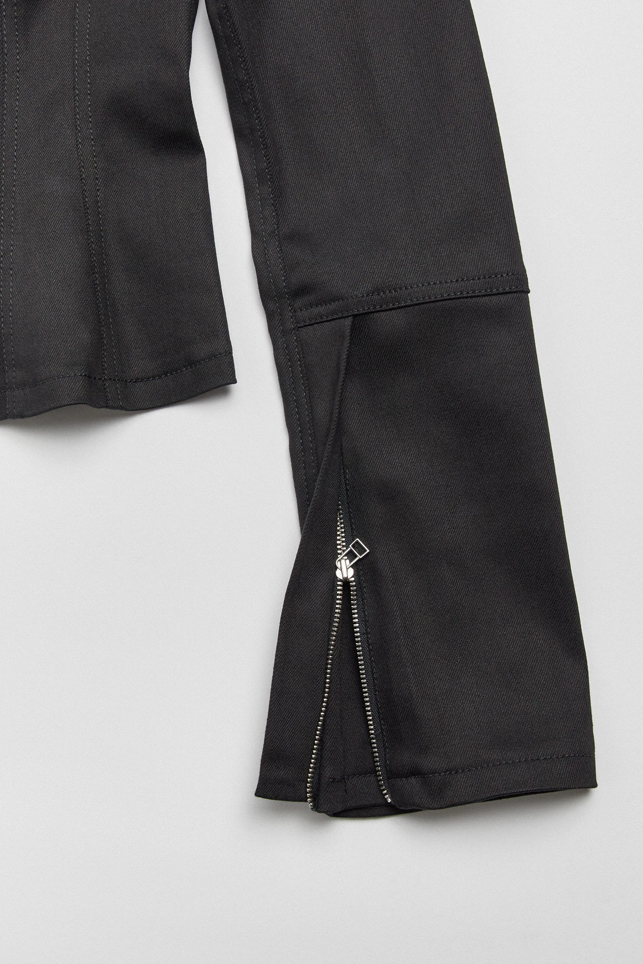 Channeling new romanticism for the modern age, Costa is a black corset shirt with all the trimmings. She cinches in at the waist, following the curved lines of the body, with clasps running from the collar down to the hem. Her long sleeves are finished with zips, which when undone allow them to flare out for a more dramatic effect.