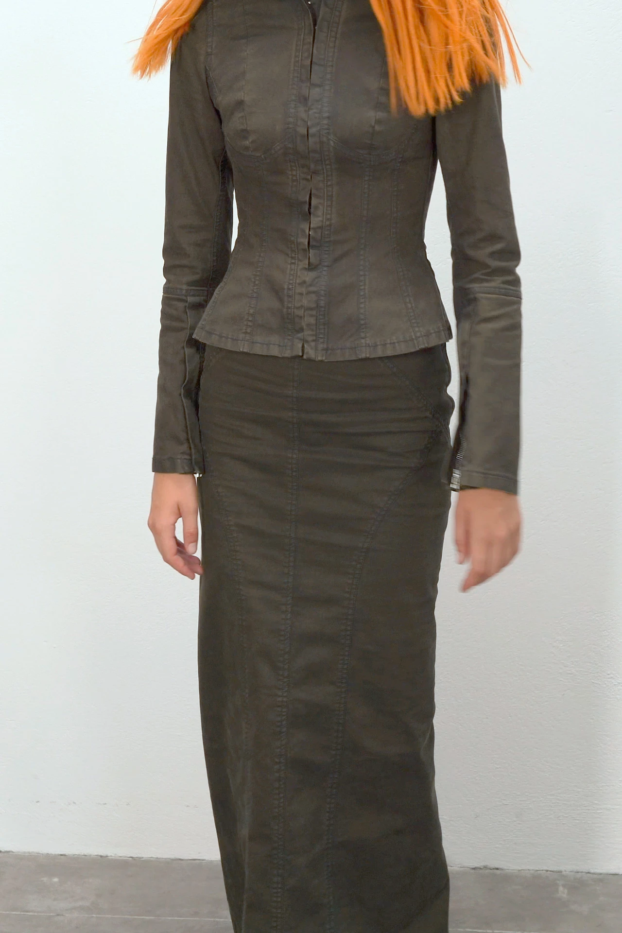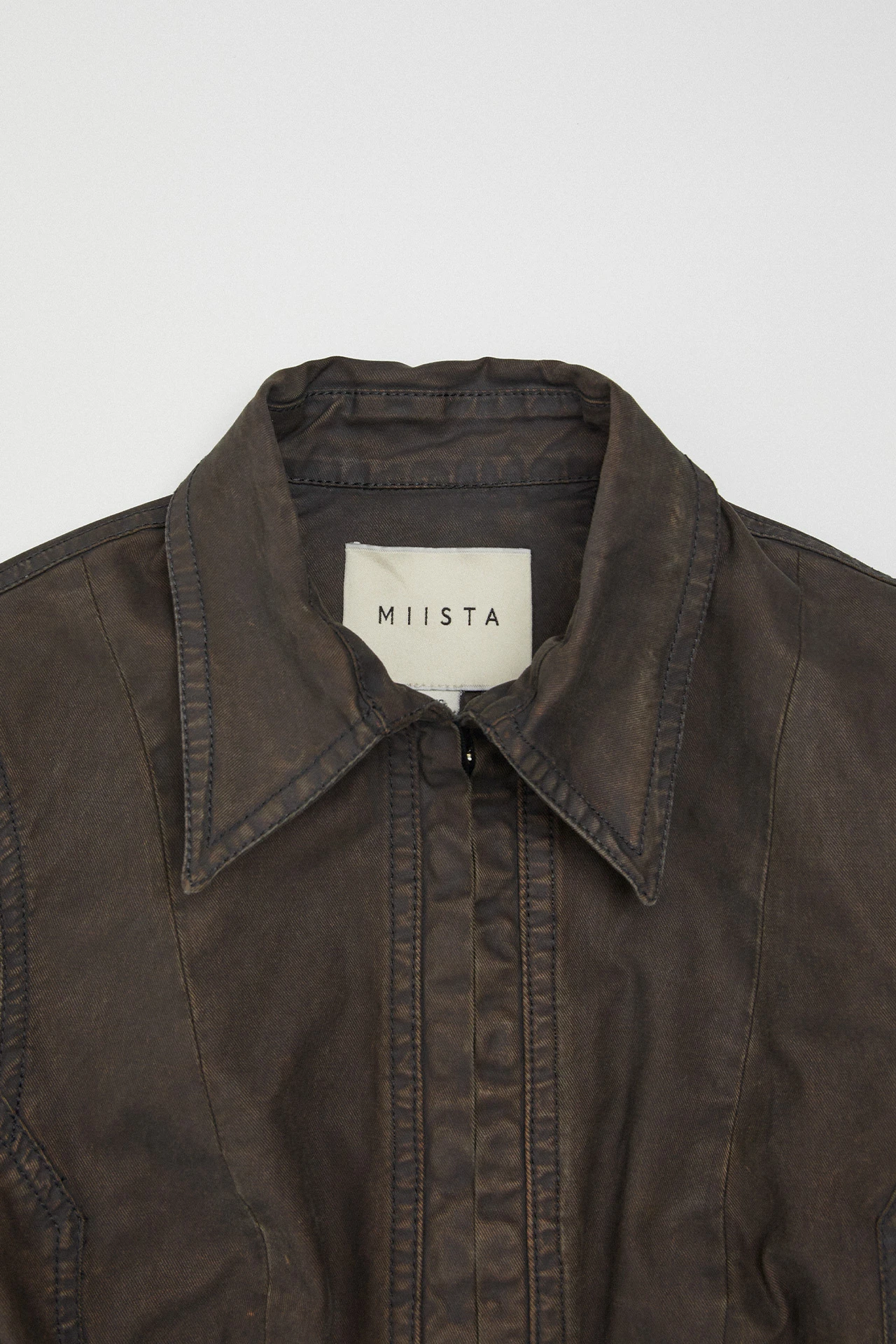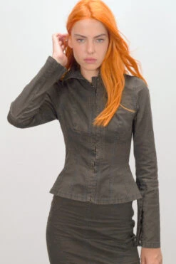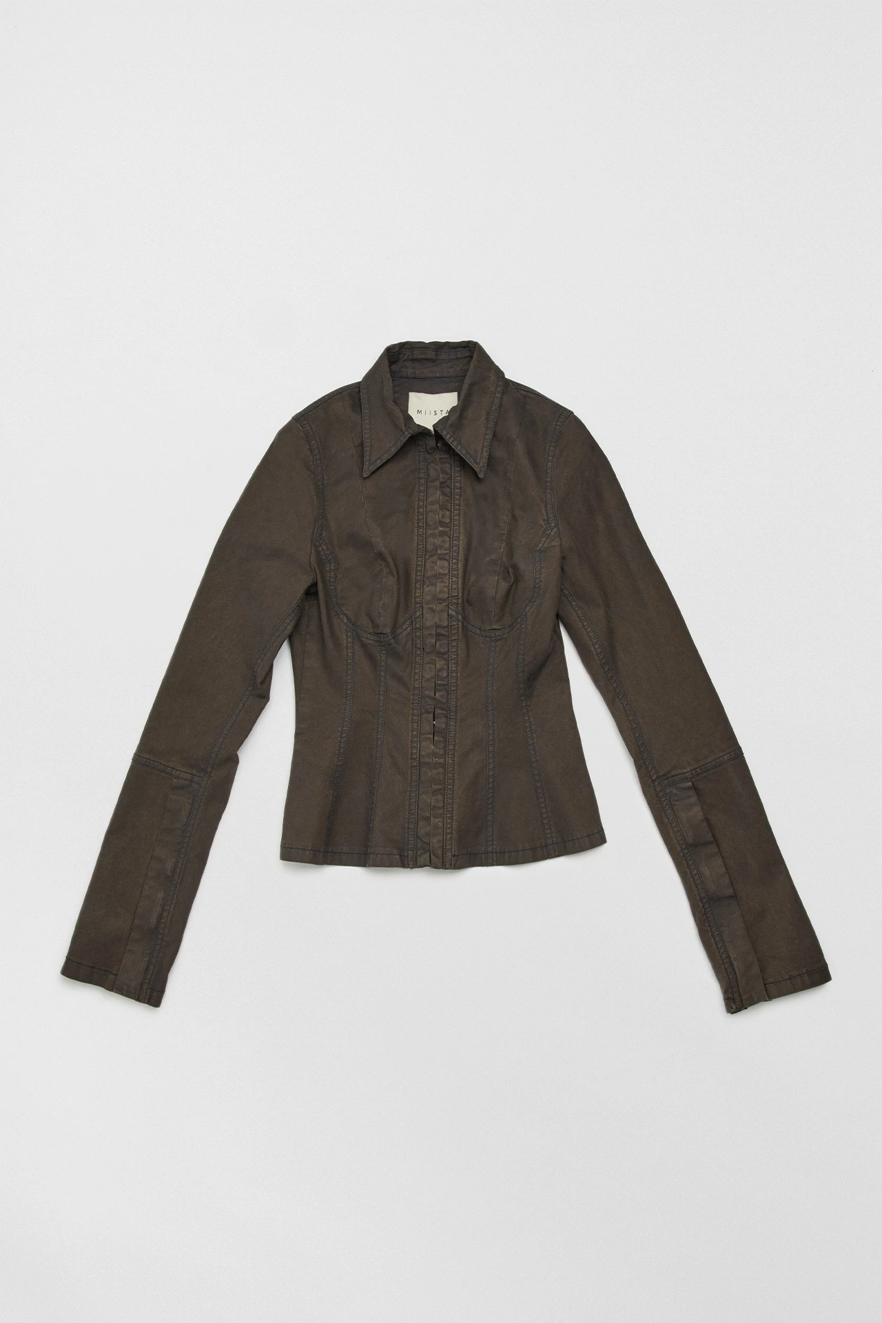 Channelling new romanticism for the modern age, Costa is a brown corset shirt with all the trimmings. She cinches in at the waist, following the curved lines of the body, with clasps running from the collar down to the hem. Her long sleeves are finished with zips, which when undone allow them to flare out for a more dramatic effect.