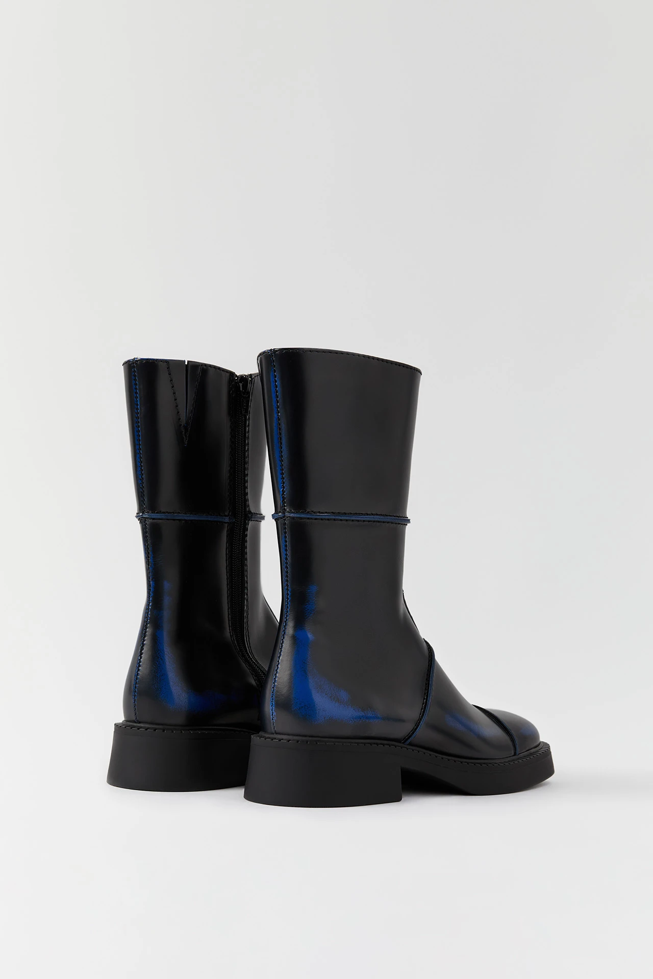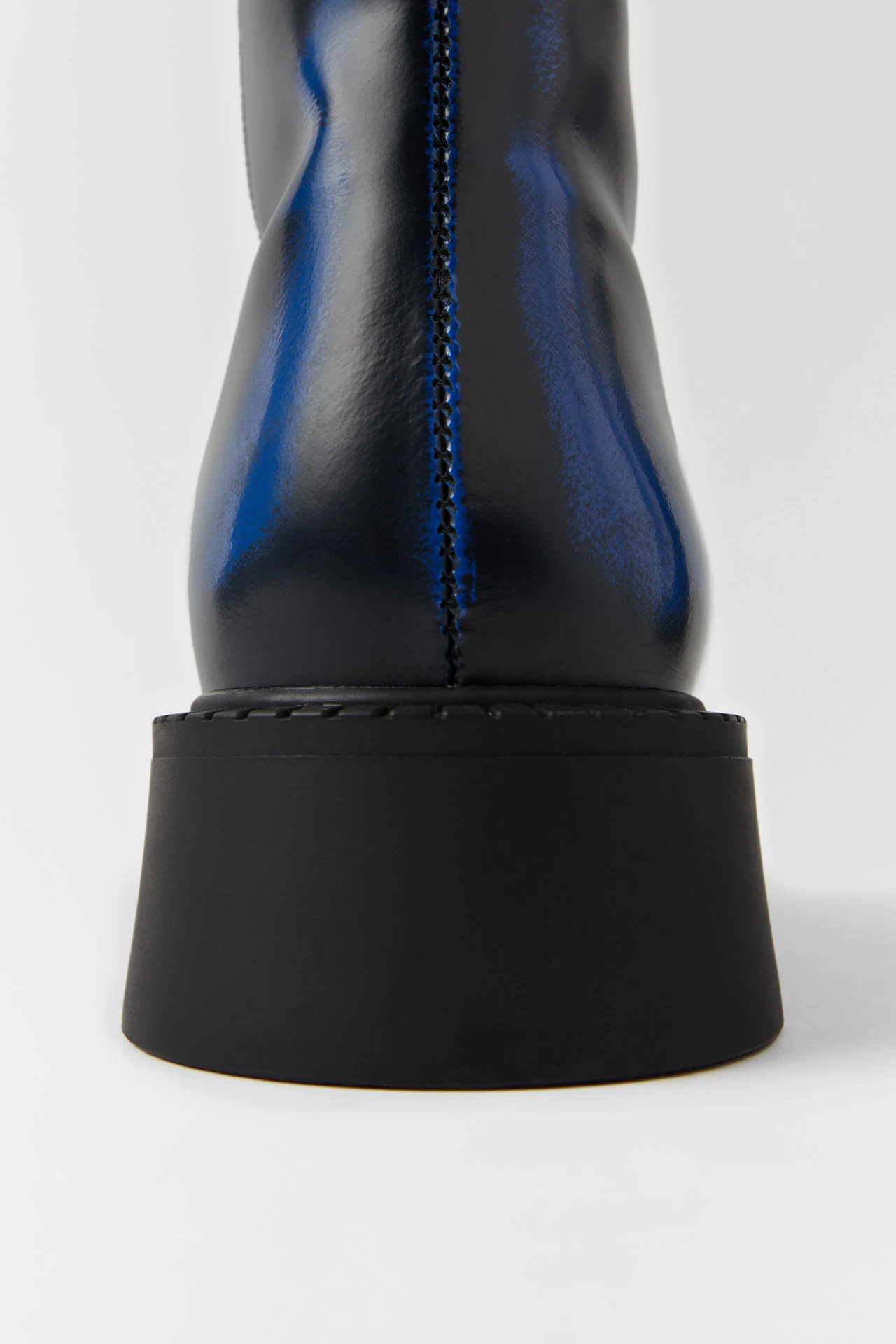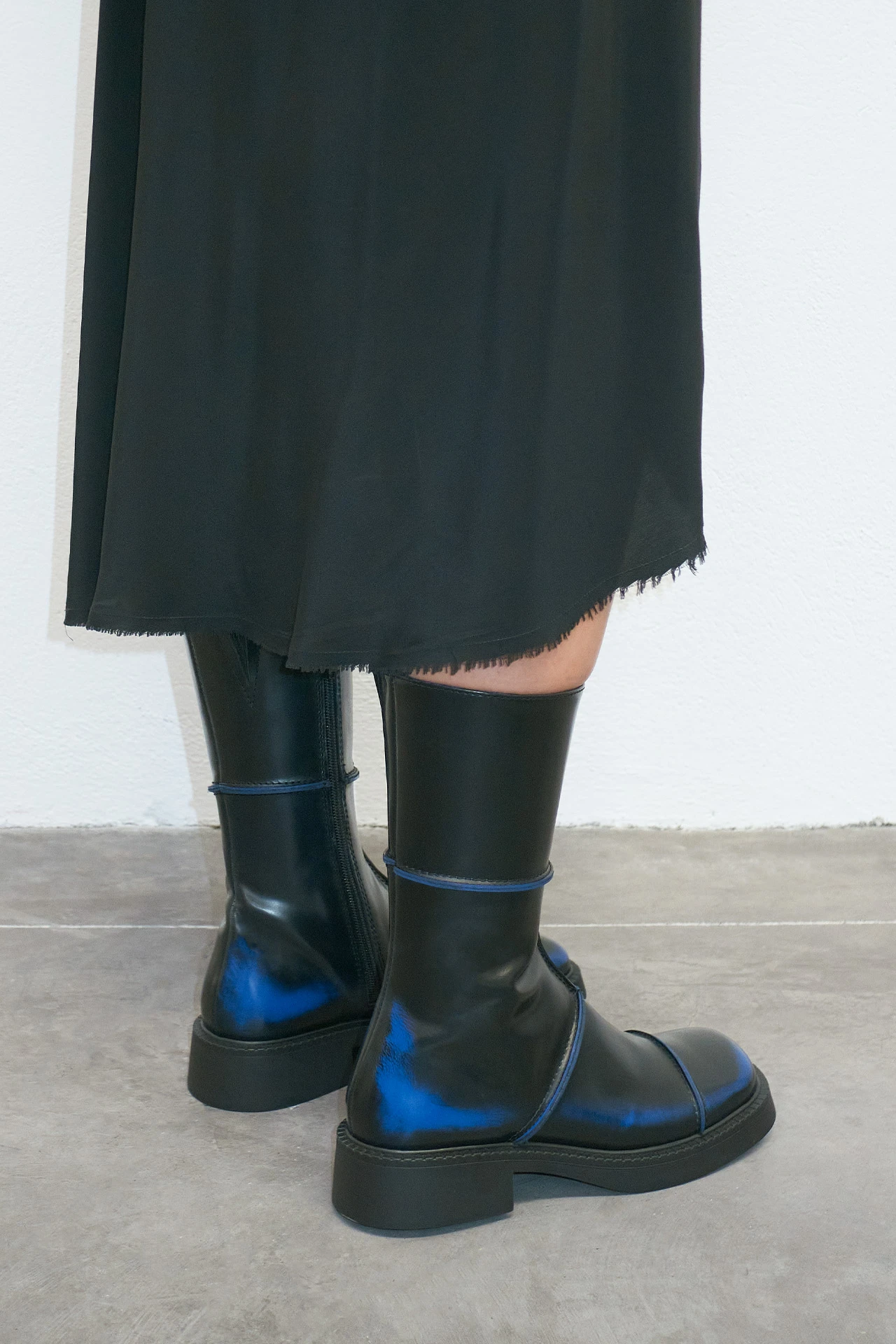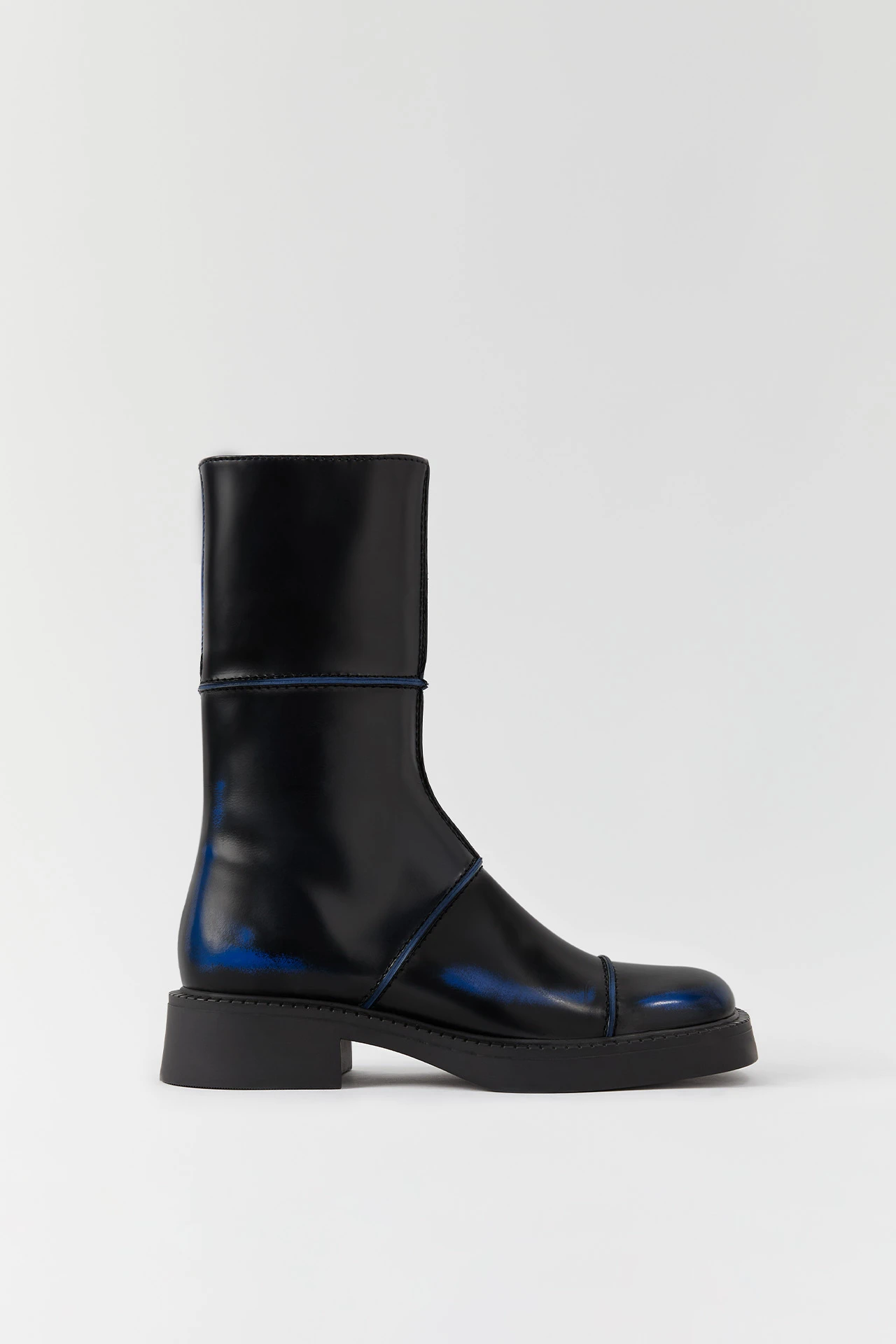Dahlia reveals more than first meets the eye. With an ultra comfortable flat rubber sole and square toe, she’s built from a series of black leather panels brought together with statement blue seams. Towards the toe, sides, and heel, the leather has been hand-brushed to reveal flashes of that same blue for a subtle distressed effect.