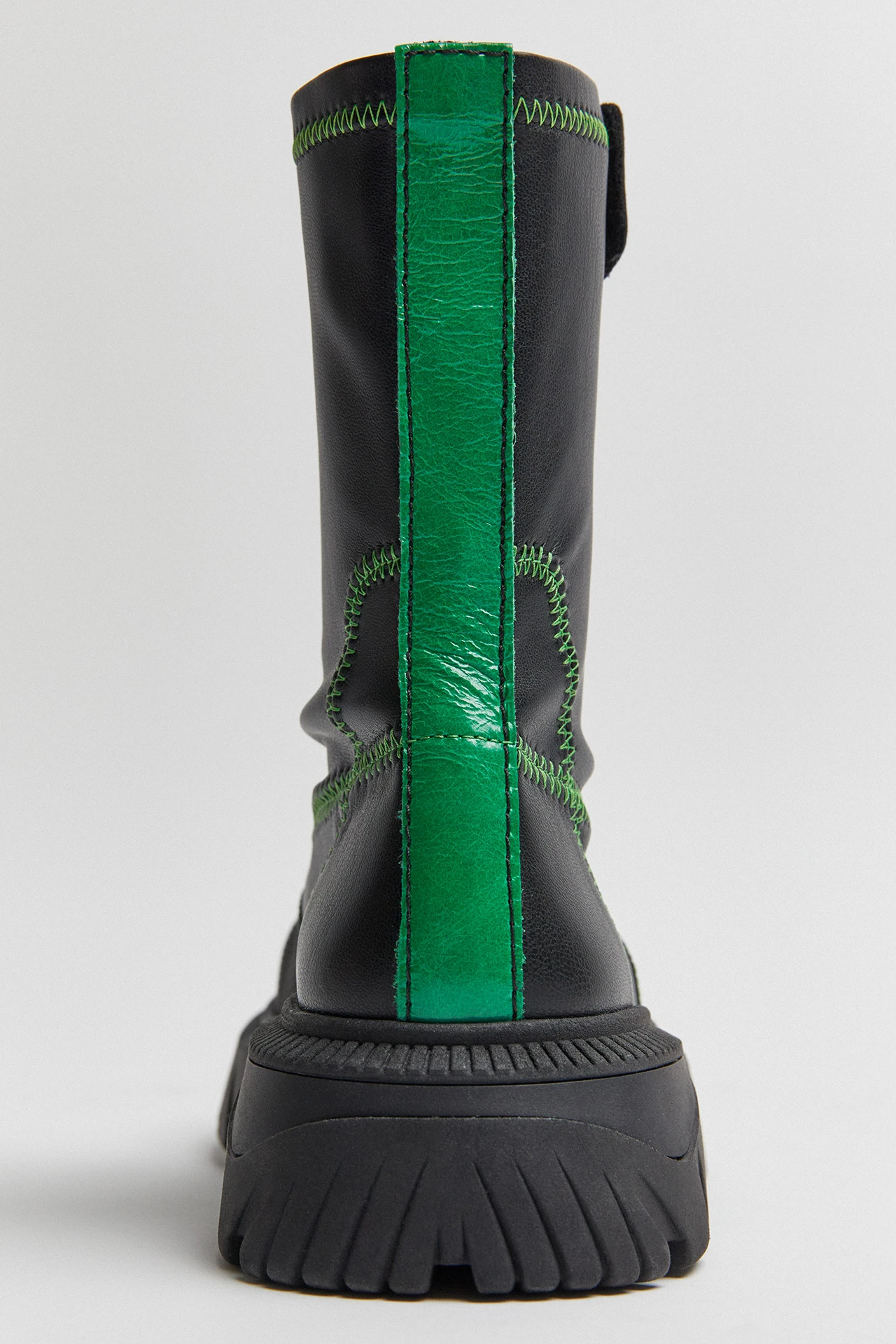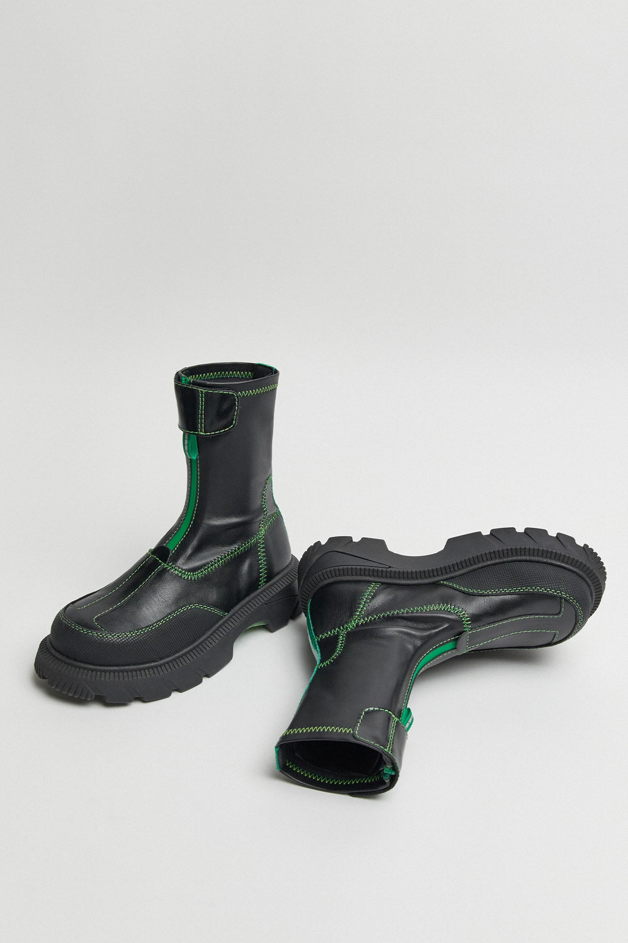 Danica is ready for anything. She’s a black ankle boot featuring a rubberized black centre zip, velcro strap, textured rubber panels, and contrasting zig-zag green stitching all over. And to top it all off, she’s got a heavy duty rubber tread sole for supreme comfort through thick and thin.