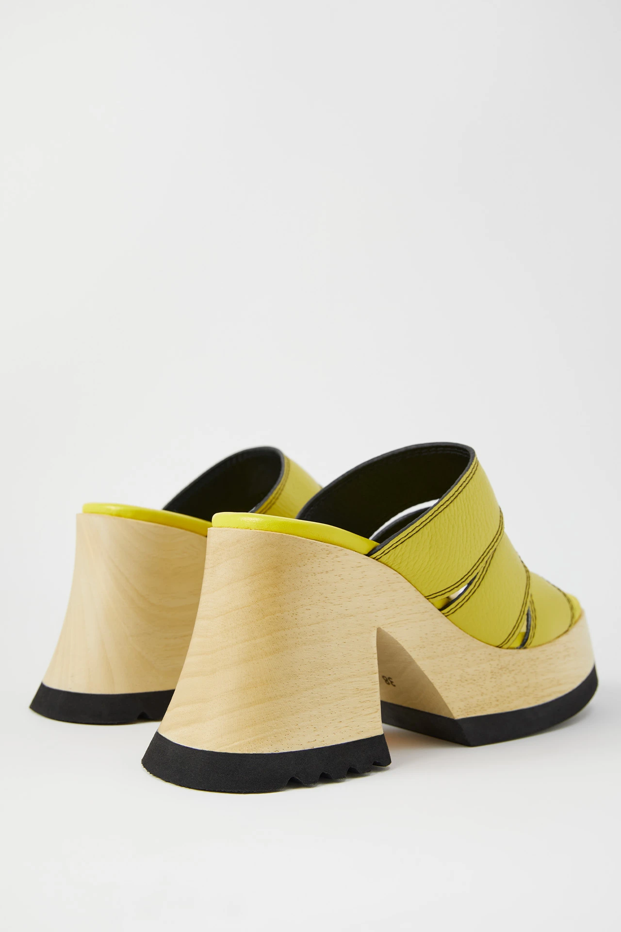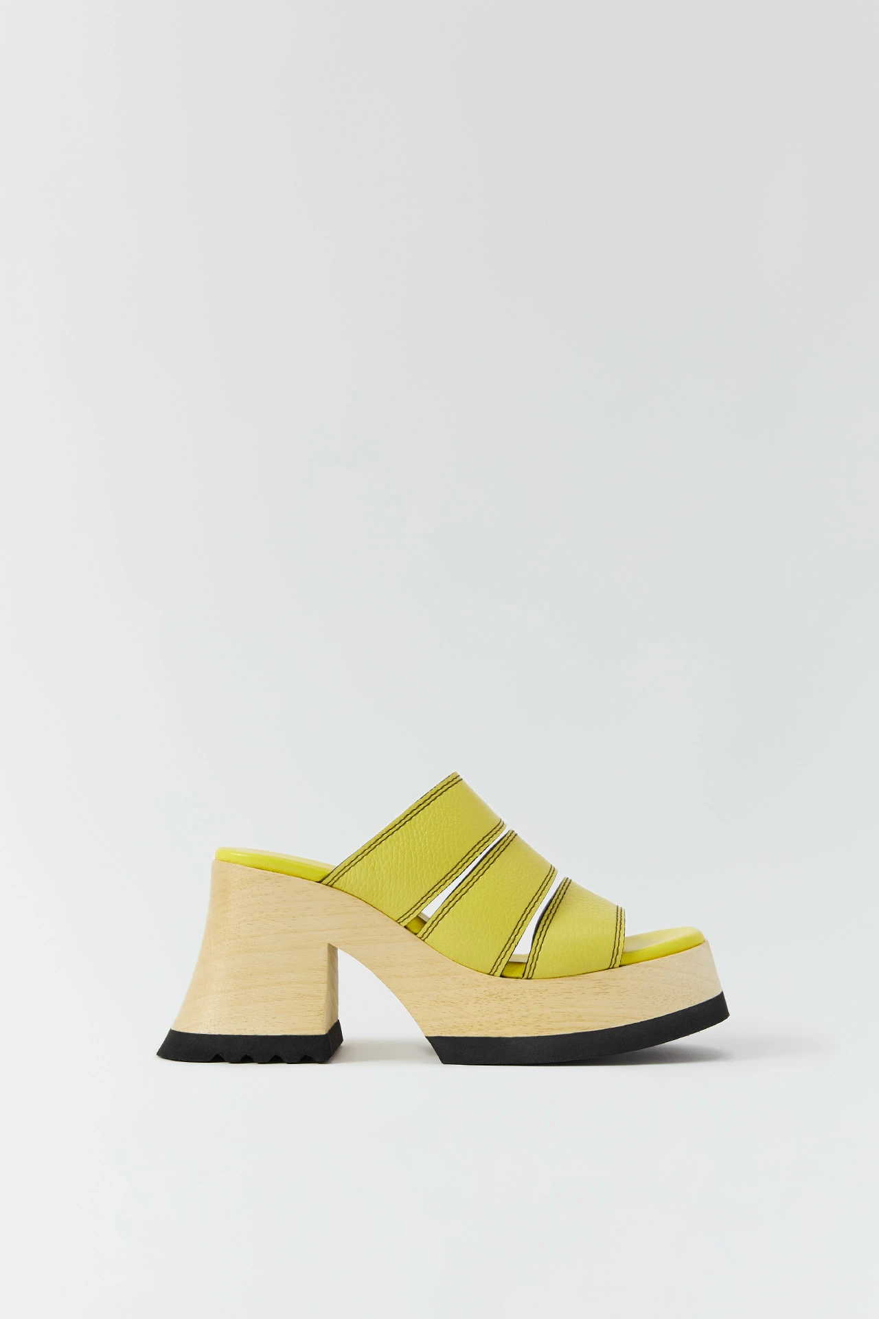 Meet Deanne. Broadly identifying as a heeled mule-come-sandal, her box shiny black leather upper swoops downwards – featuring a central rubberised seam for added detail – and sits atop a real sustainable wood sole finished with a rubber front sole and heel piece. The heel arches out backwards while the platformed toe kicks slightly forwards, forming a statement silhouette that wouldn’t look out of place in the alphabet of a seventies-style font.