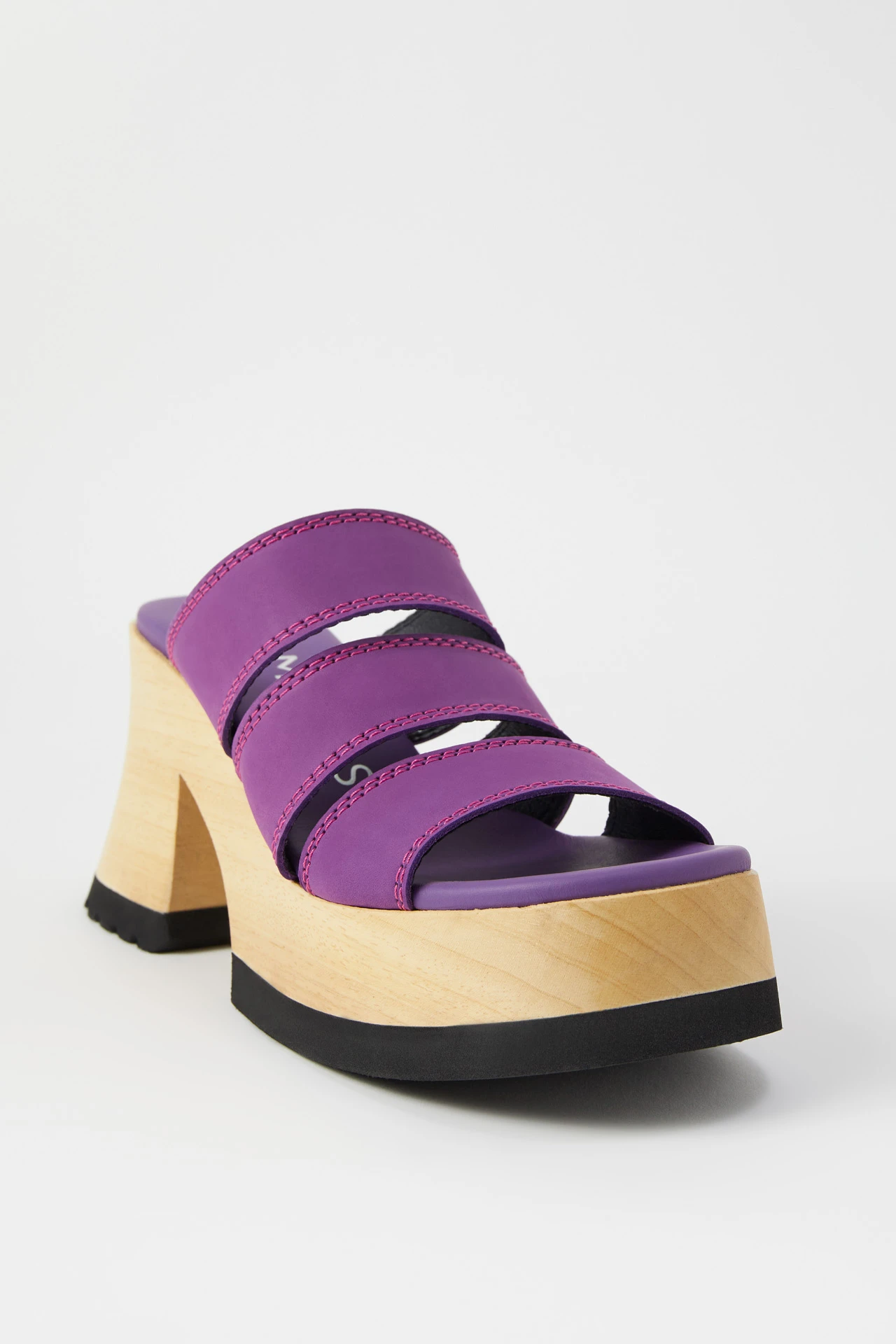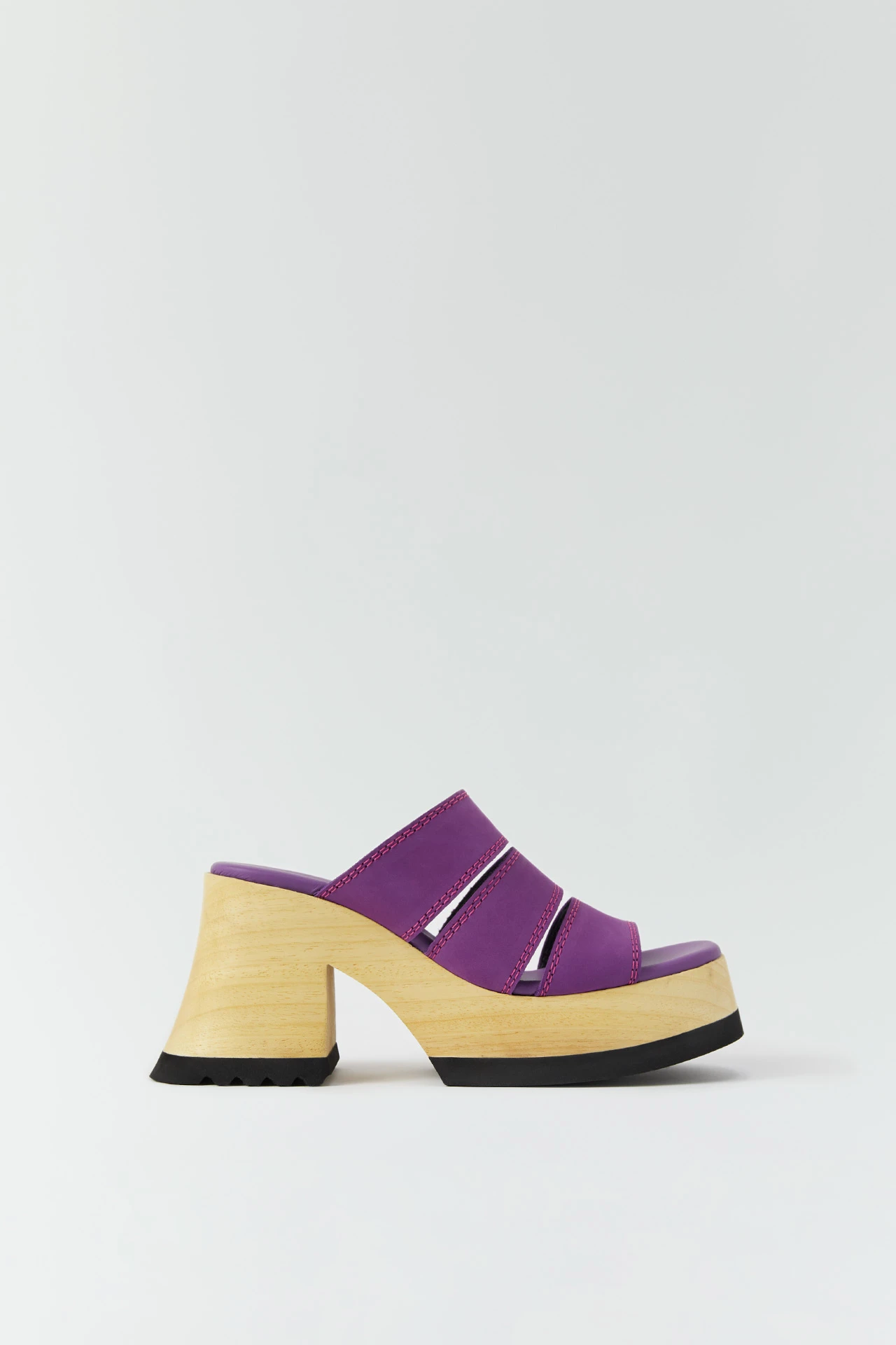 Meet Deanne. Broadly identifying as a heeled mule-come-sandal, her box shiny black leather upper swoops downwards – featuring a central rubberised seam for added detail – and sits atop a real sustainable wood sole finished with a rubber front sole and heel piece. The heel arches out backwards while the platformed toe kicks slightly forwards, forming a statement silhouette that wouldn’t look out of place in the alphabet of a seventies-style font.