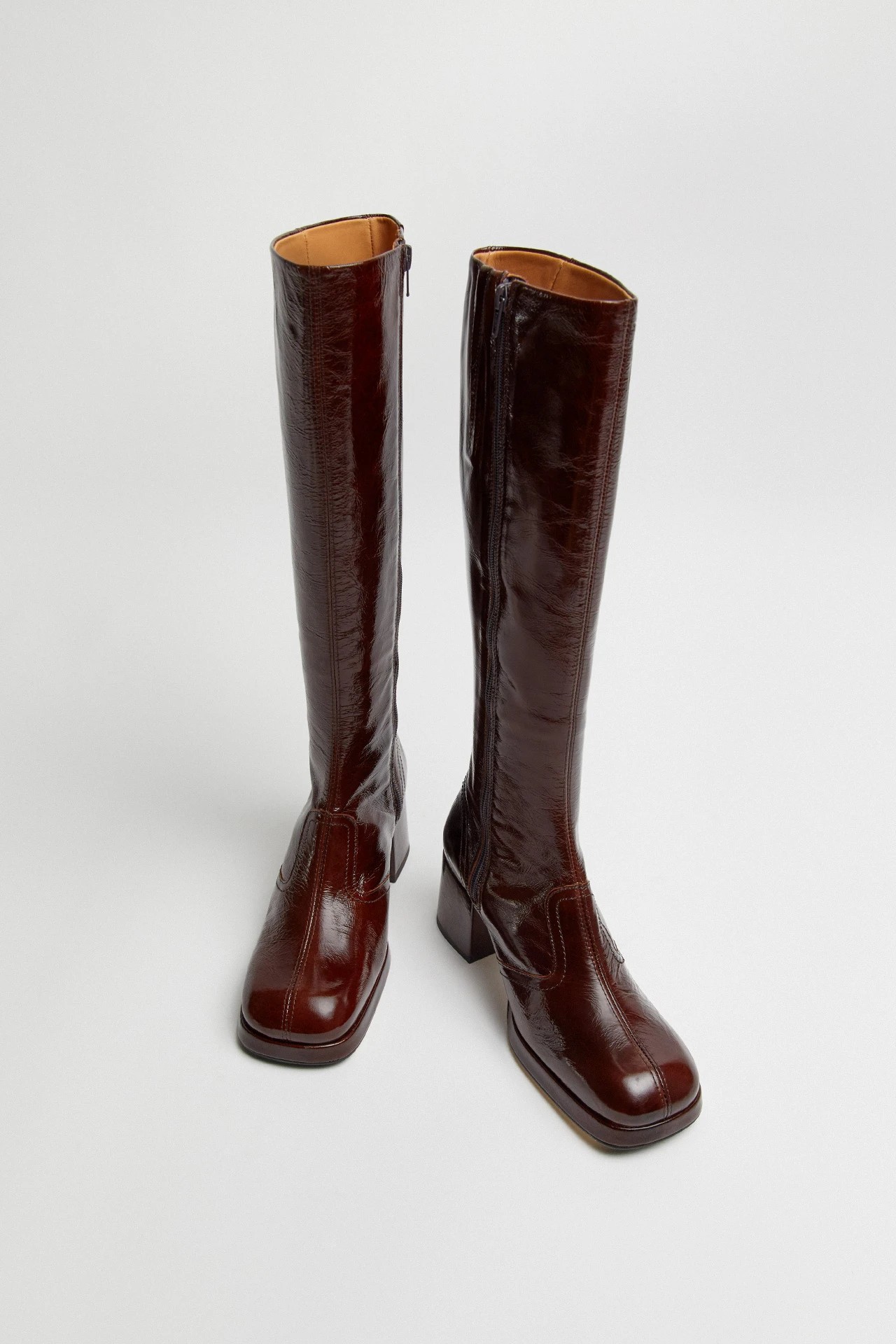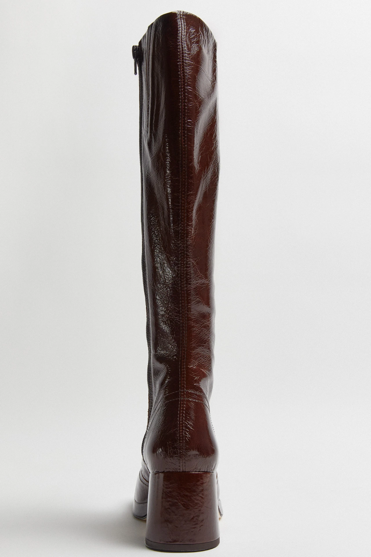 We think of Donna as Cass’ taller, bolshier older sister. Her paneled upper is formed of crinkled brown leather and joined with double stitching, reaching right up the calf for a tall just-below-the-knee finish. We’d categorize Donna’s heel as high, but her platform sole counters this, serving up a lower-heel feel to keep you strutting til dawn.