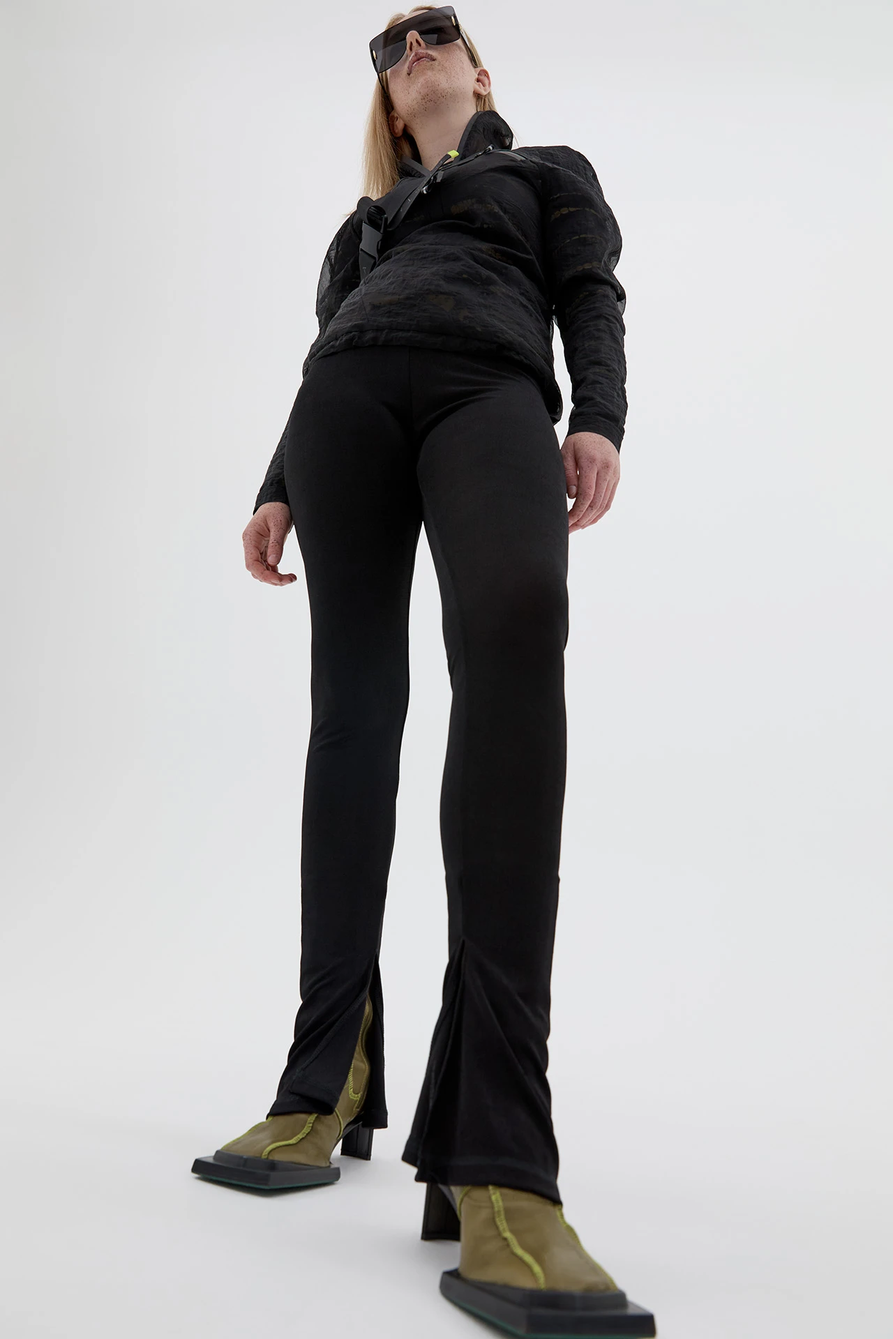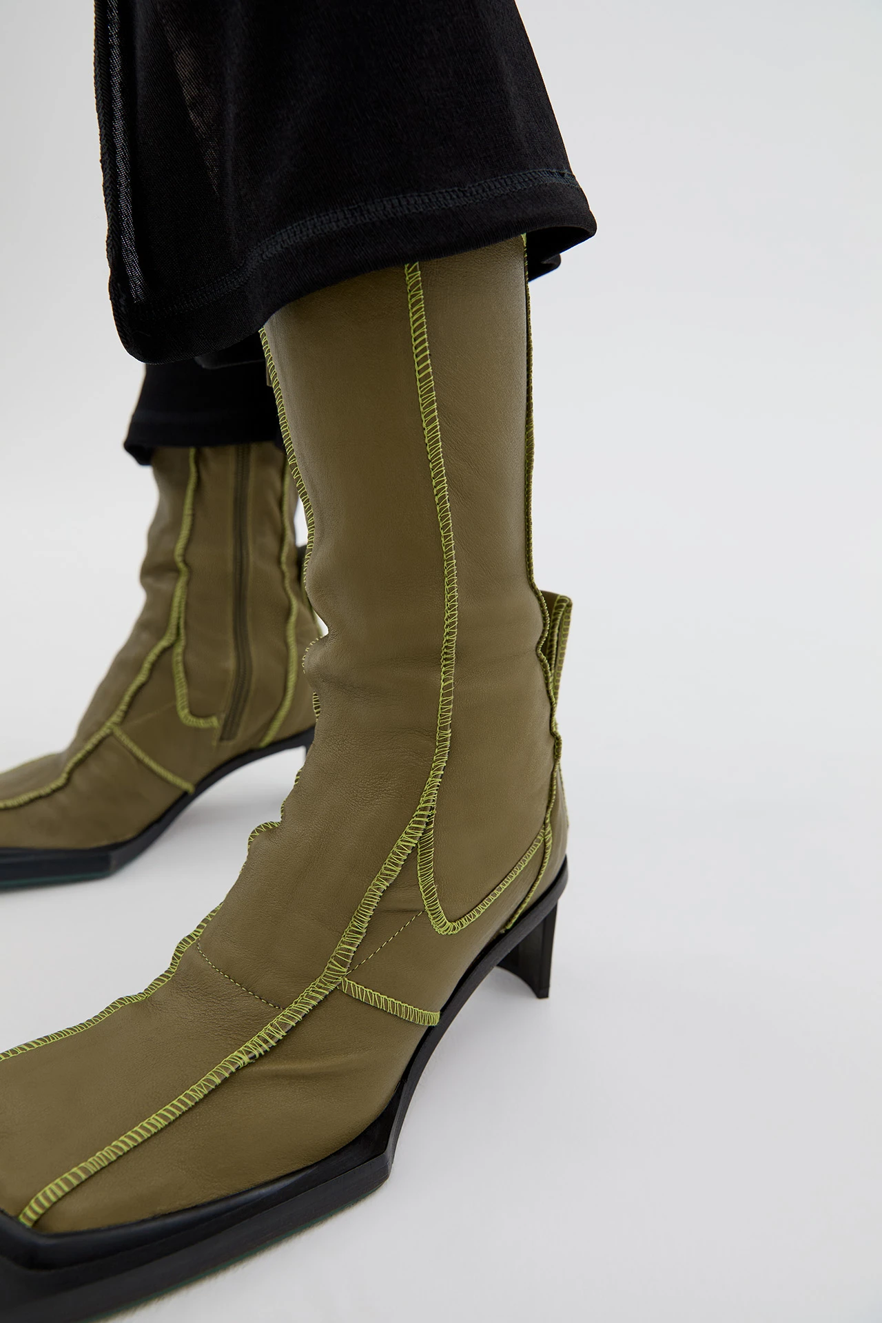 Try and figure out Eimi: a boot made up of a complex patchwork of panels handcrafted from soft khaki stretch nappa leather, finished with contrast neon lime overlock stitching. Featuring our signature ultra-thin straight heel and a black oversized angular rubberised sole that extends around the toe.
