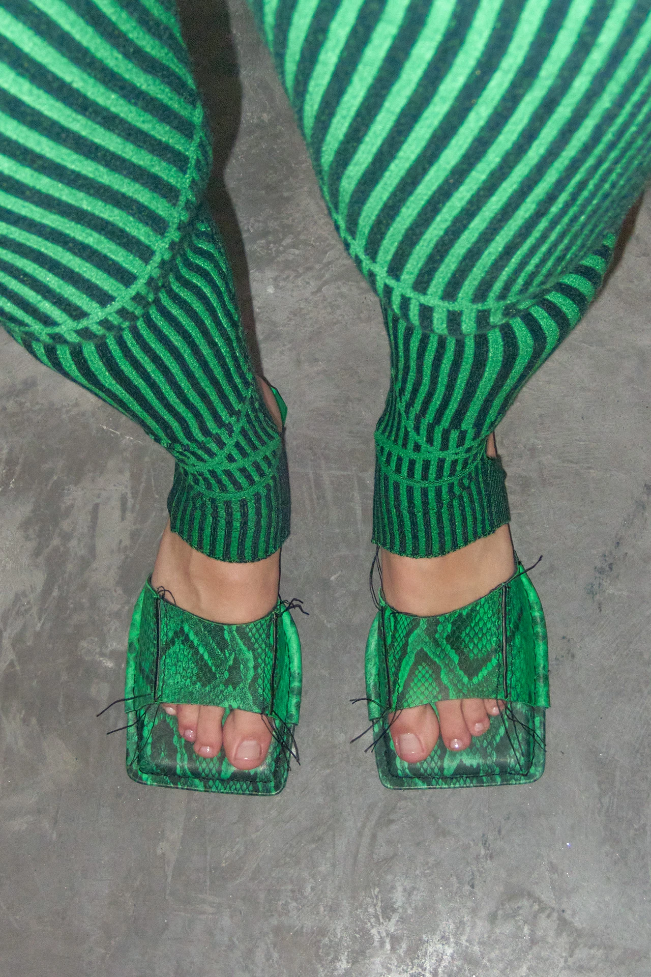 A fabulous Icon, is Fifi. But with her low-lying nature, she’ll keep you grounded too. In opposition to all things archetypal, her short rubberized painted heel inverts the classic footwear format – finished with an almost-flat drop-off at the back, and rounded to the front. Her green snake skin effect upper lands in panelled sheep leather, bound with contrasting black rubberized wax edging and overlock stitching – uncut to create decorative loose threads that flutter as you move. No Icon is complete without memory foam insoles and vegetable tan cow leather lining for enhanced comfort, plus a rubber heel cap and rubber-invected toe protecting its vegetable tan cow leather sole. Heel Height 3cm This style is true to size. We recommend selecting your standard European size. Designed in London | Handcrafted in Spain