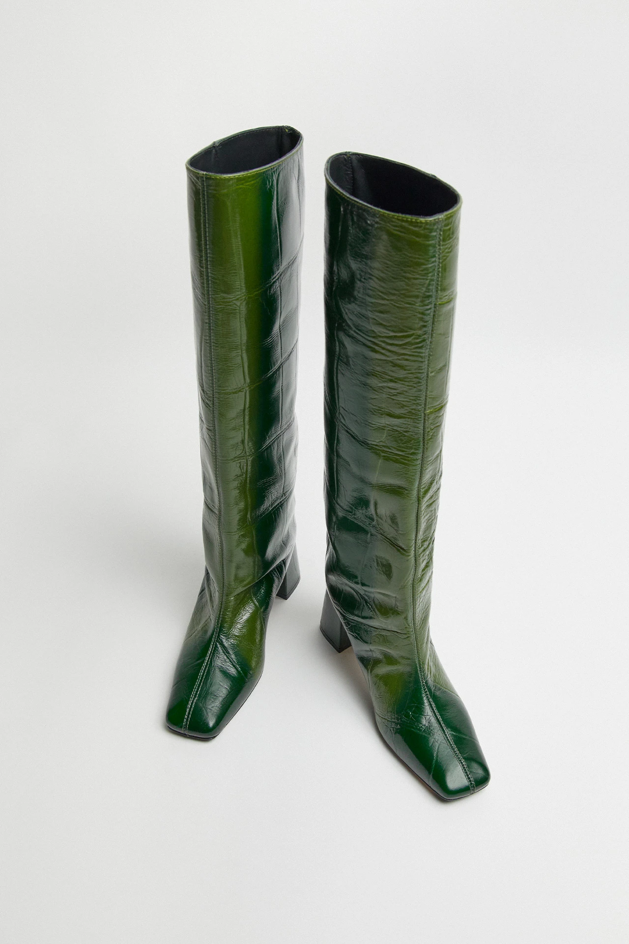 Tall and imposing, Finola is a knee-high, wide-leg boot crafted from textured calf leather that transforms from dark to lime green. Featuring a block heel and elongated toe, Finola is finished with memory foam insoles, calf leather lining, and leather outsoles.