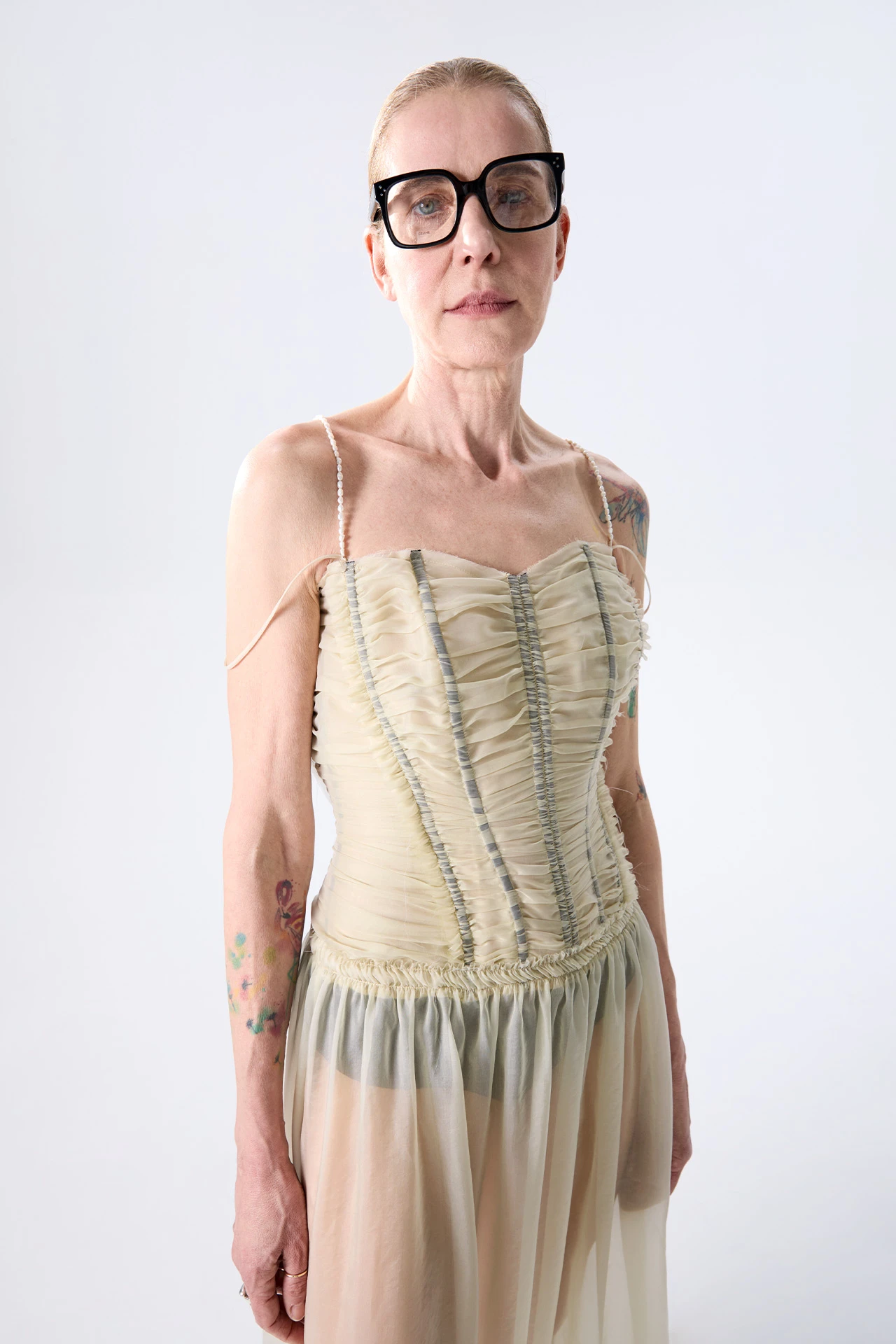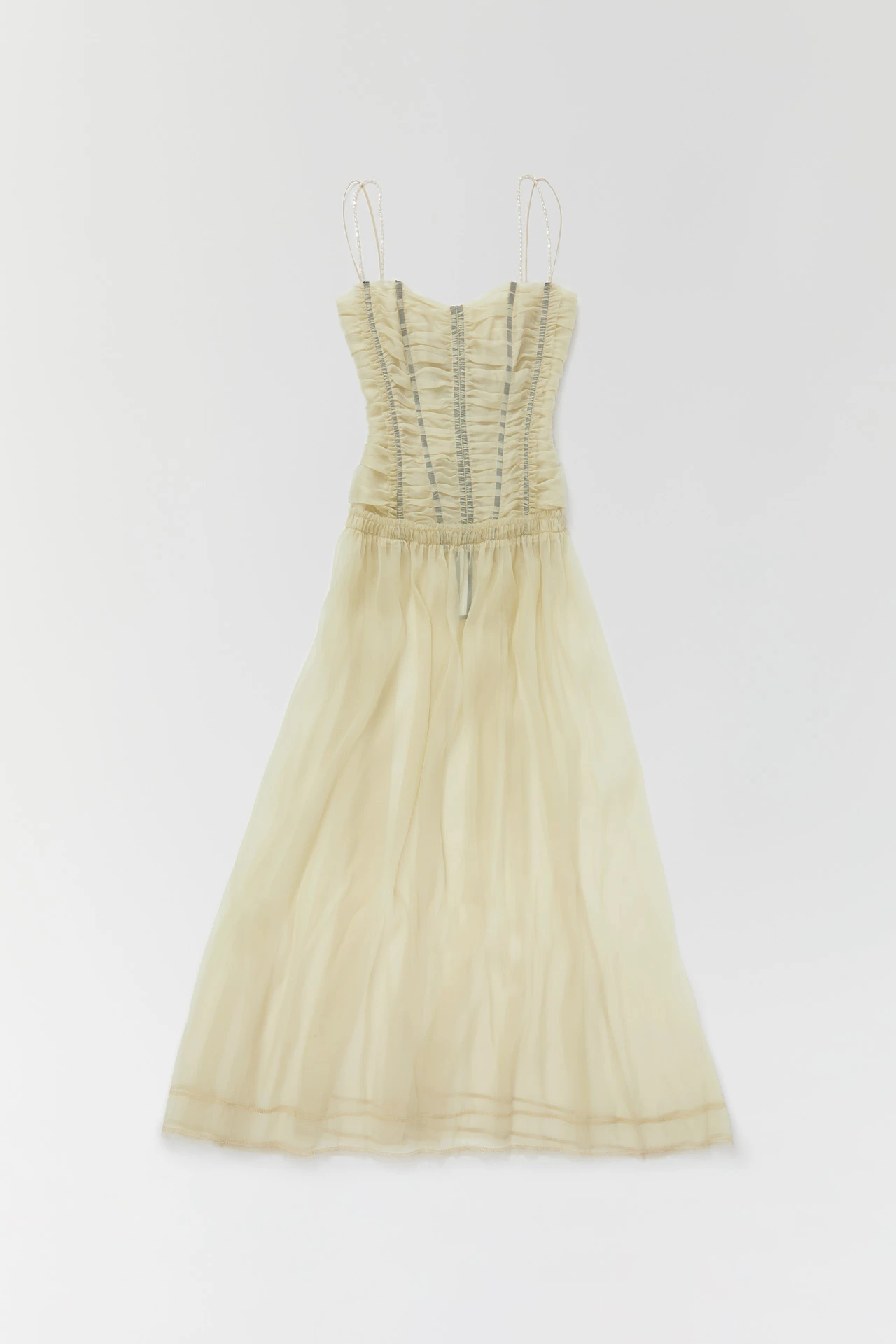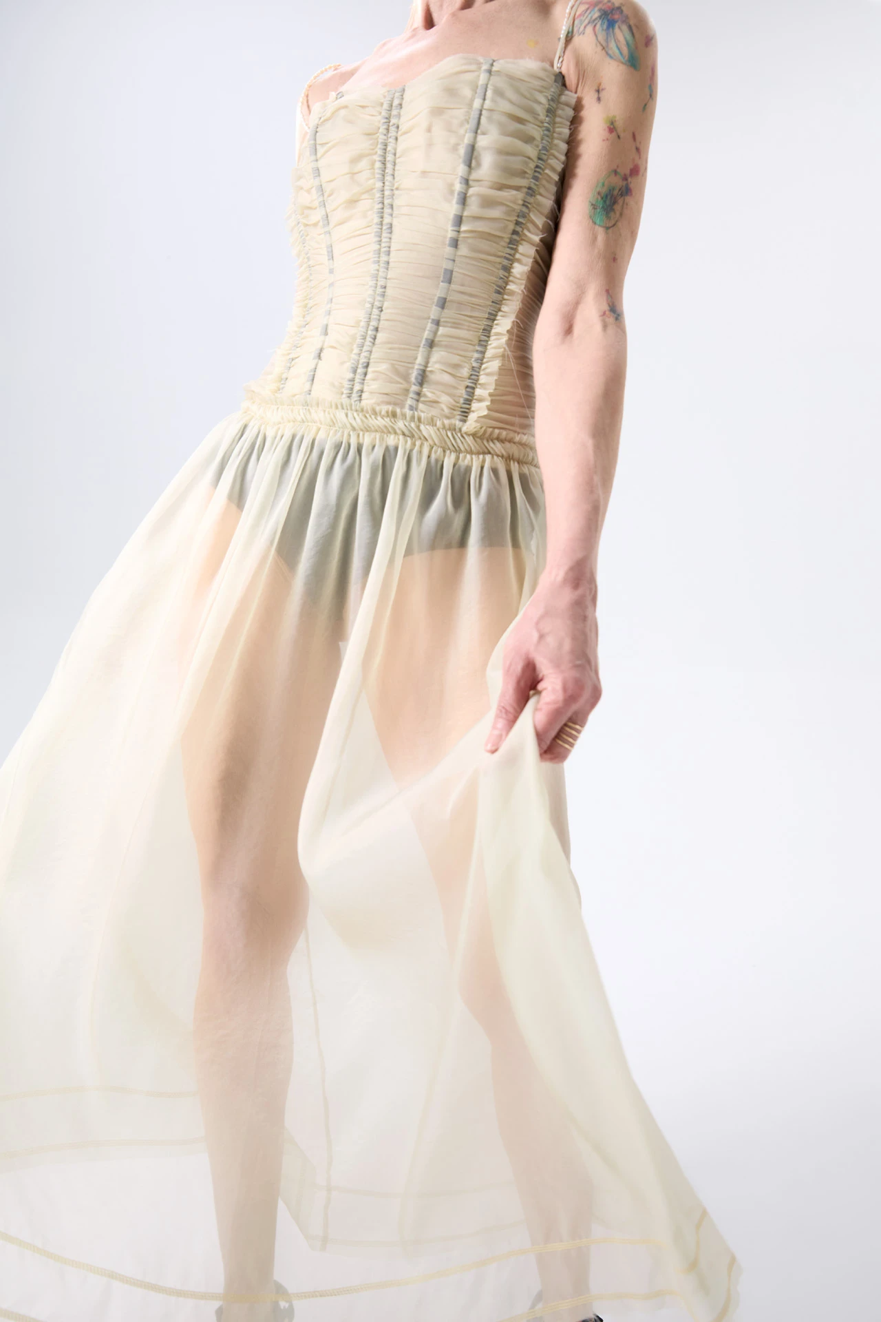Franca takes the floor. She’s a corset dress in elegant sheer silk organza – her ruched, pleated body has been gathered by hand and carefully stitched to join the structured boning. Ultra fine straps arch the shoulders and tie across the back, with secondary beaded straps on hand to be worn on or off the shoulder. Her transluscent skirt joins the party at the hips, flowing down to the ankle and finished with overlock stitched detailing just above the hemline.