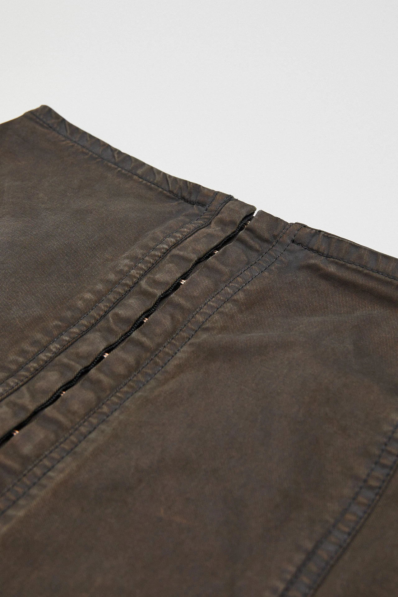 Gil is a staple miniskirt that’s ready to rough and tumble. Materially robust, she’s formed of biker-style panelling with overt seams, joining in the middle with a series of metal clasps that run from her waistline to her hem.