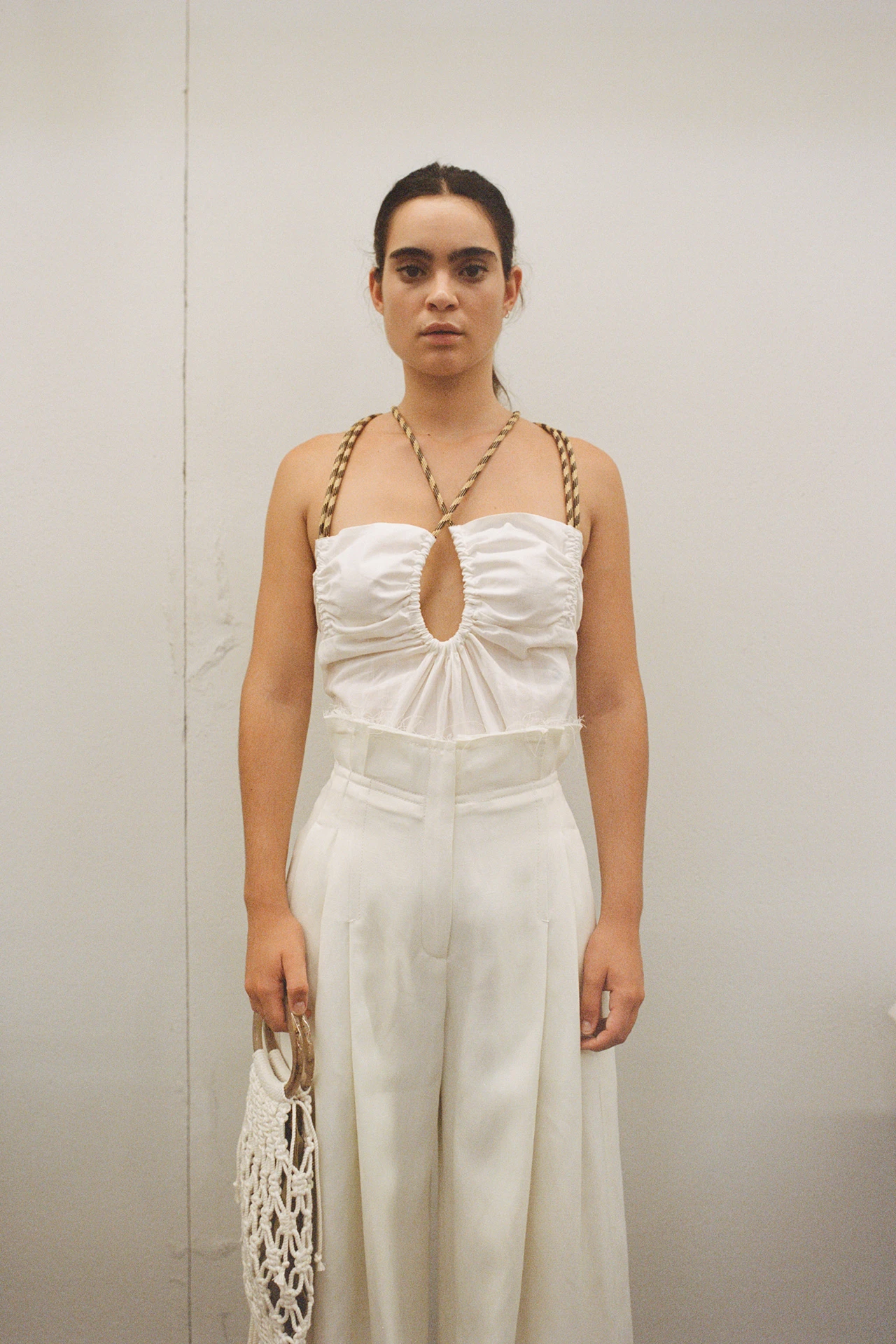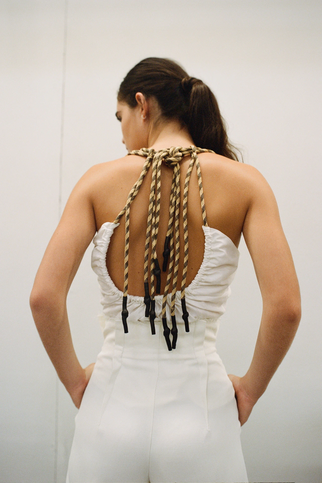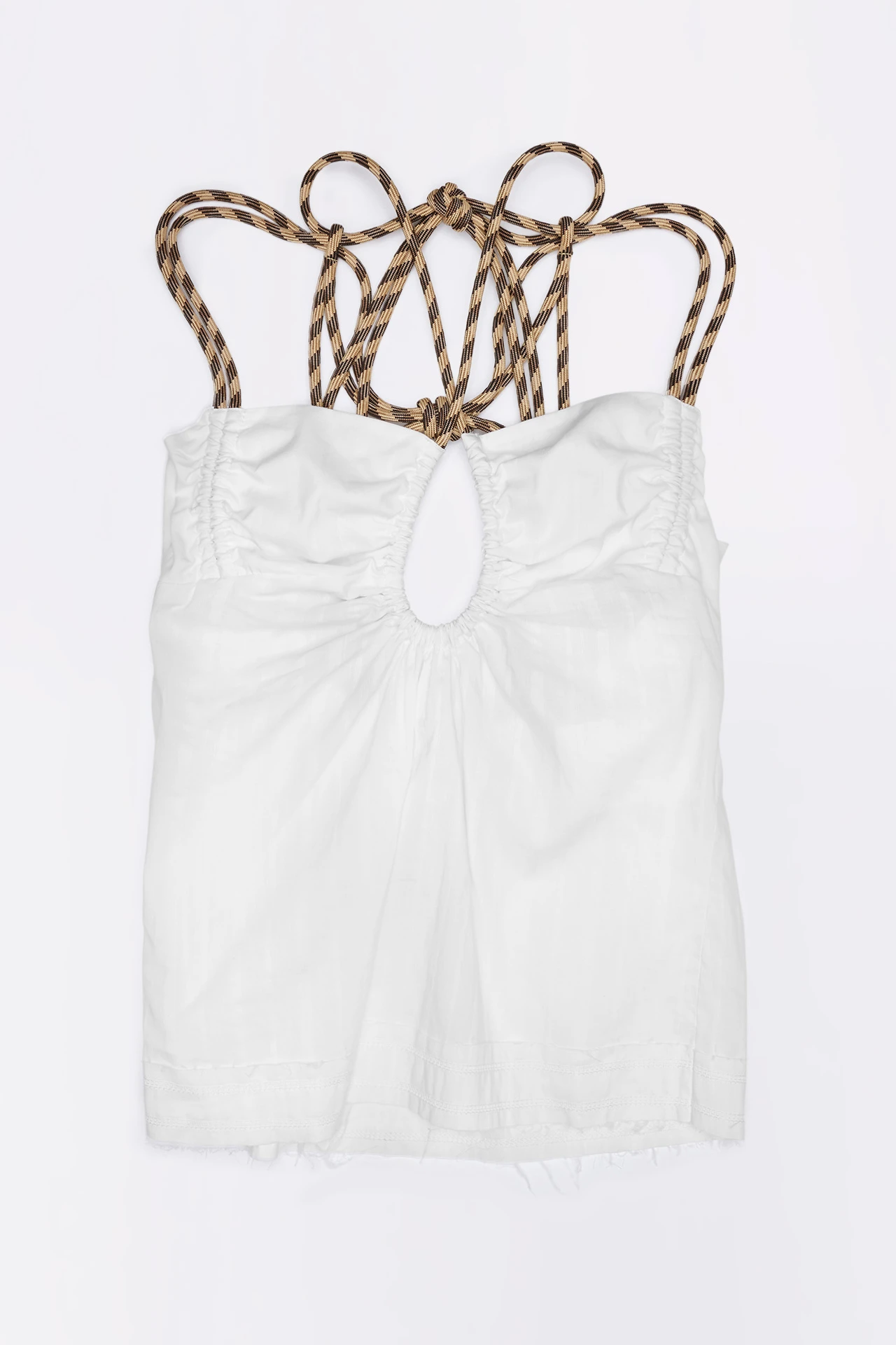 Gloria is a keyhole top crafted from a lightweight white cotton that is gathered at the bust by hiking laces that tie at the back creating a striking pattern of adjustable straps. Polished meets undone in the fabric which is woven with subtle tonal stripes and finished with raw edges and overlock stitching. Hiking lace straps are finished with a knot coated in rubberised tubing. This style is true to size. We recommend selecting your standard European size. Our model Angela is 175cm tall, size UK8/EU36/US4 and wears a size S. Designed in London | Handcrafted in Spain