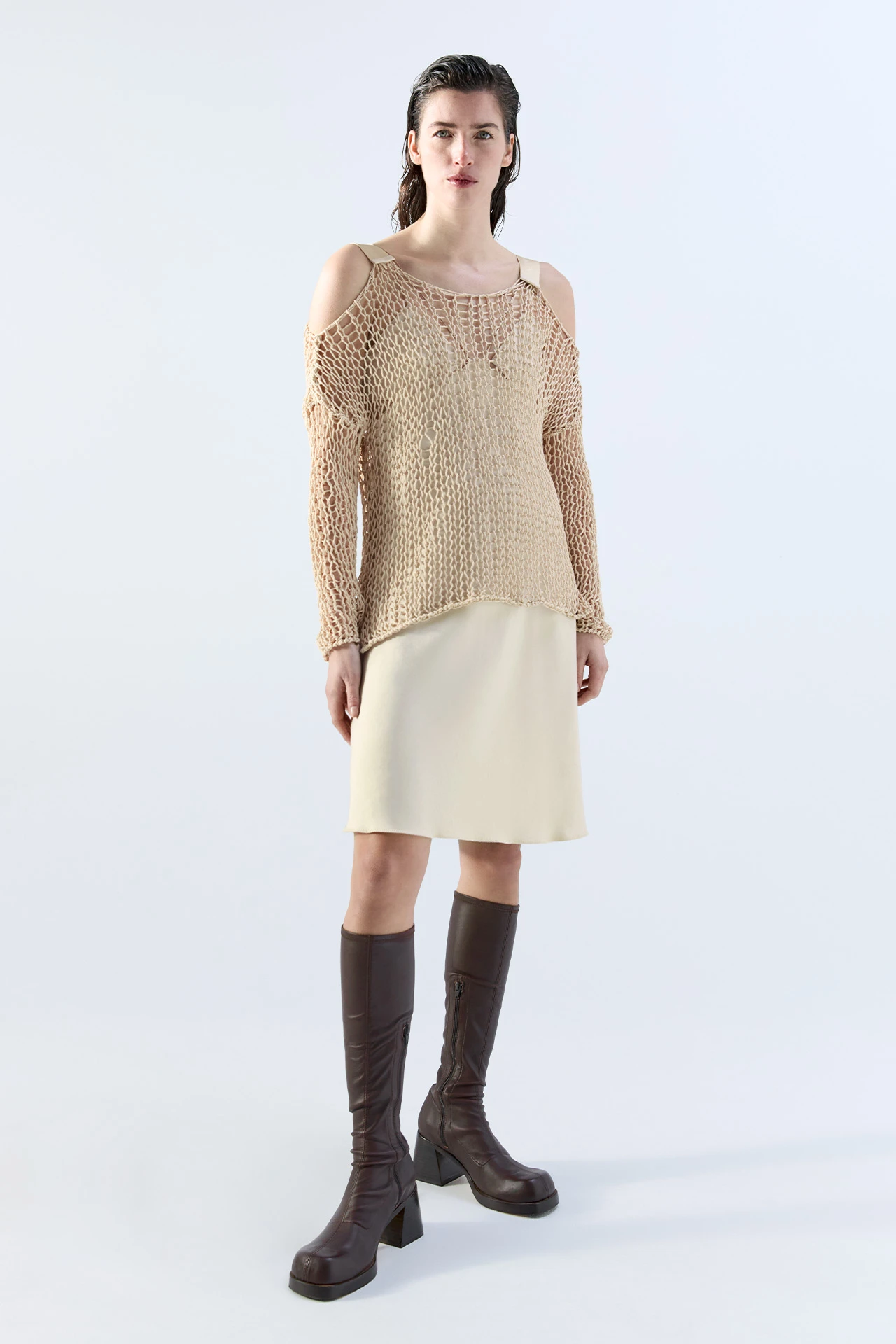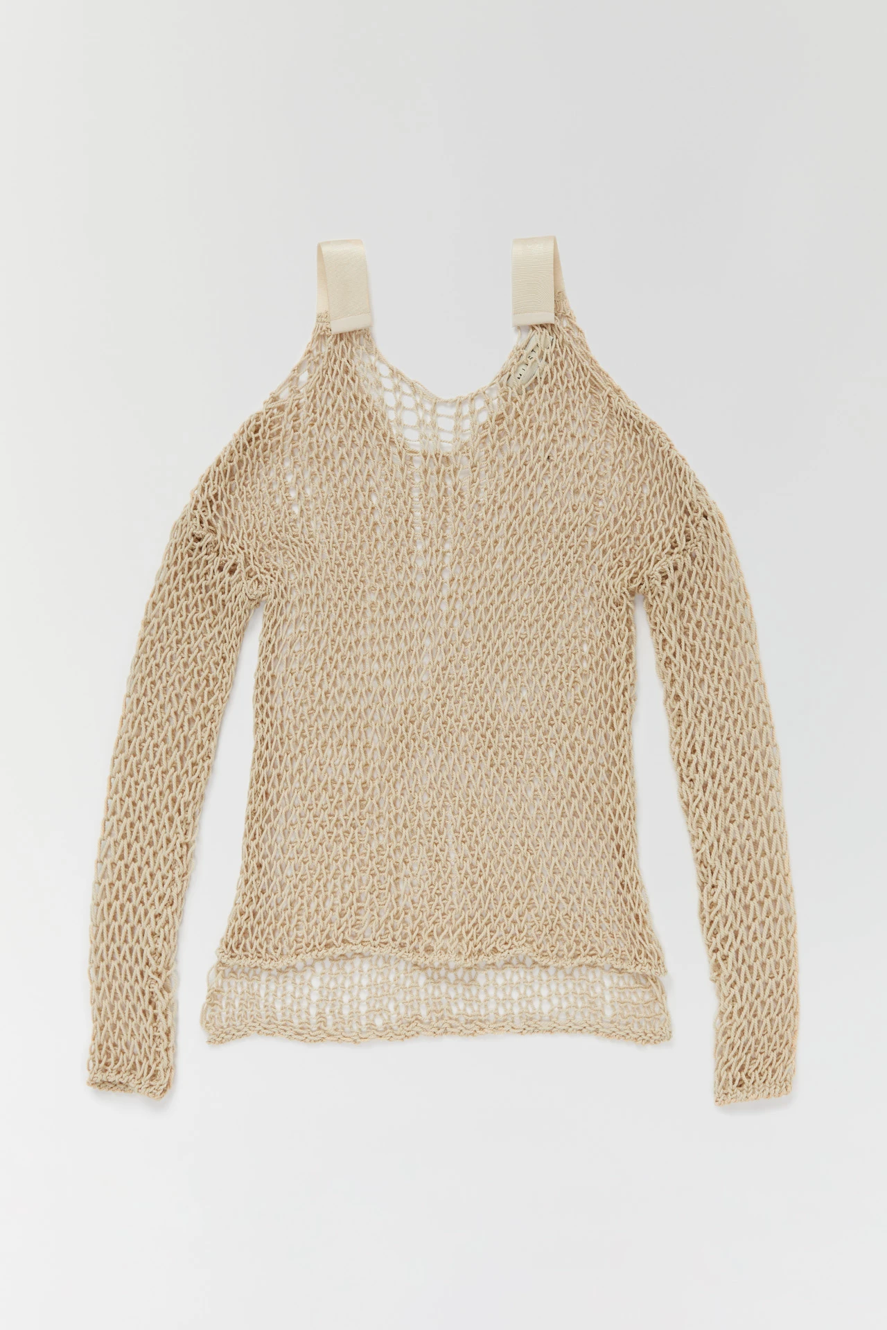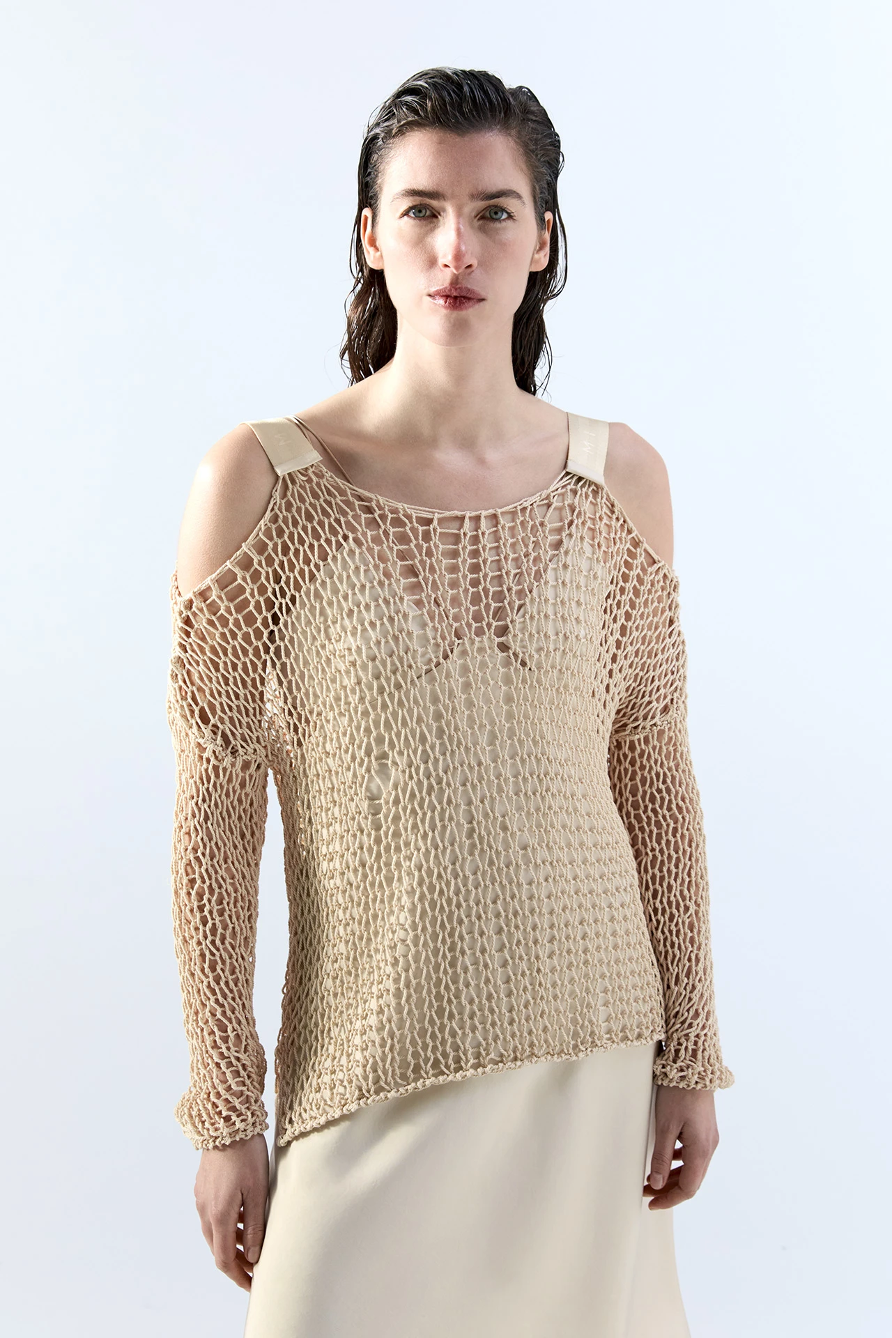 Ilona’s full of holes. Made from 100% cotton, her irregular, wide-open knit serves as a window to whatever lies beneath. She’s giving the cold shoulder too, with her low-slung neckline and sleeves held in place by wide branded straps in contrasting sporty nylon – expertly contrasting with her natural fibre construction.