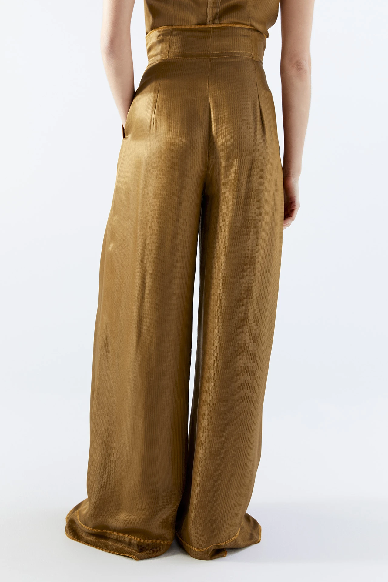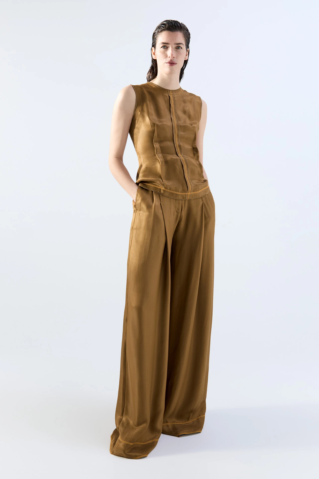 Jelena takes notes from fine tailoring, turns them on their head, and sizes them up. High waisted with an exaggerated wide pleated leg, Jelena’s crafted from a brown silky twill suiting, so she catches the light as you move. Her hems are finished with contrast copper-toned tube stitching – as is her upper waistline, which flares up and out for an almost ruched effect.