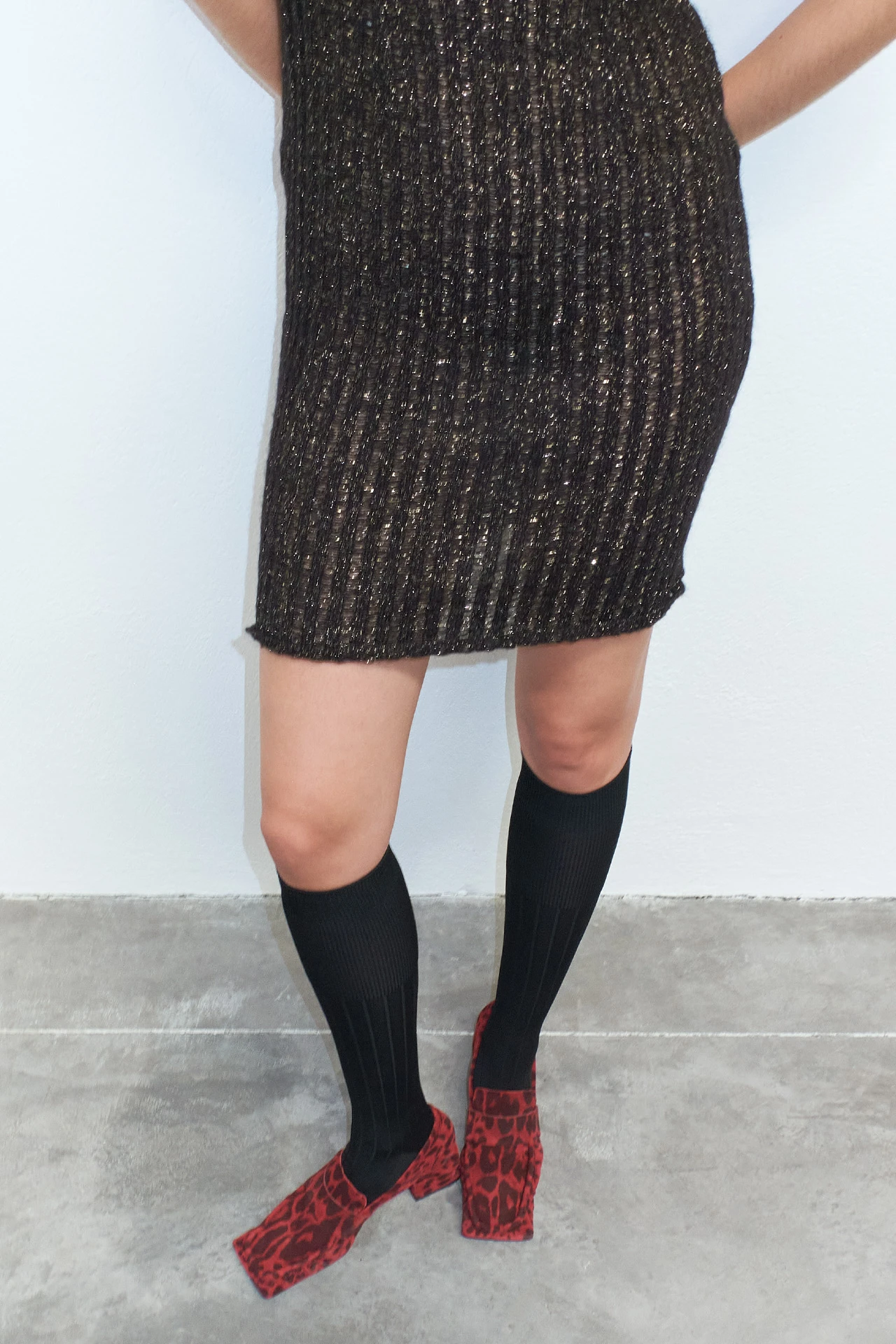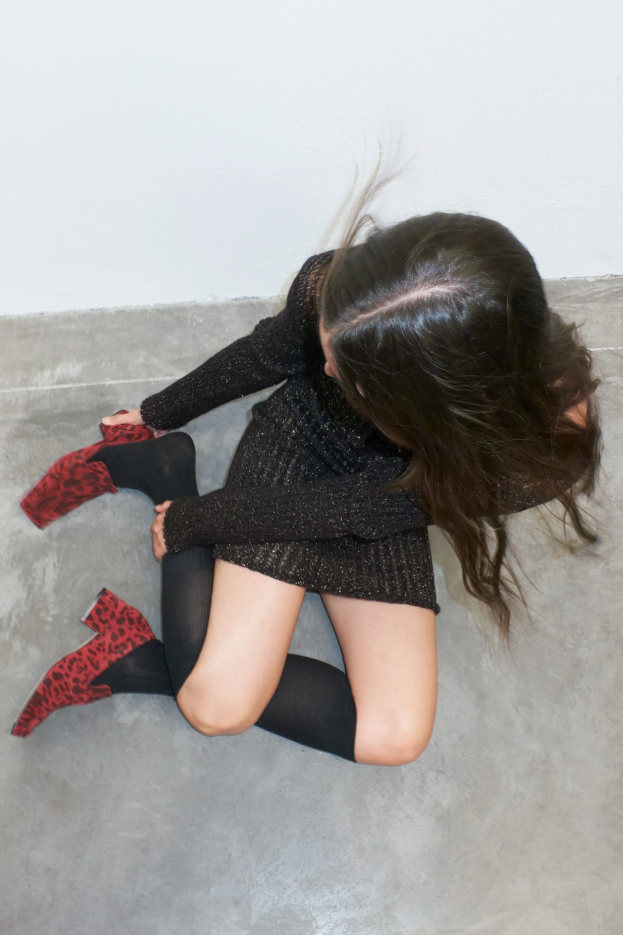 Joia is a slim-fit, halterneck number that hugs your figure in all the right ways. She’s formed of ribbed sheer knit with metallic threading, creating a sheer, glinting finish. She’s mini in length, and has a neckline that looks as though it’ll sweep down to a v-shape, but instead is finished with a squared off centre. Her back scoops down, and is finished with an additional lace to cross the back.