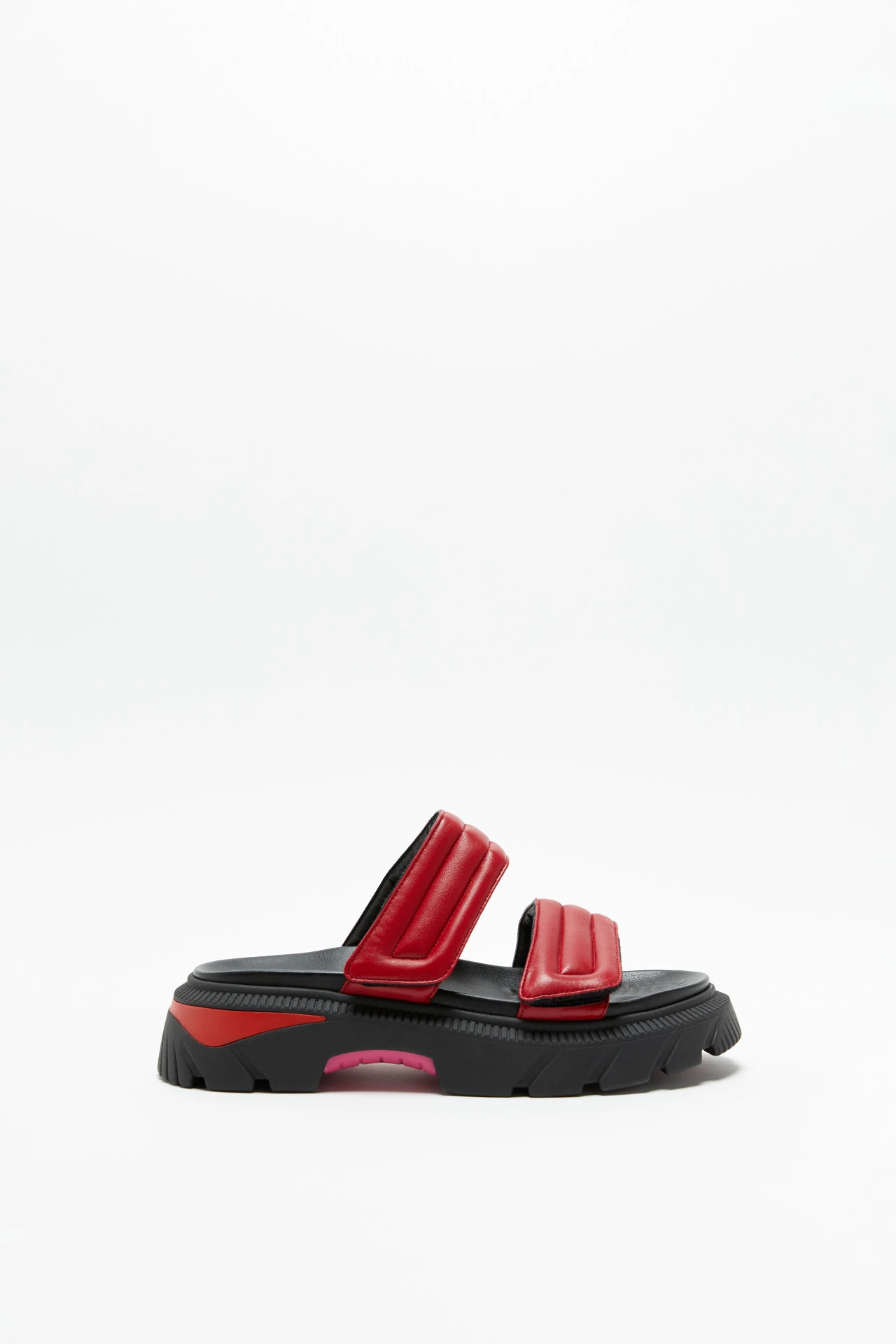 Kaiah’s construction is a feat of shoe engineering. Thick padded velcro straps in bright red leather secure the foot whilst a moulded insole and chunky athletic black rubber tread sole with red and pink contrasting details add comfort and confidence. Finished with cushioned moulded insoles, leather lining and rubber outsole. Heel height 4.5cm. This style is true to size. We recommend selecting your standard European size. Designed in London | Made in Portugal