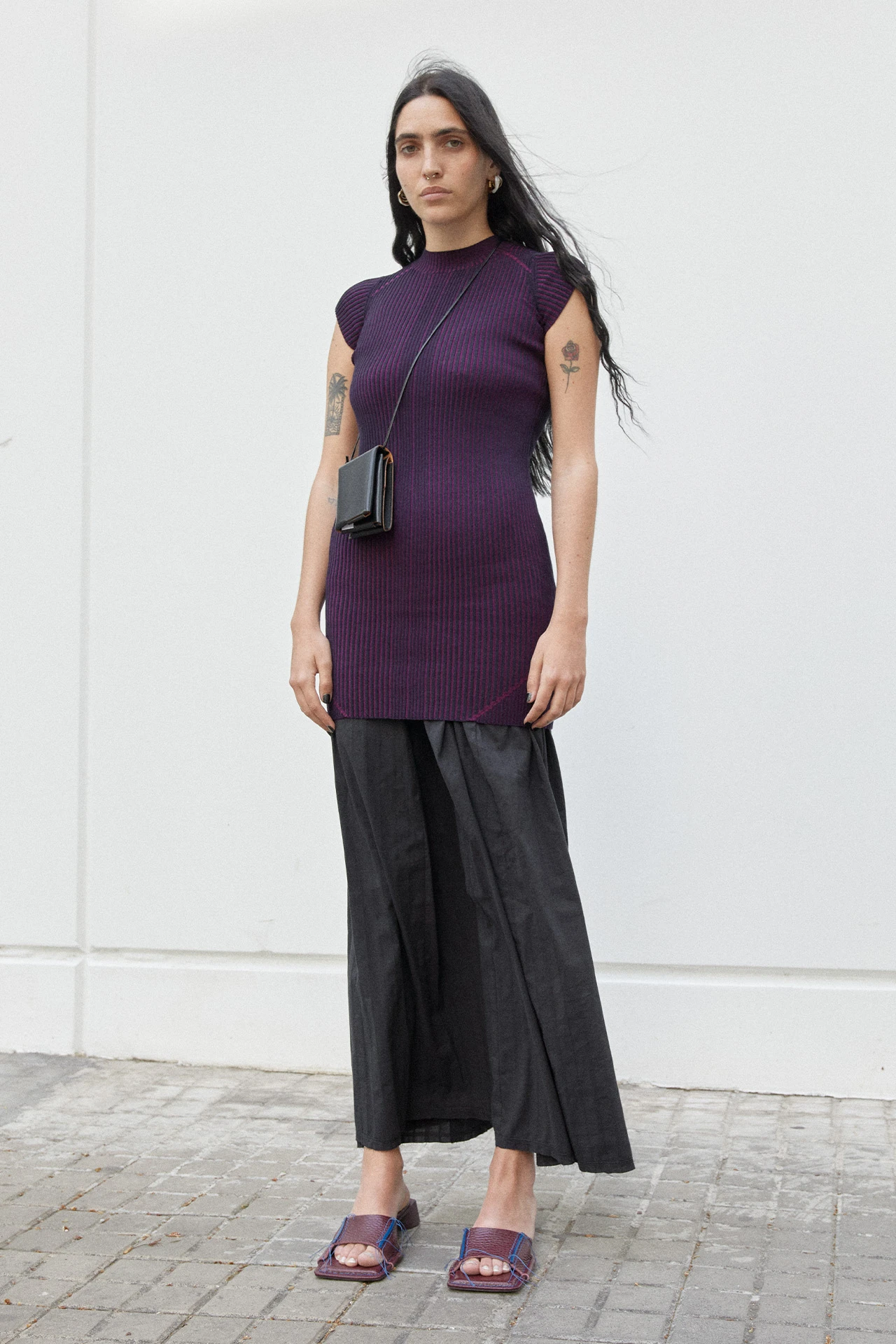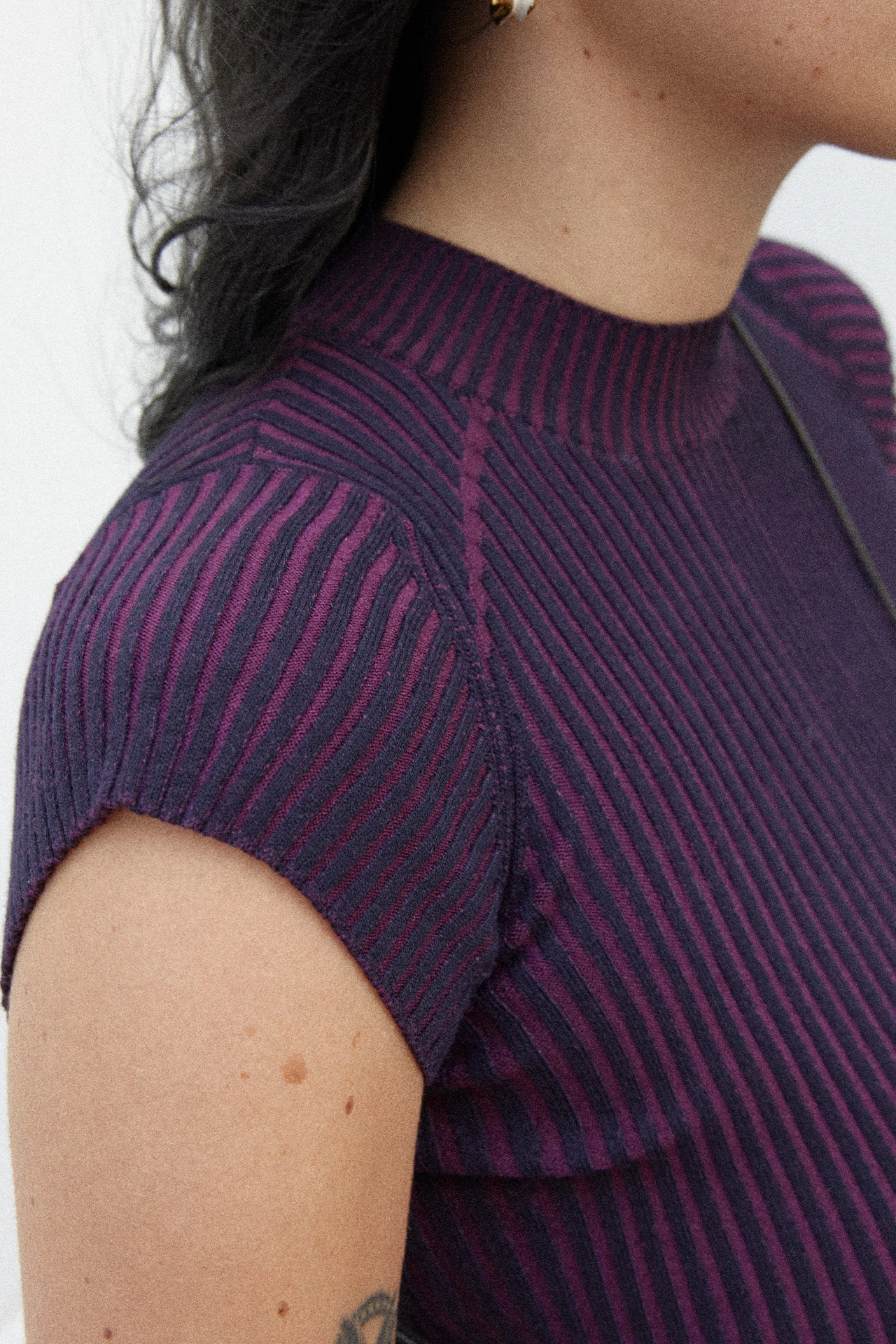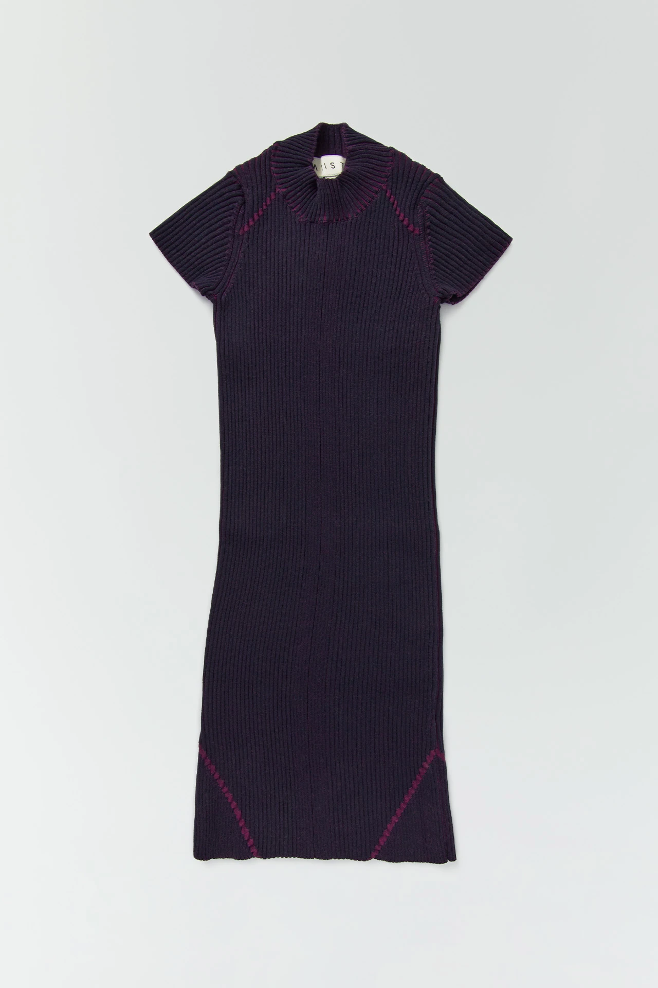Like her friends Mariechen and Bernice, Keil sits in previously unchartered territory: where knitwear materiality meets sportswear sensibilities. Formed of a stretch viscose knit, the ribbed finish creates a two-tone effect, with rich purple peeking out between the linear navy ribbing. Thicker purple lines run from the collarbones to the sleeves, and from the upper thighs diagonally inwards.
