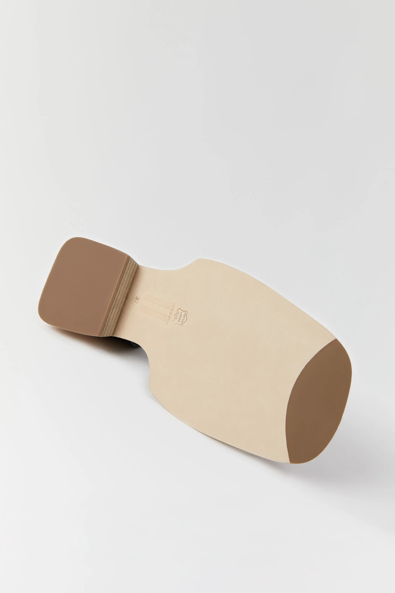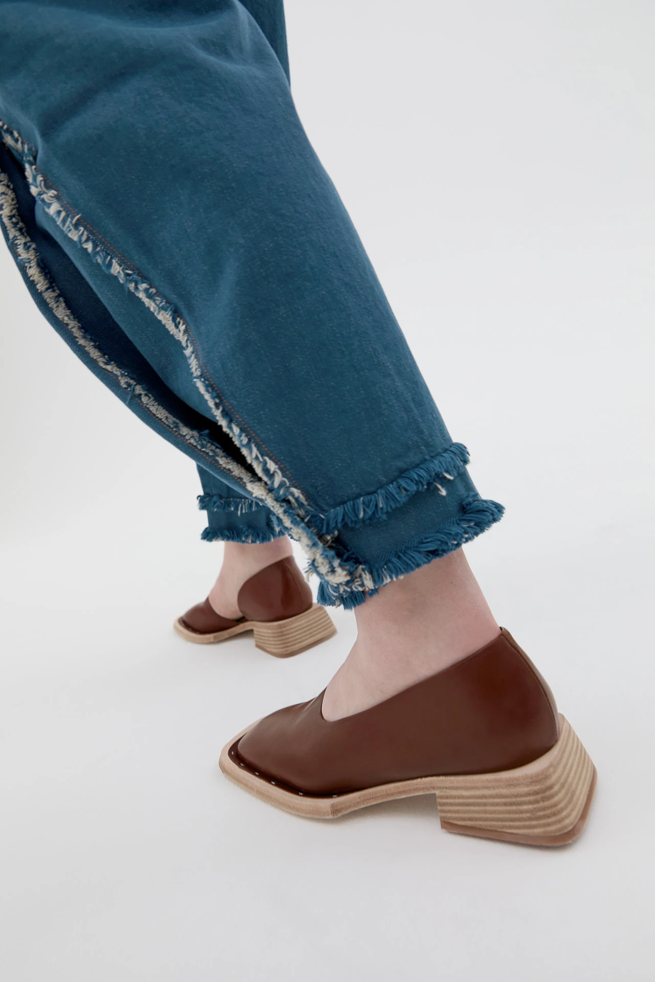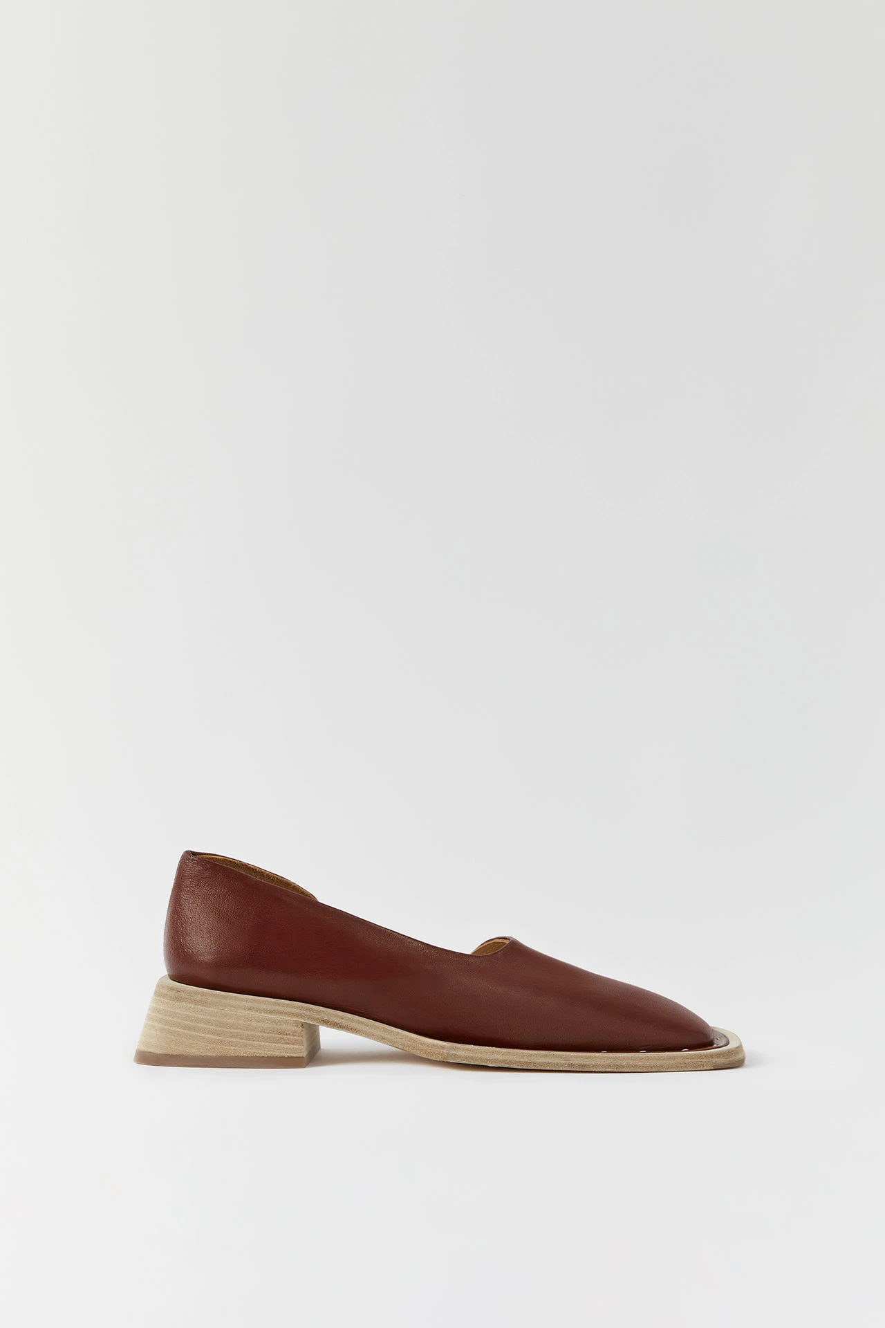 A Miista version of the d’Orsay pump, the elegant asymmetric upper is crafted from smooth brown calf leather and juxtaposed with an angular stacked leather heel and oversized sole finished with a doubled welt and metal staples.