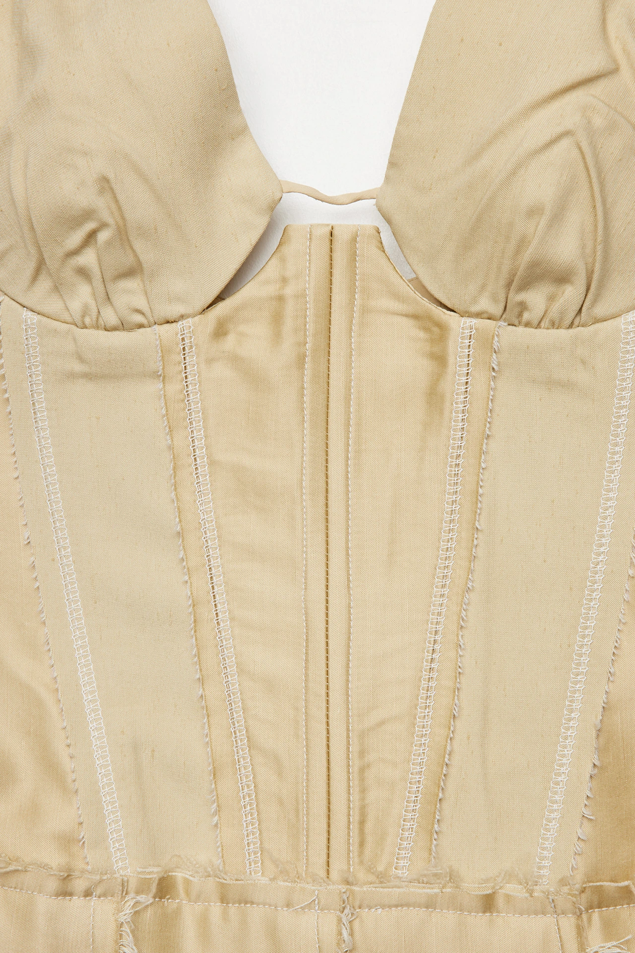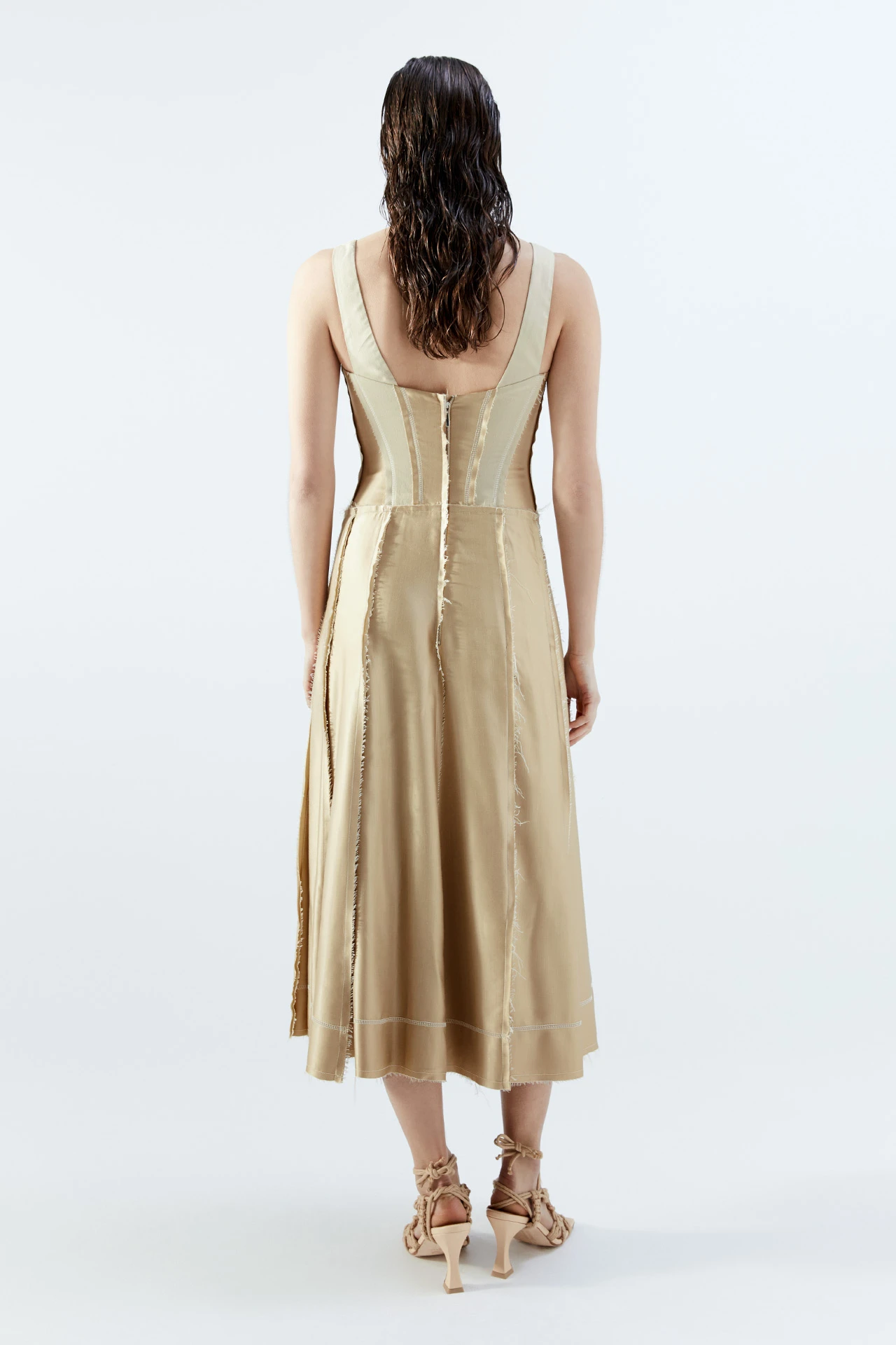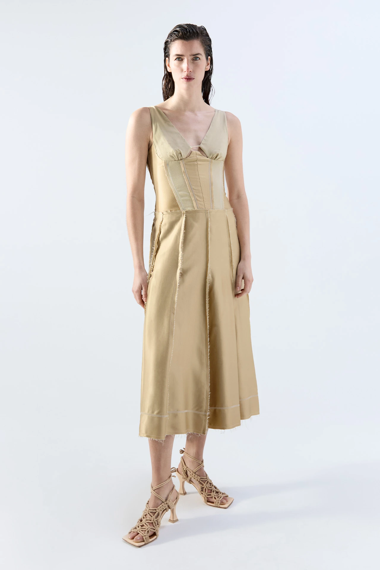Leonora introduces undone elegance to her refined silhouette. Crafted from silky cupro soft-touch viscose. A structured corset dress, her beige panels appear to alternate between fabrics but are in fact formed of the same – simply presenting the front and reverse to reveal contrasting shine and matte textures. Contrast overlay stitching binds each piece together, finished with raw edging. Leonora’s cups are unstructured, as is her pleated skirt, which fans out for freedom of movement.