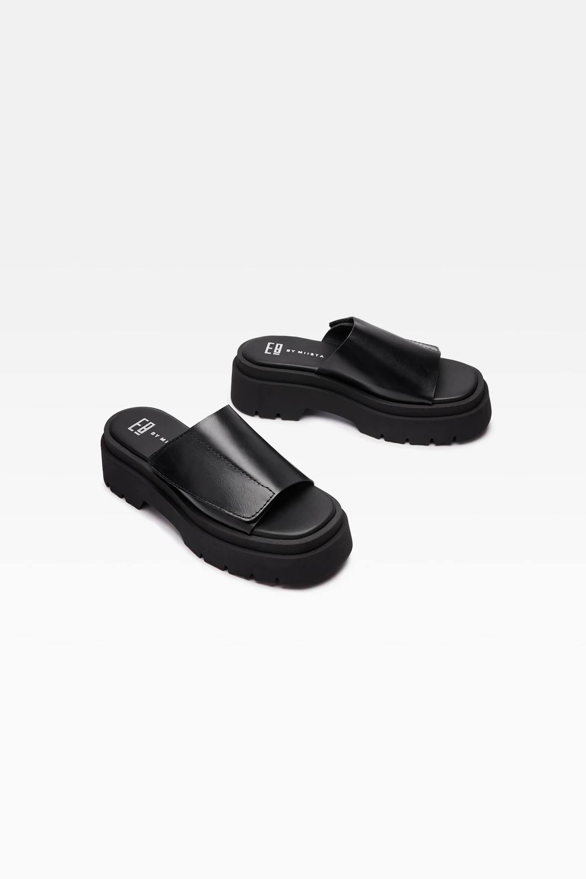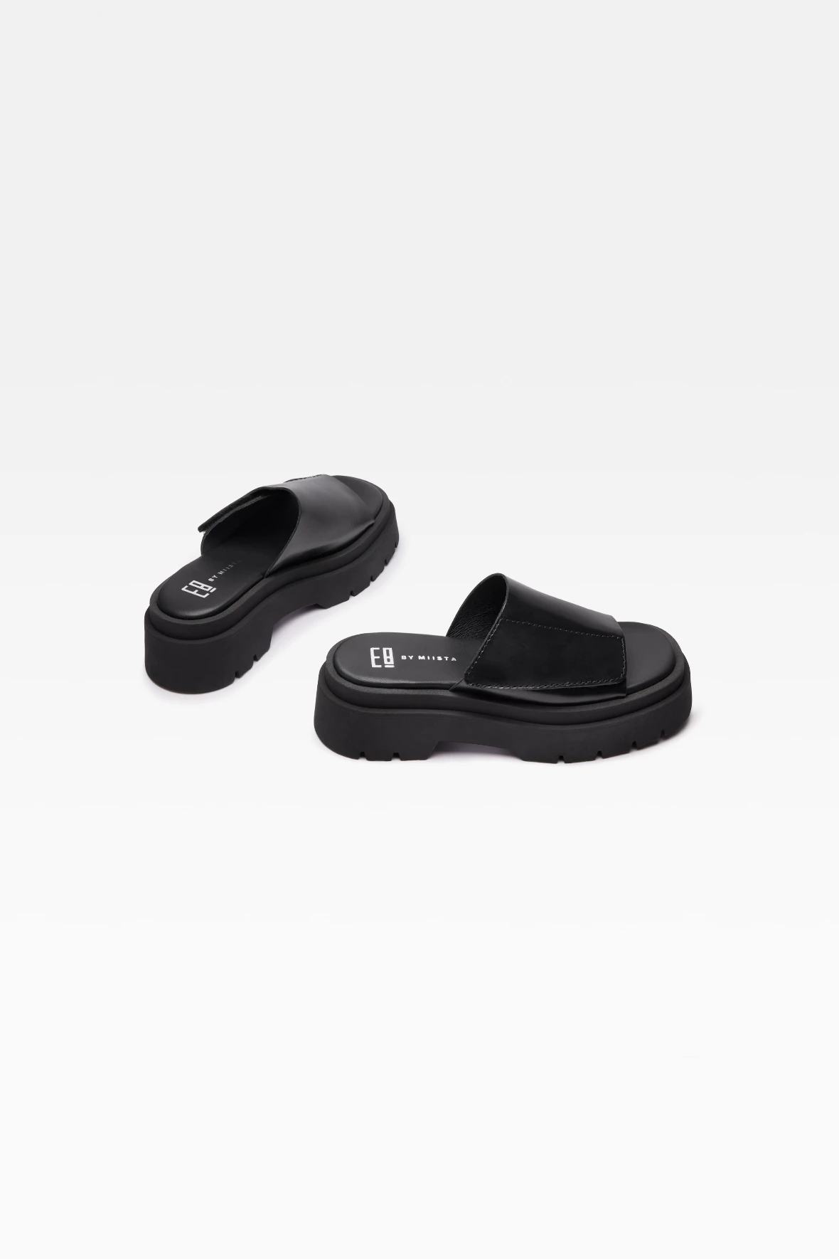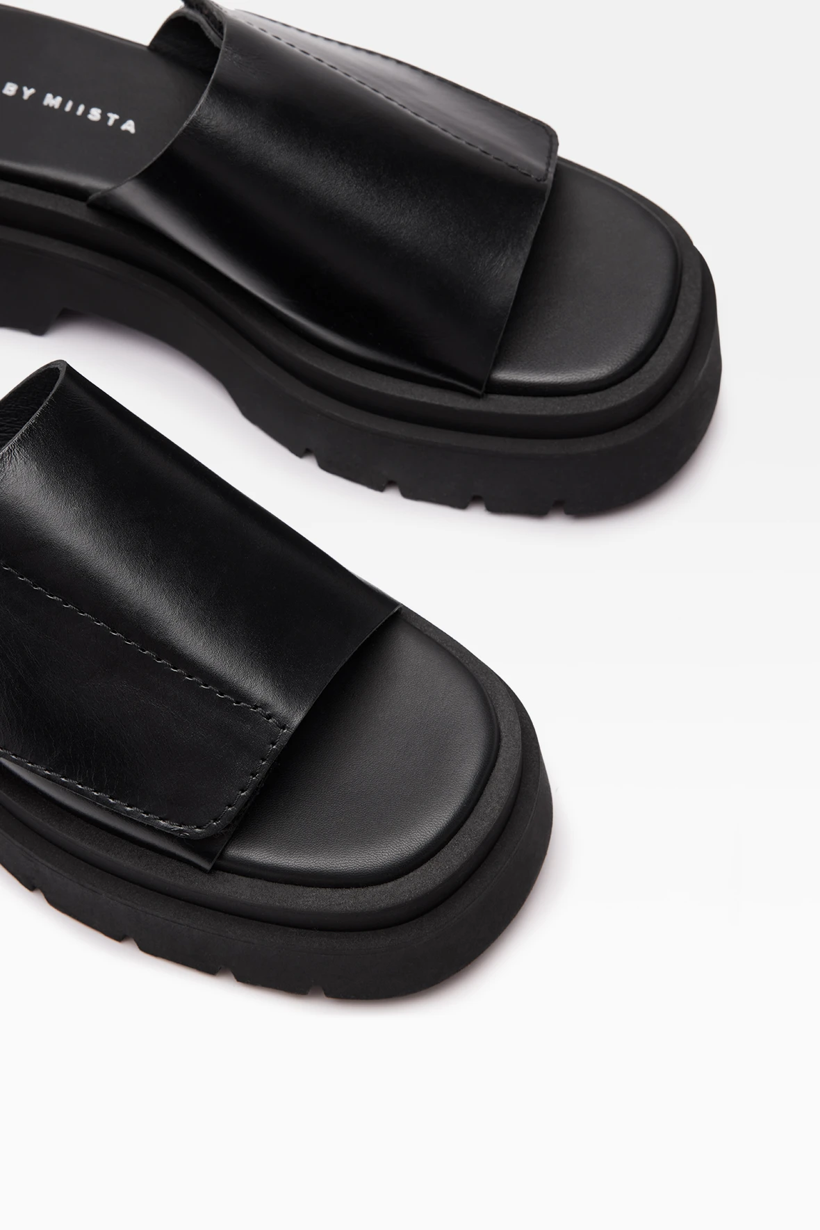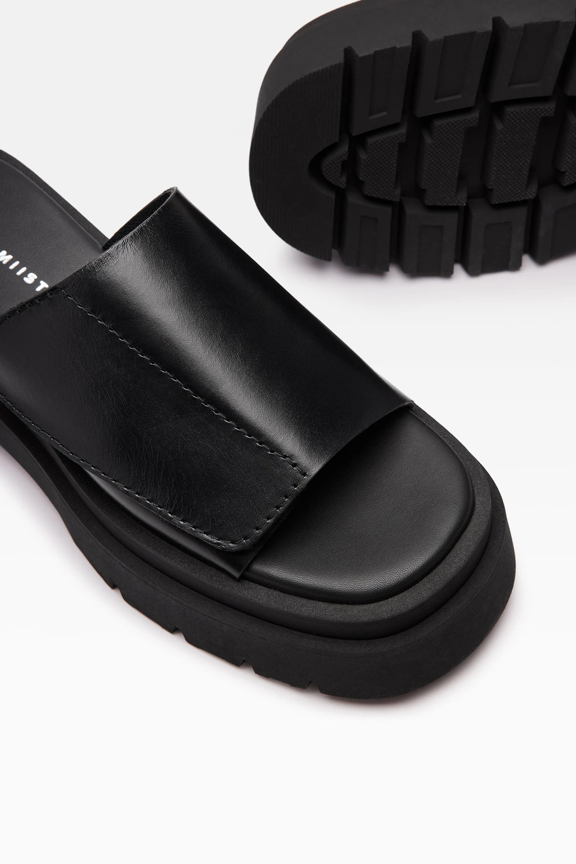 A wide adjustable velcro strap is paired with a double layer chunky platform tread sole for a sporty silhouette. Expect endless adventures with Liese in all-black. Finished with ultra-cushioned memory foam insoles, leather lining and rubber outsole. Heel height 5.8cm. Designed in London | Made in Portugal