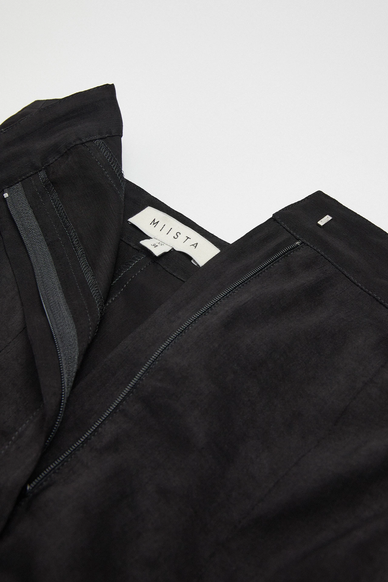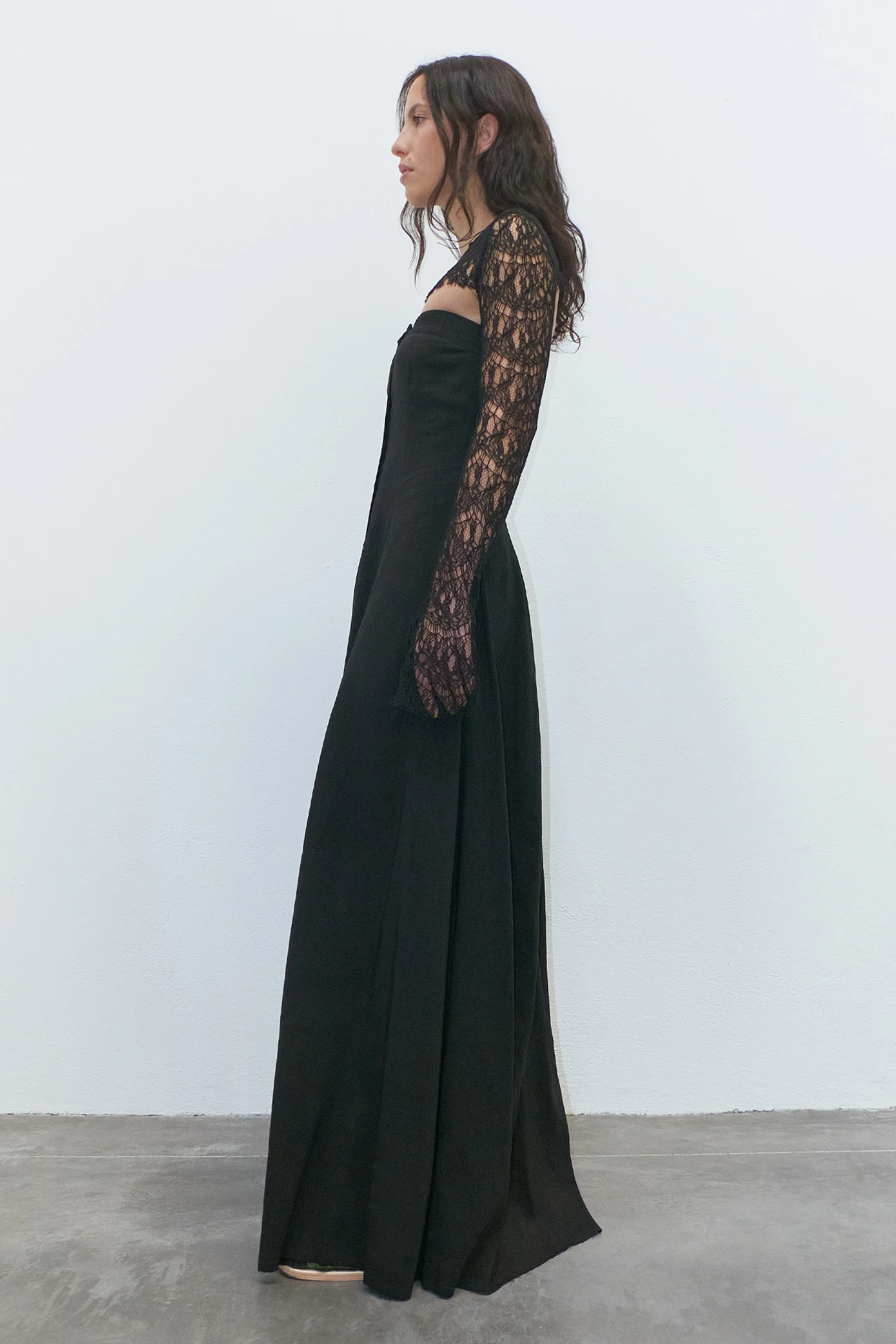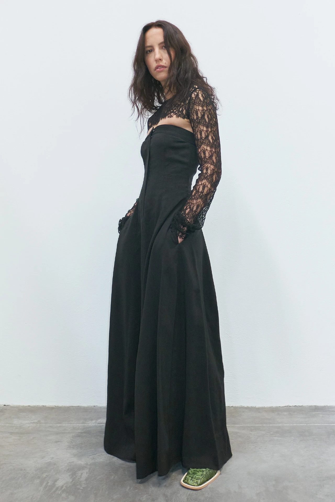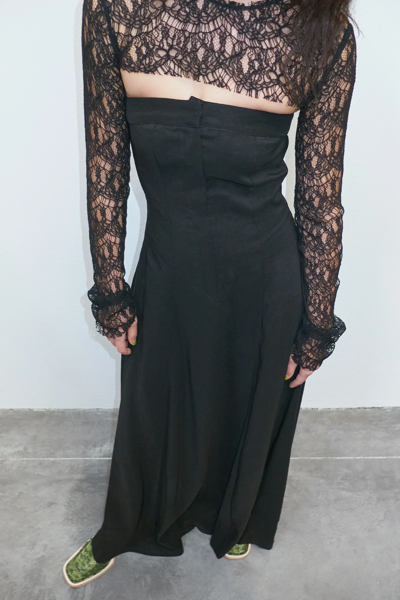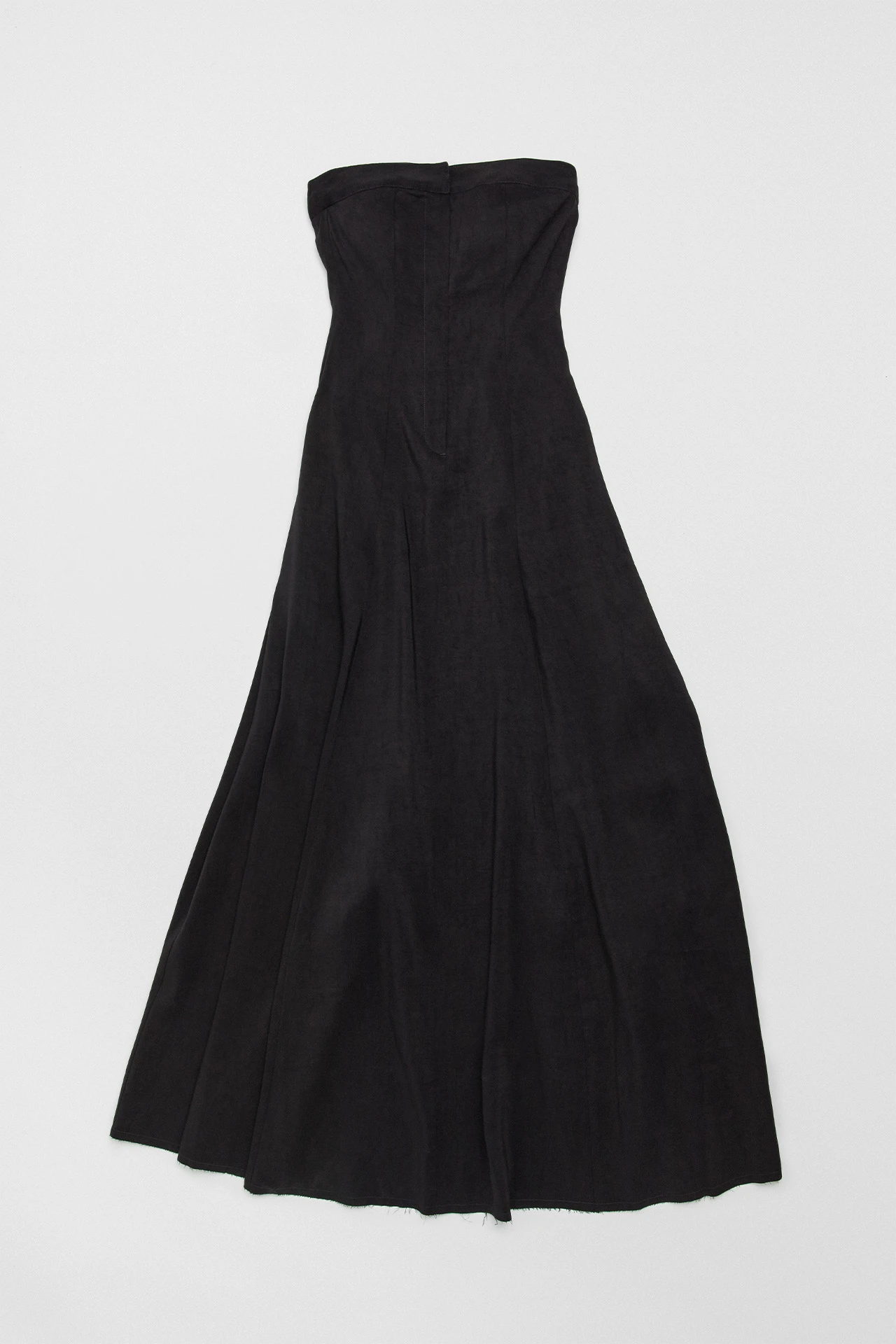 A black bandeau dress, Lin is cool, calm, and ready to be collected. Her bodice is structured, with a central fly-style hidden zip running the length of the torso. Her stripe-effect textured materiality caresses the hips, fanning out into a full, flowing ankle-length skirt that’s been finished with a rugged raw edged hem.