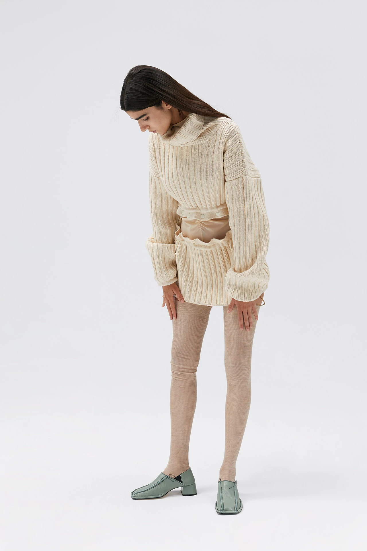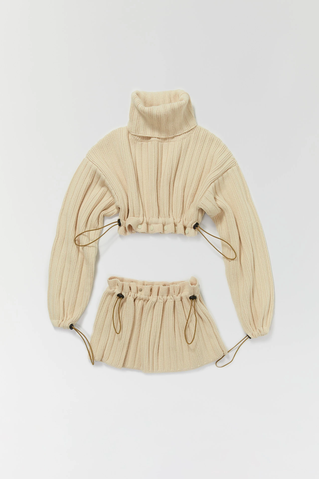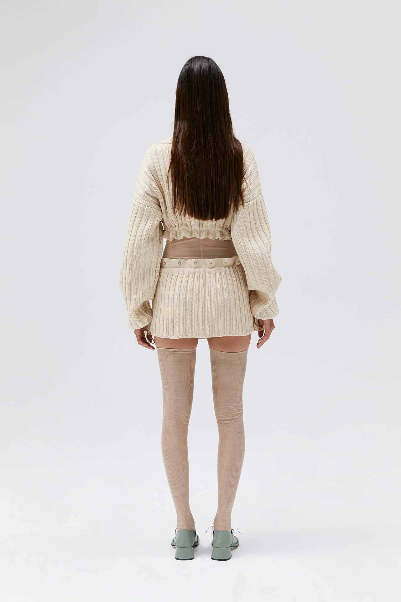 Three in one, this chunky ribbed knit jumper in a creamy beige shade can be worn as is, or split into two pieces along the ruffled waist: a crop jumper and a micro mini skirt for layering over our skinny Birgit knit trousers. Featuring contrast black popper fastenings and adjustable ties at the waist and cuffs allowing you to play with proportions. Rebeca is 178cm tall and she is wearing a size S. This style is true to size. We recommend selecting your standard European size. Designed in London | Handcrafted in Spain