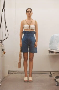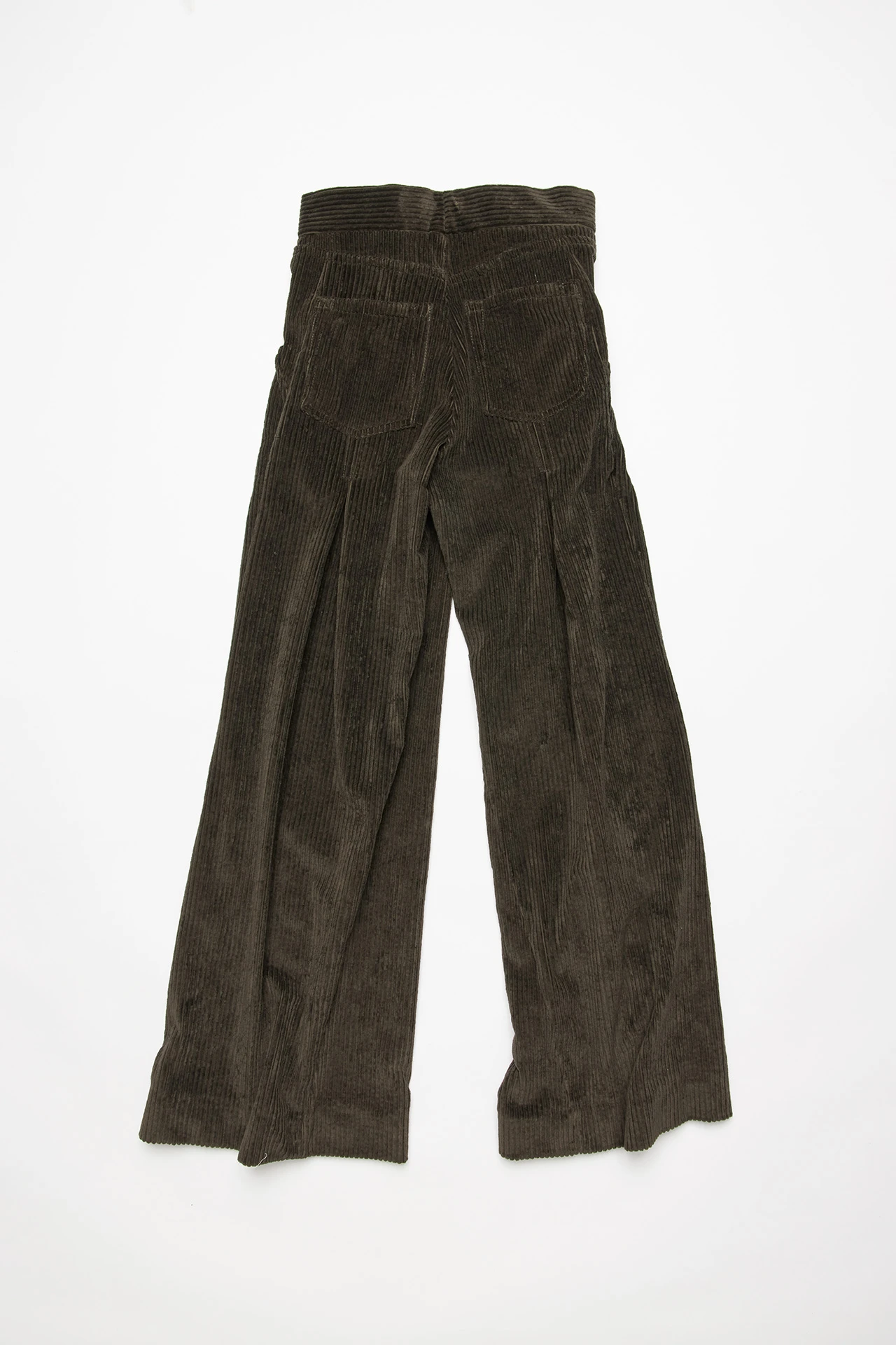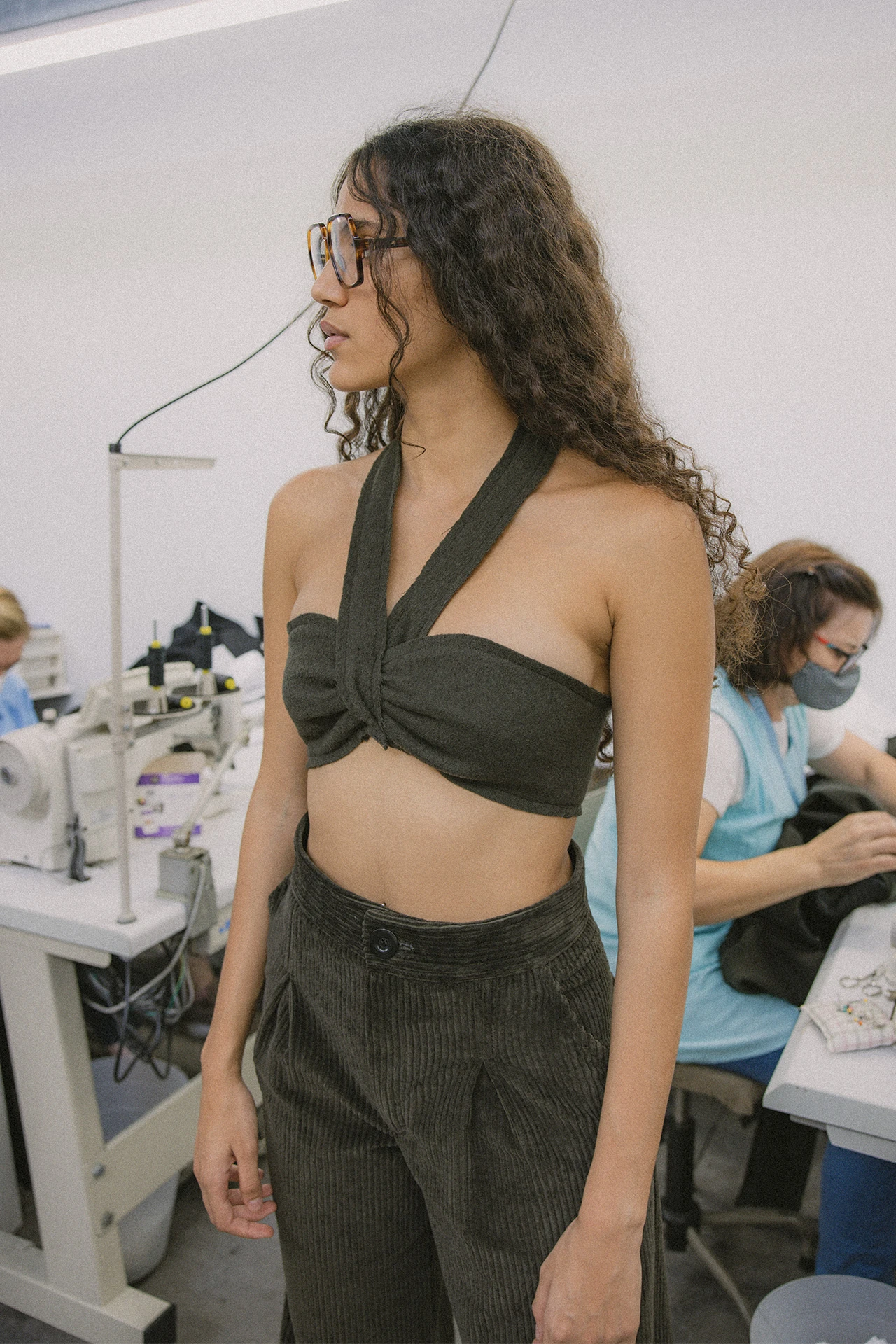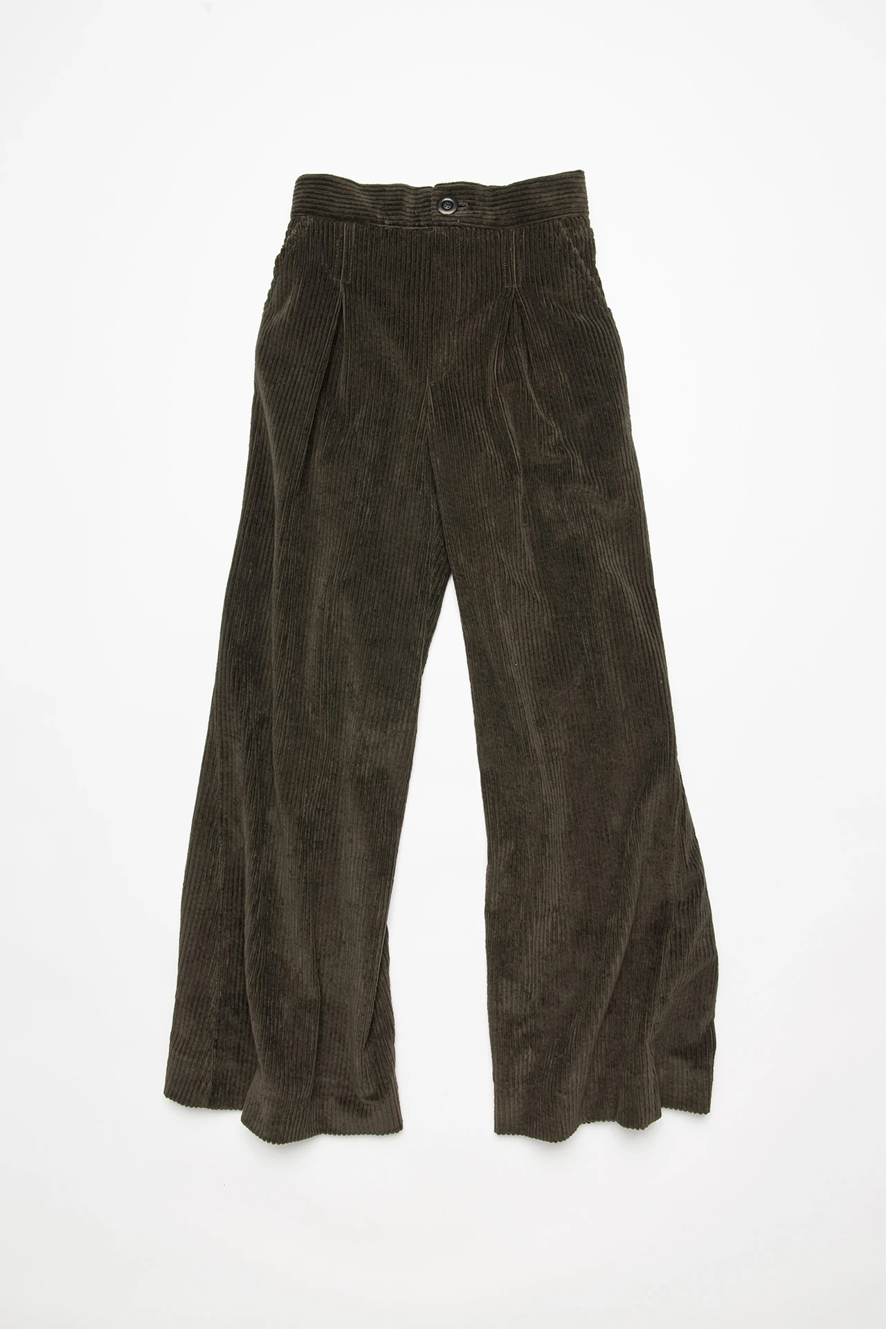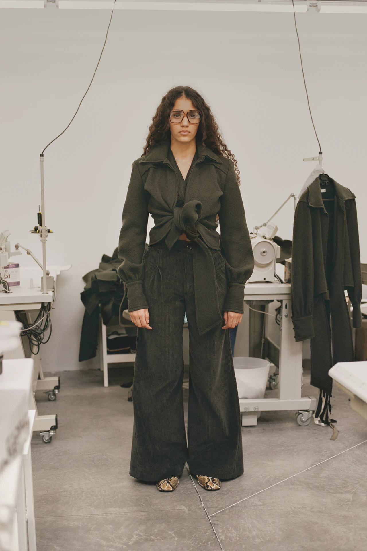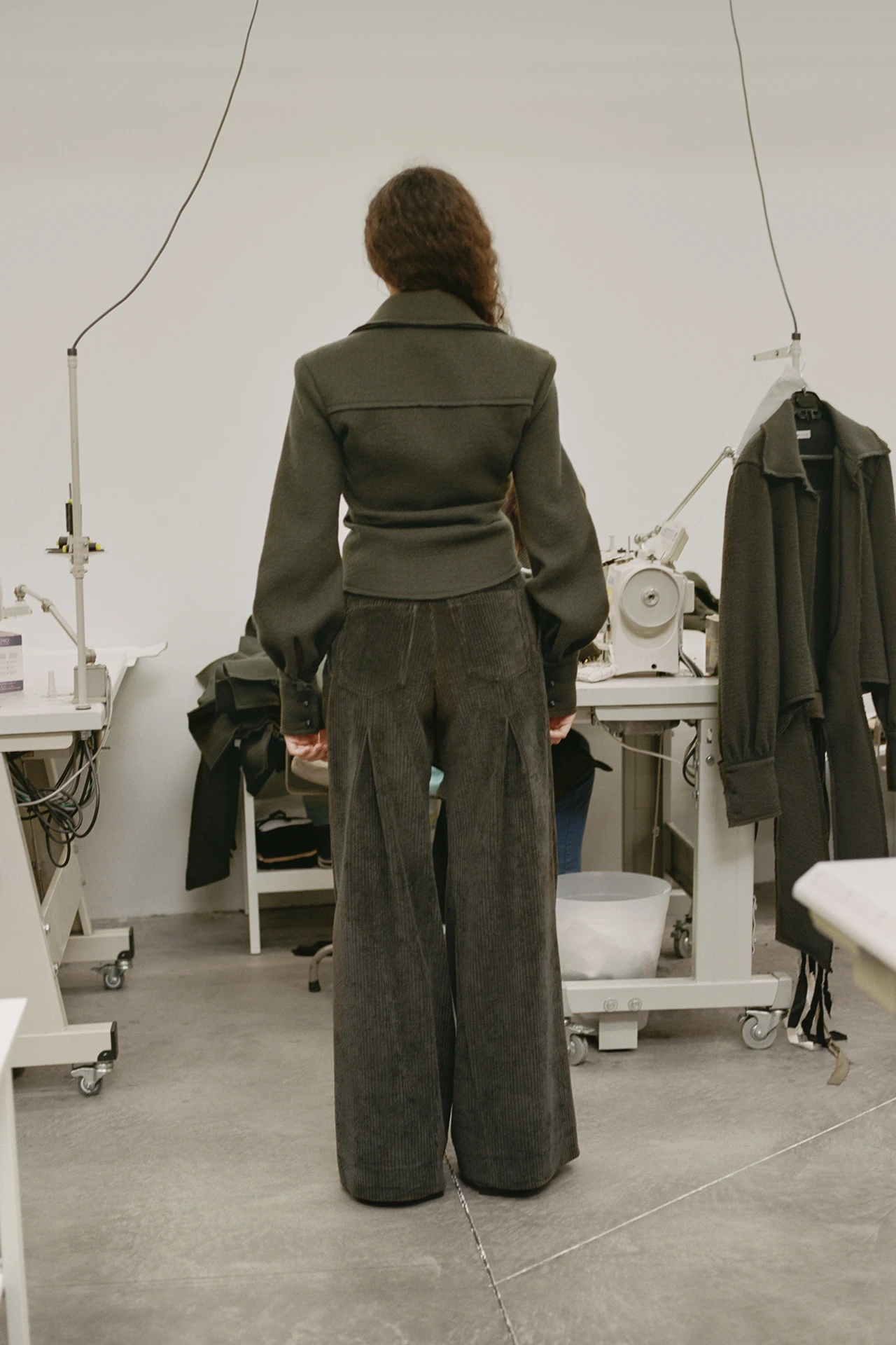 These grey high-waisted wide-leg trousers in thick corduroy can’t help but make a statement. The pleats on the front and the button made of real horn add unexpected masculine tailoring while the soft yellow keeps in feminine. The Lorelei is made for a fashion lover who is detail-oriented but still wants to make a statement. Fitting recommendation: This style is true to size. Designed in London | Made in Spain