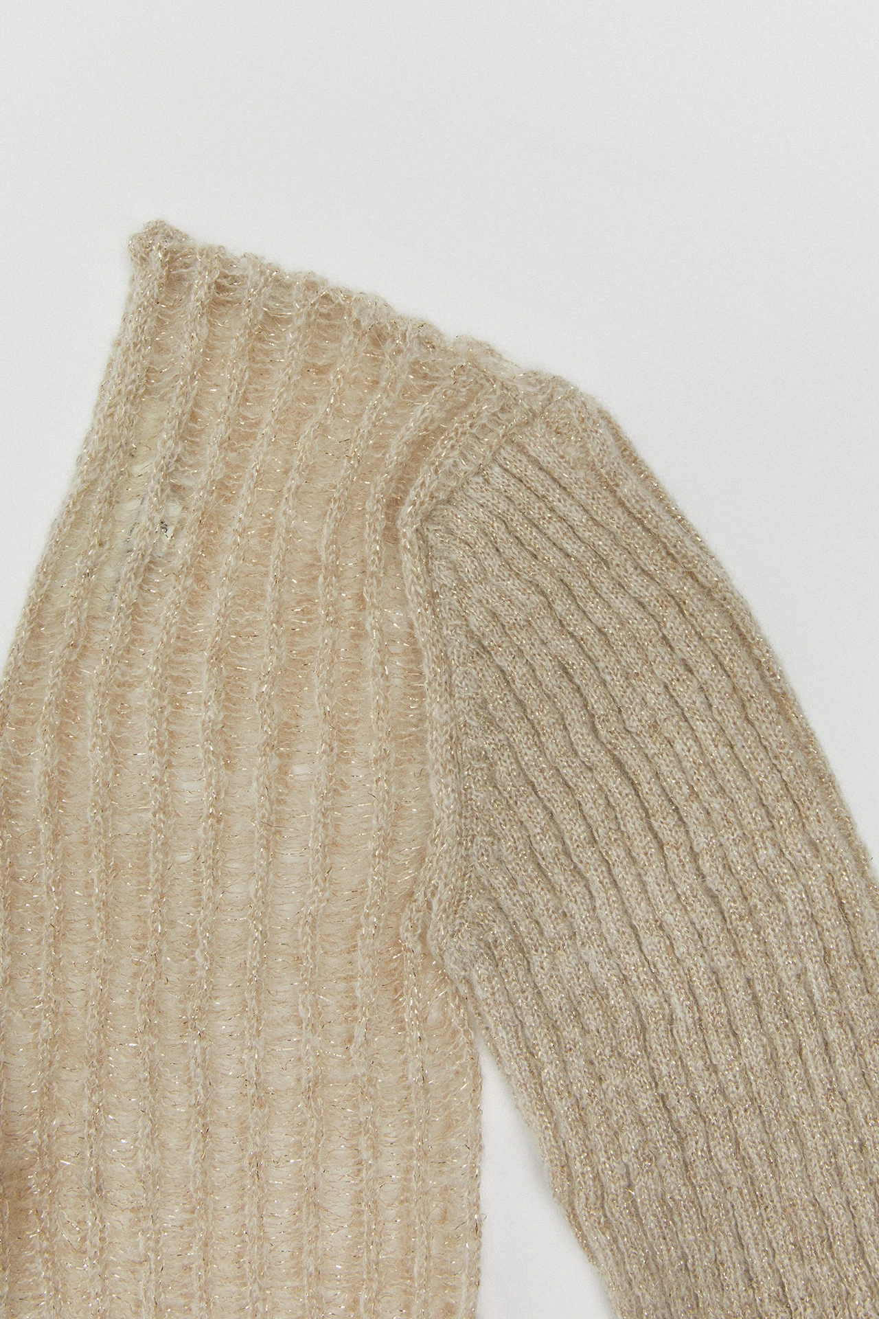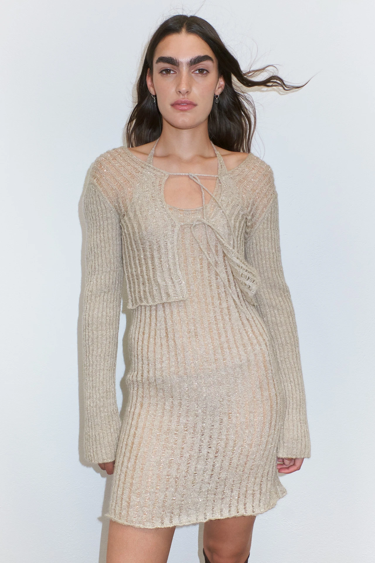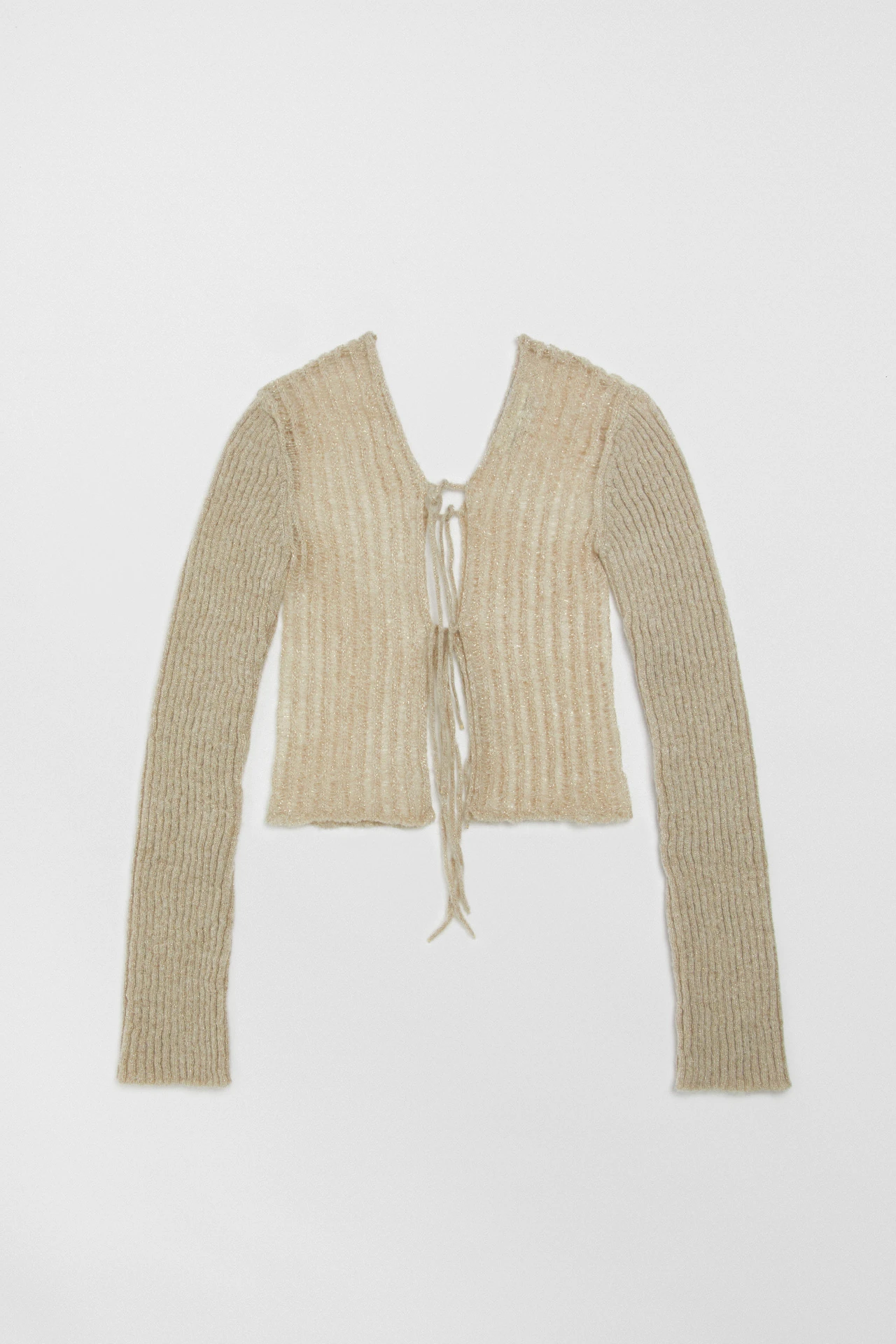 Sorry, Madalena is all tied up this week. And the next. And the week after that. She’s busy, and she’s formed of a beige ribbed knit flecked with metallic threads that’s fine on her long sleeves and thicker on her body. She ties to the front in three places, and the same at the back – leaving you to flash a bit of skin or an underlayer to your liking.