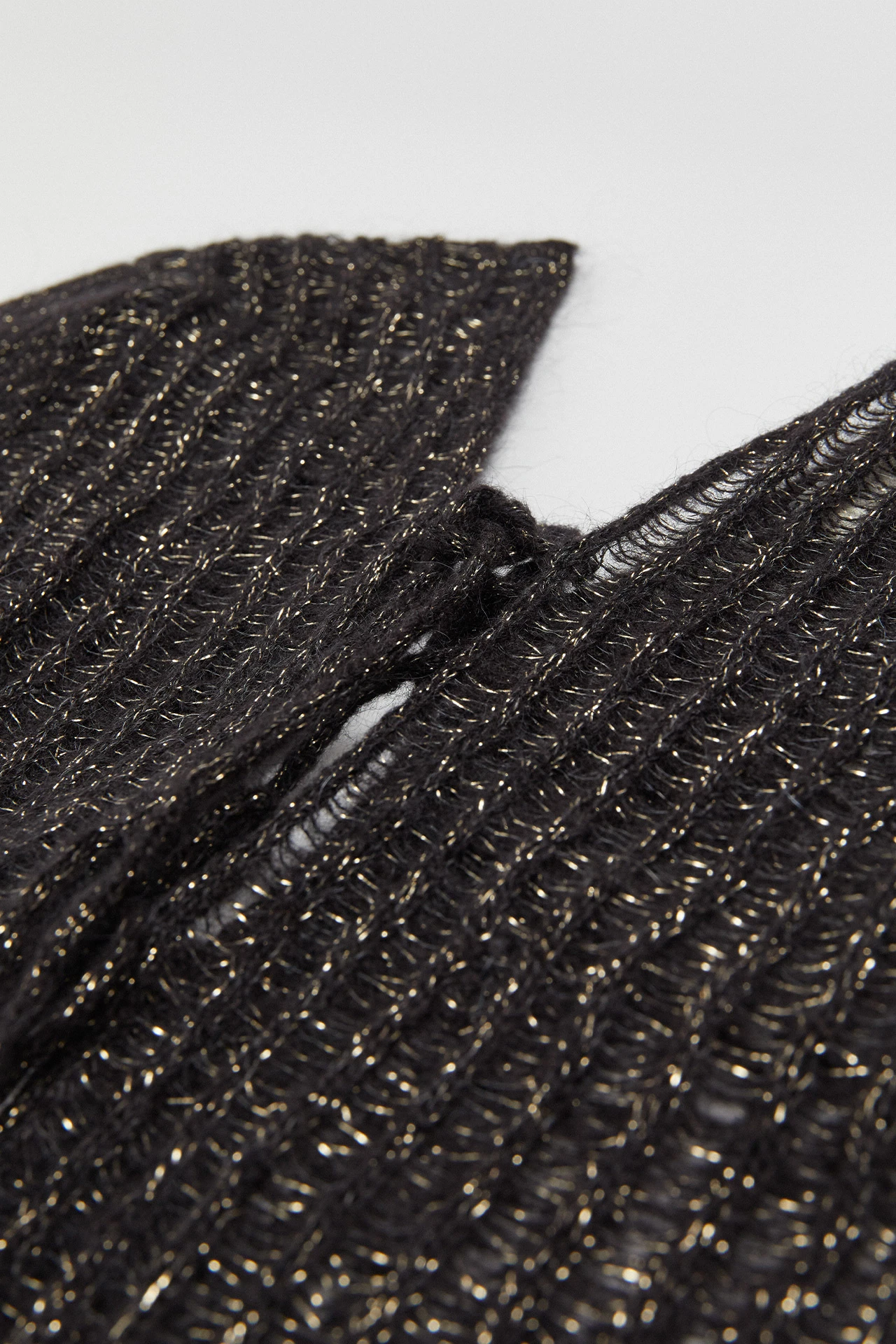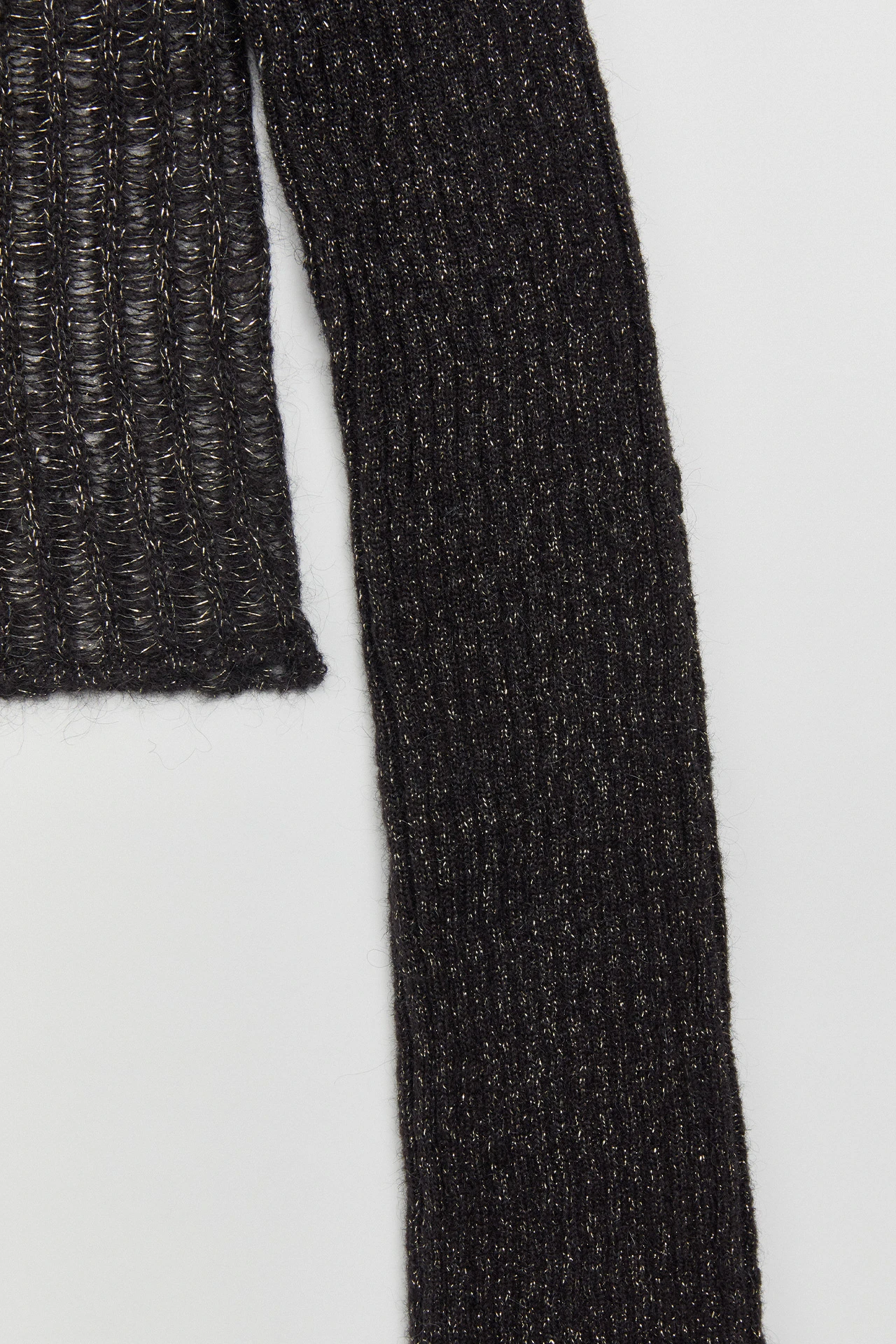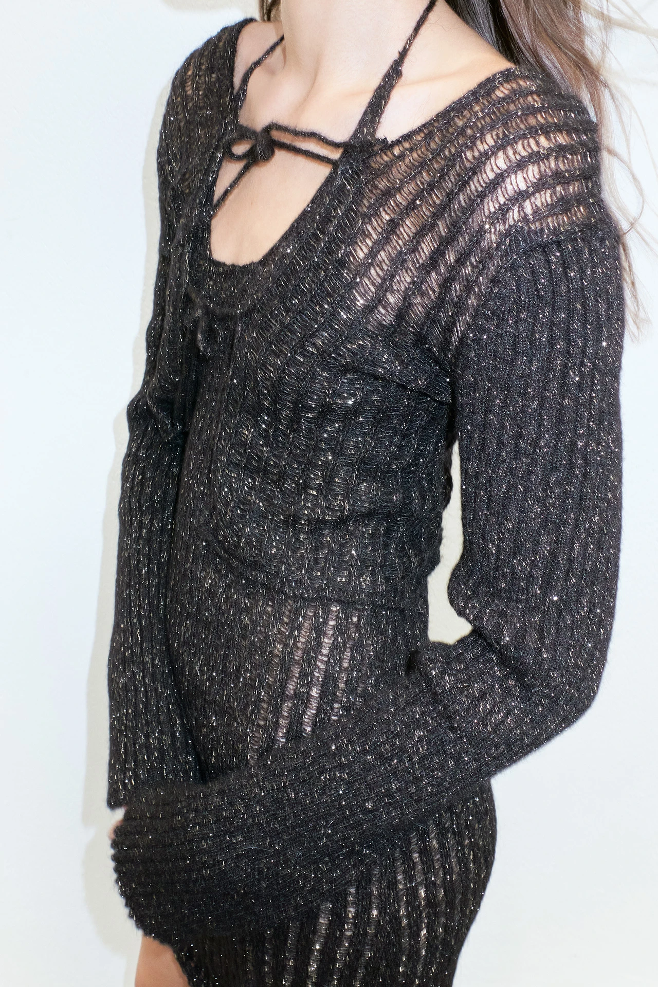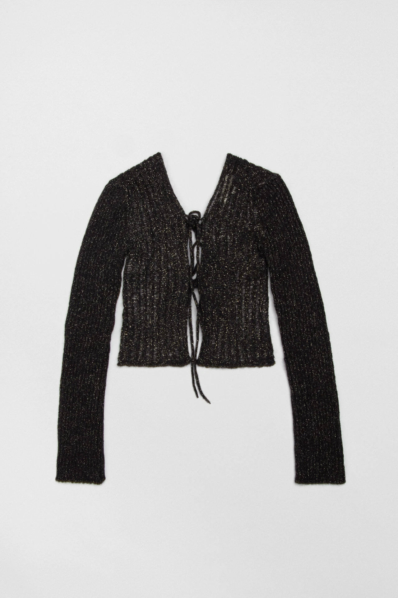 Sorry, Madalena is all tied up this week. And the next. And the week after that. She’s busy, and she’s formed of a black, ribbed knit with metallic threads that’s fine on her long sleeves and thicker on her body. She ties to the front in three places, and the same at the back – leaving you to flash a bit of skin or an underlayer to your liking.