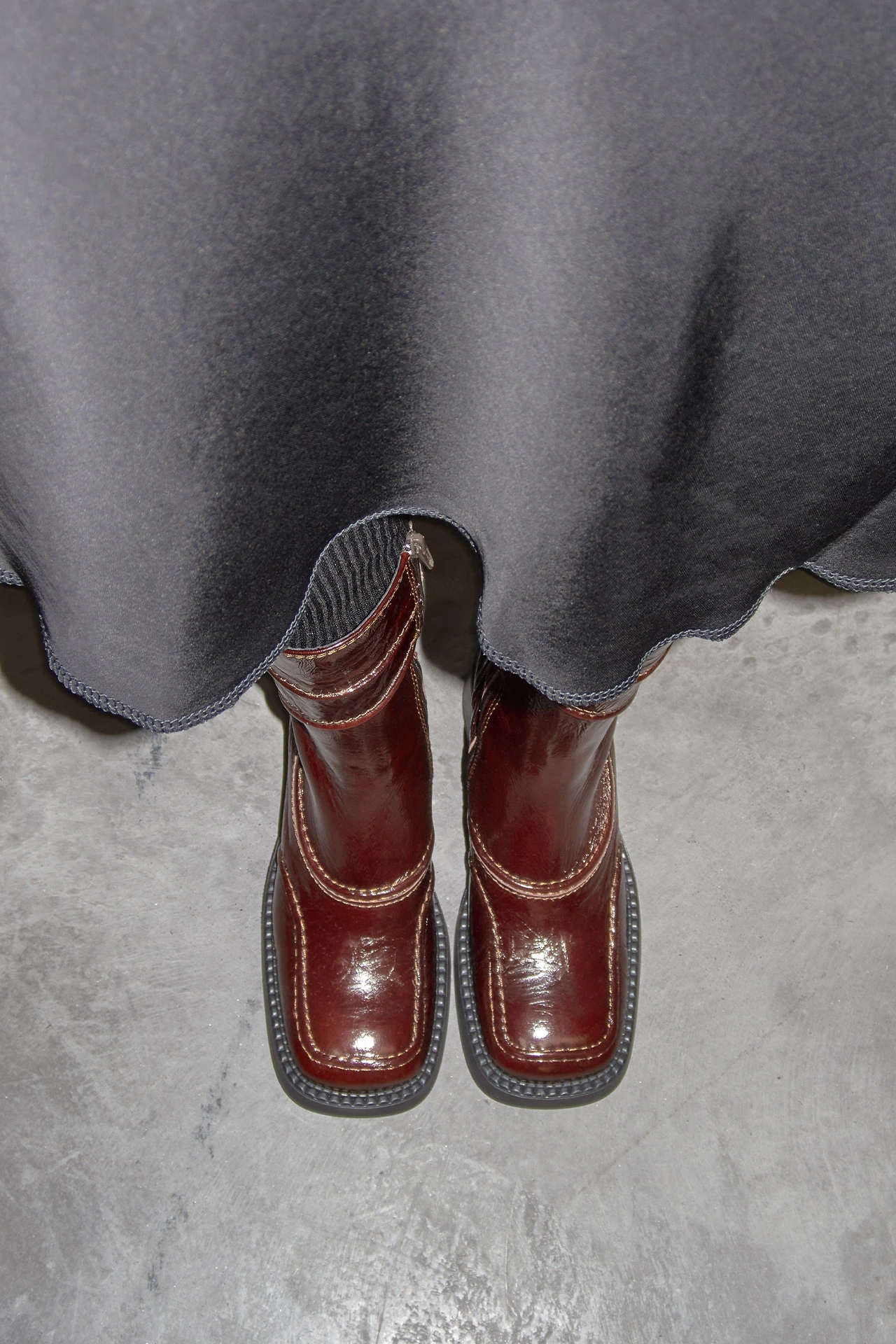 In crinkled patent sheep leather, Malene is an E8 Icon. She reaches upwards to the mid calf, formed of contrasting panels and shapes that play with The Opposite Thing: squared edges meet flowing lines and circles morph into rectangles – all bound with double contrast stitching and internal piping for extra emphasis. Malene’s rubber outsole is robust – ideal for days on the run – with her mid-heel stacked and slightly flared, promising optimum comfort with no compromise on impact. She’s complete with an inner zip and a subtle elastic gusset for your perfect fit.