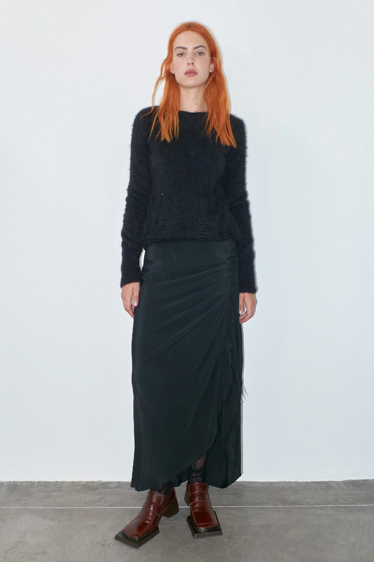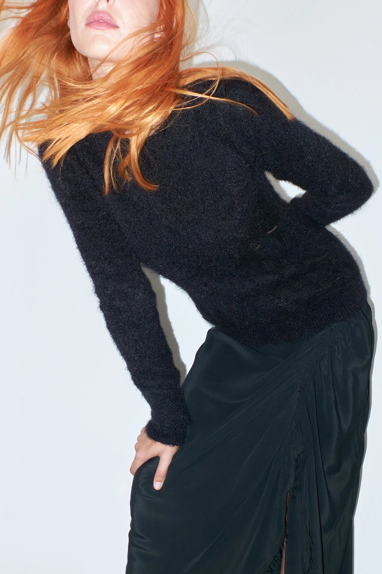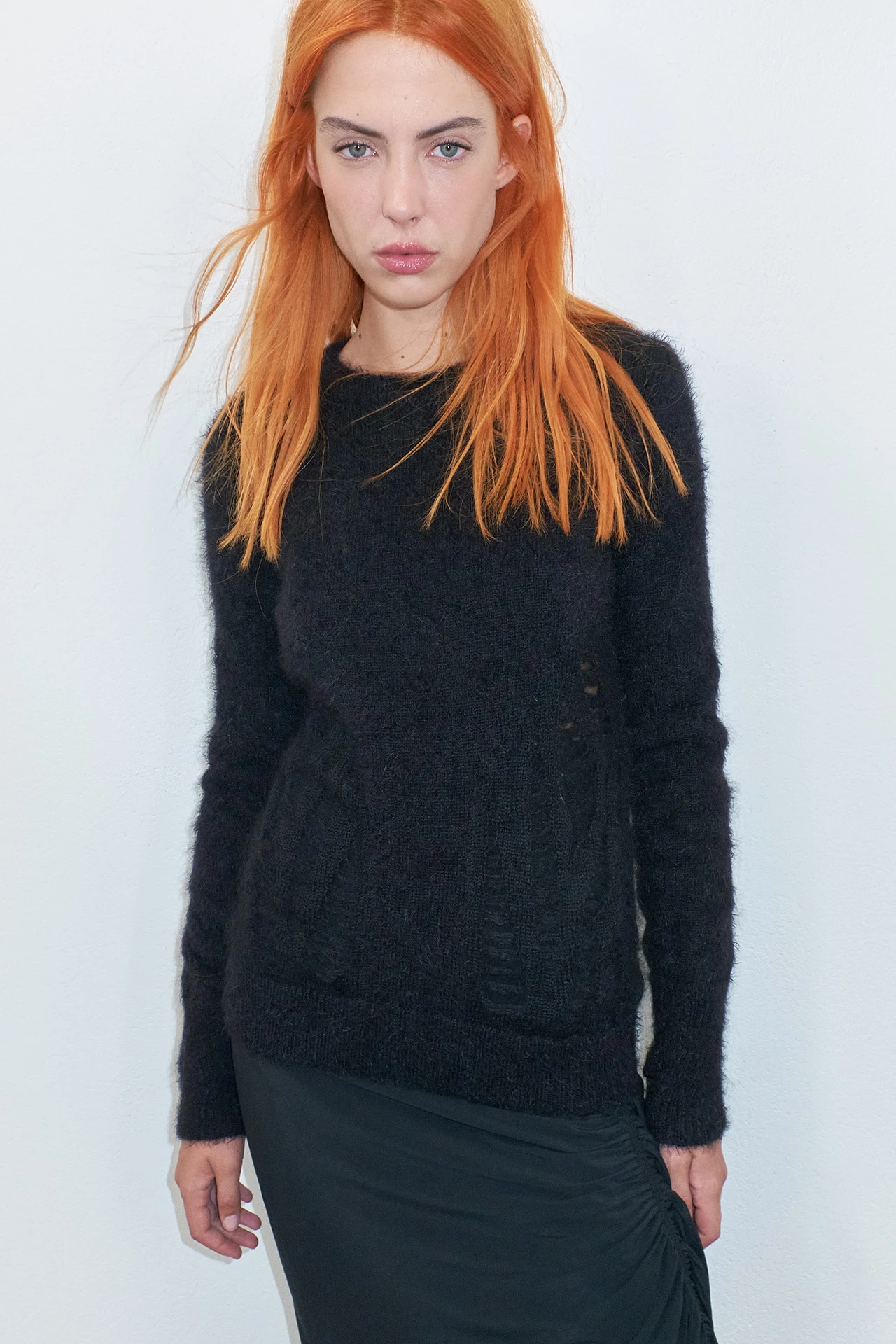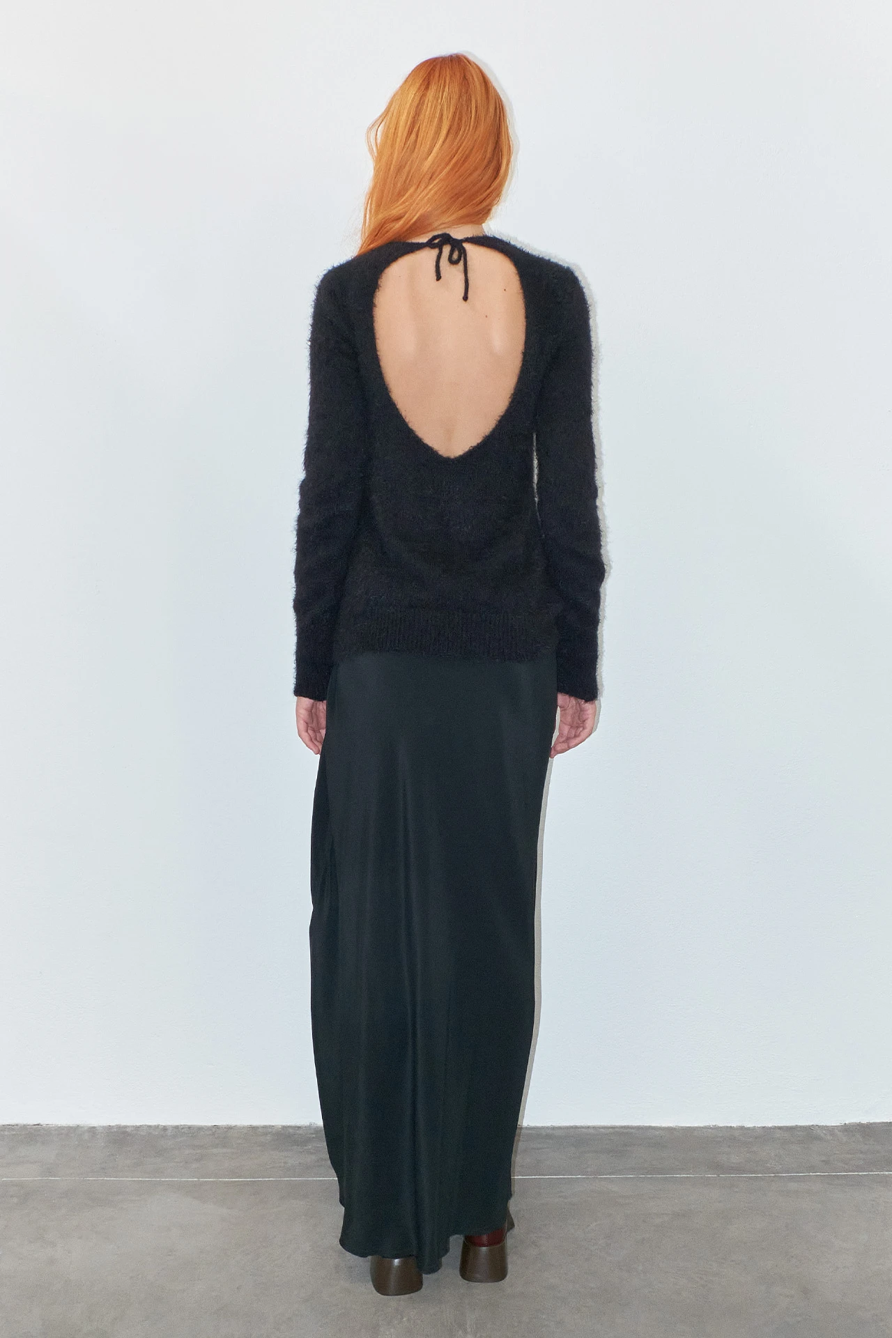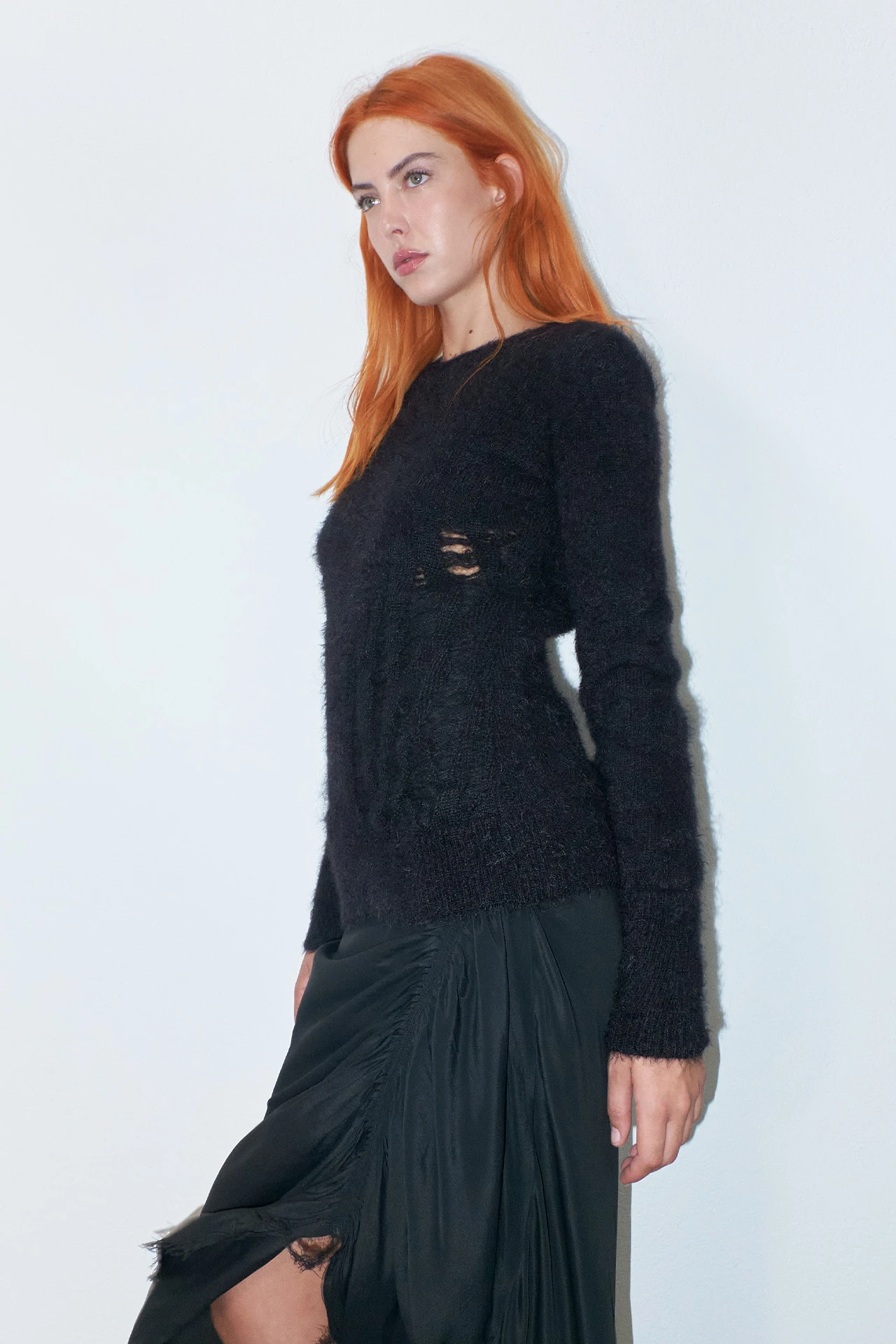Marcella is a jumper of many parts. She’s practical and reliable – long-sleeved and warm. But she’s also been out on the tiles once or twice, with a distressed effect to the front and a cooling opening to the back that ties tastefully at the nape of the neck.