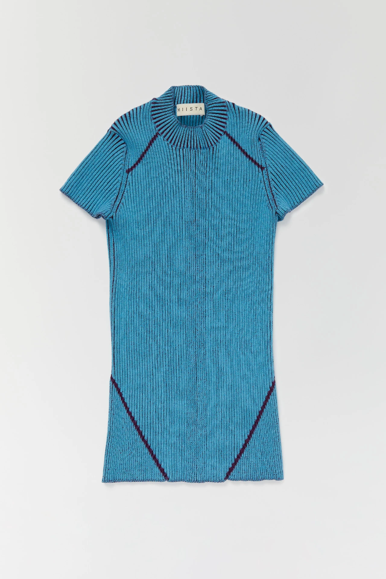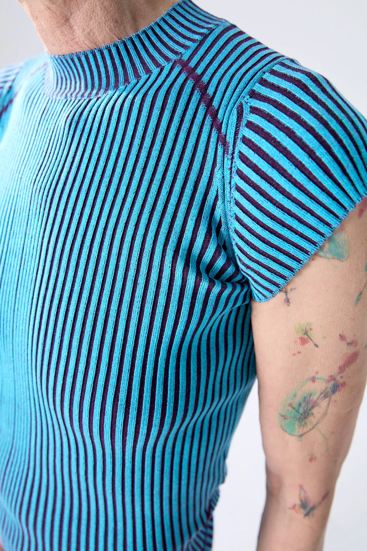 Mariechen strikes unchartered territory: where knitwear materiality meets sportswear sensibilities. Formed of a stretch viscose knit, the ribbed finish creates a two-tone effect, with rich burgundy peeking out between the linear blue ribbing. Thicker burgundy lines run from the collarbones to the sleeves, and from the hips diagonally inwards. If you pair Mariechen with her counterpart Bernice trousers, their lines join to form a streamlined V.