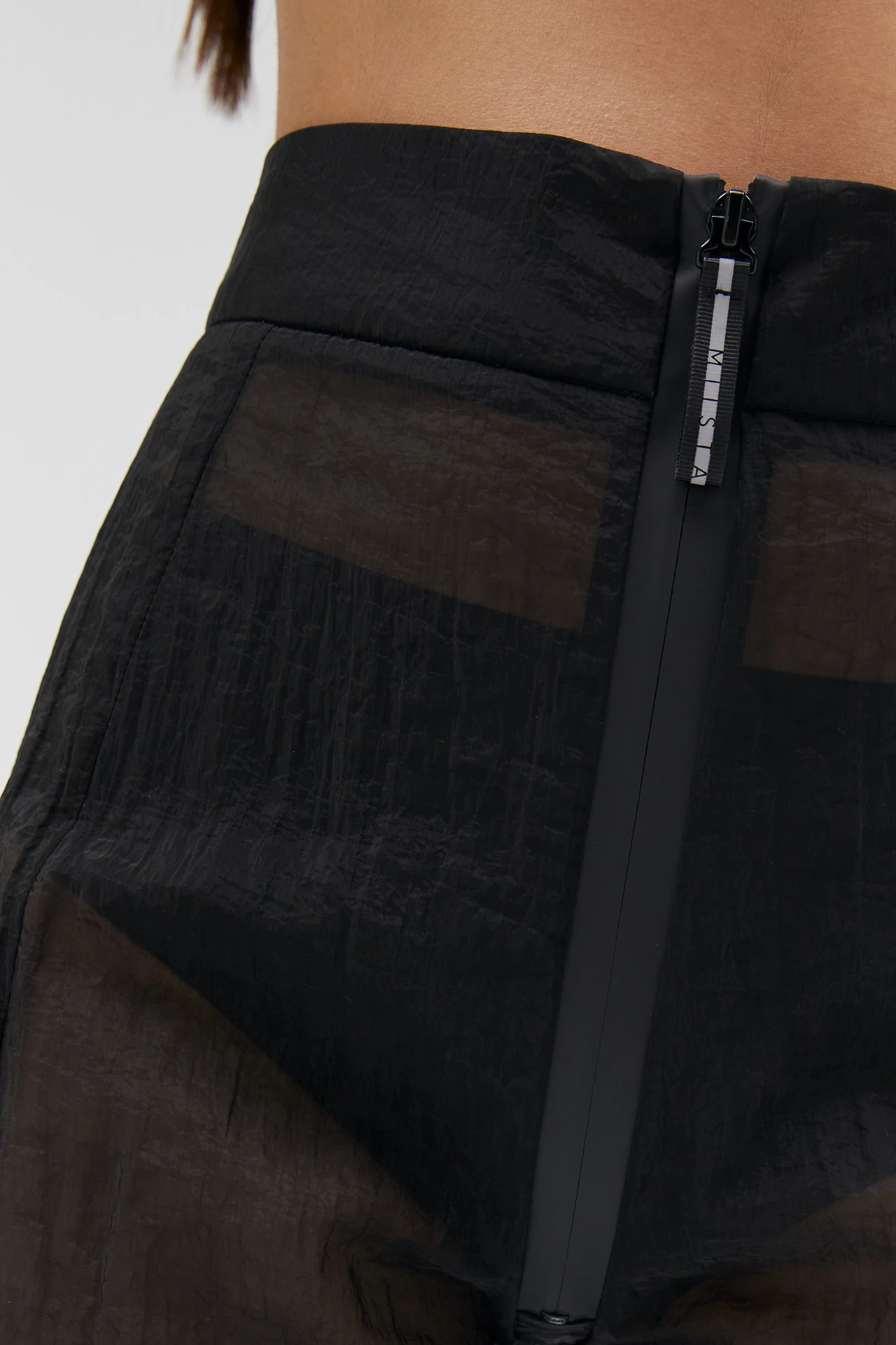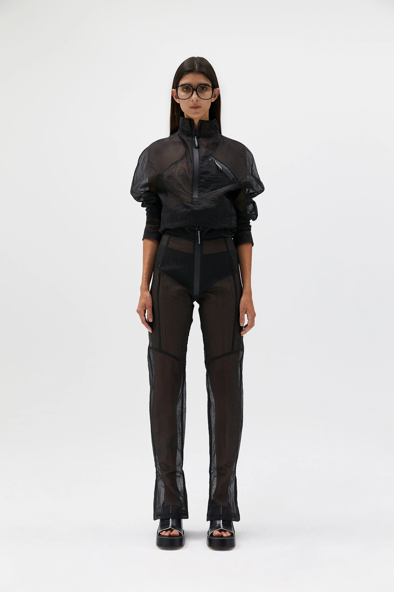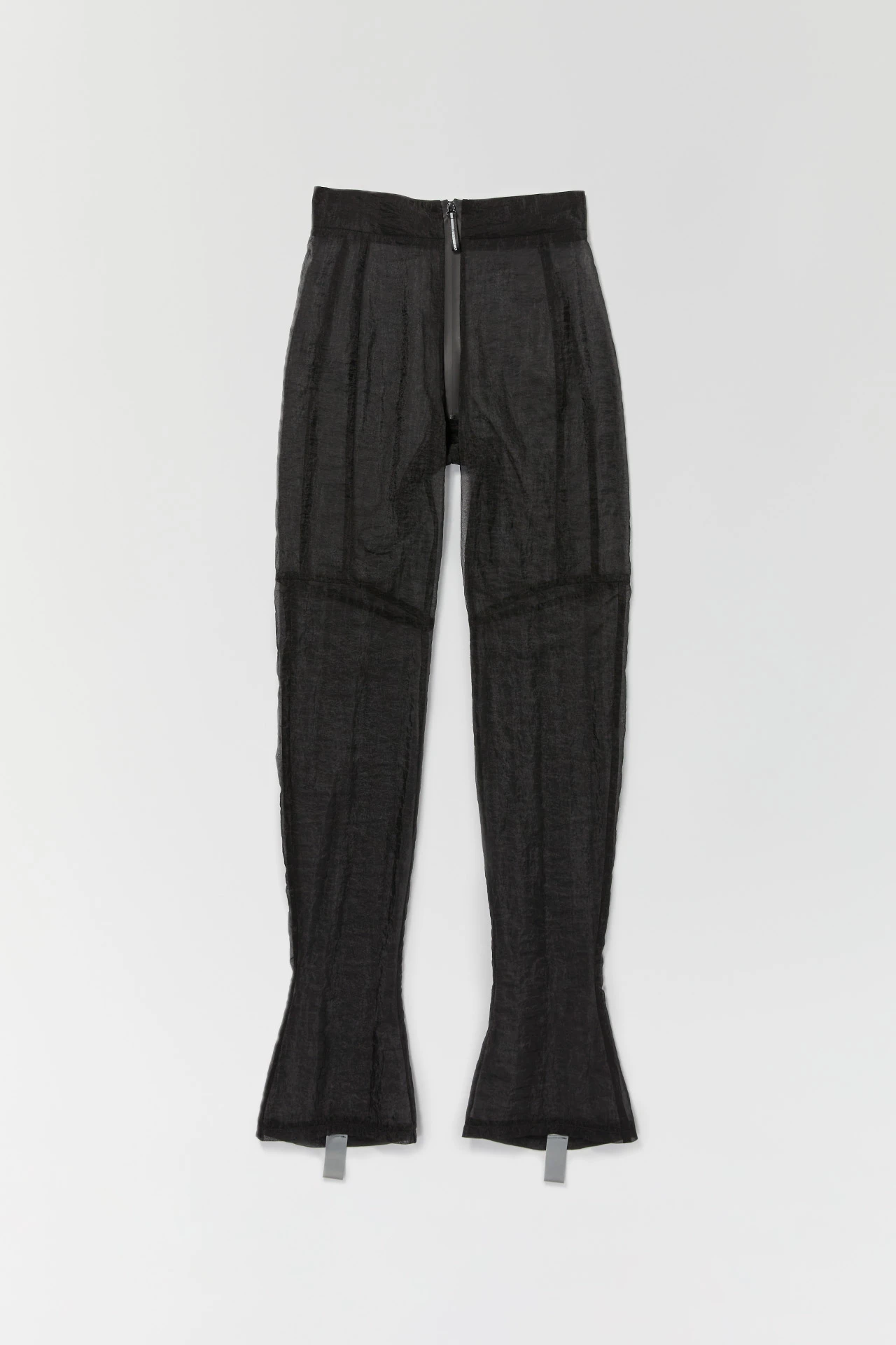 These organza trousers feature a flattering baby kick flare and high waist. Doubled up seams show off the trouser’s panels through the sheer fabric and reflective tabs at the hem add a sporty touch. Wear these with our matching Larisa top. Rebeca is 178cm tall and she is wearing a size S. This style is true to size. We recommend selecting your standard European size. Designed in London | Handcrafted in Spain