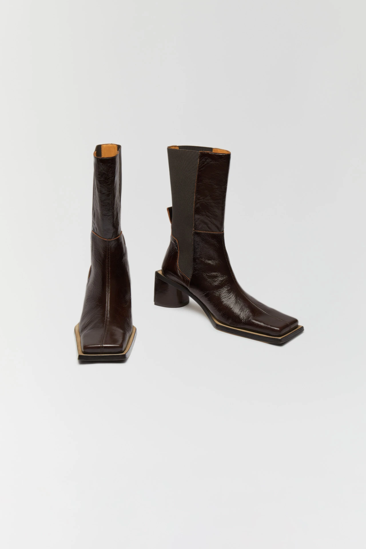 Formed of cracked brown leather, Minnie reaches up to the mid-calf – forming a perfect fit thanks to her wide elastic side panelling and a pull tab to the rear. Raw edges to her seams bring a tough look to her finish – as does her elongated square toe. Her waterfall heel, too, is slightly elongated, darting out beyond her upper for an angular finish to the rear in contrast to its rounded front.