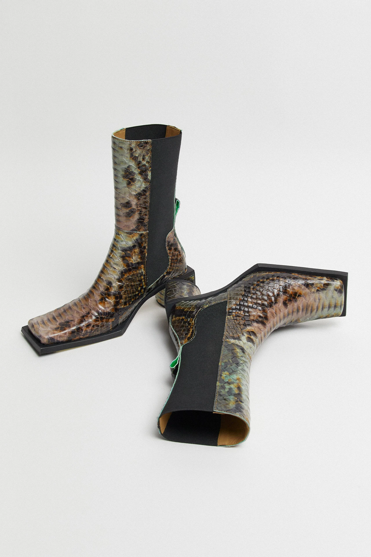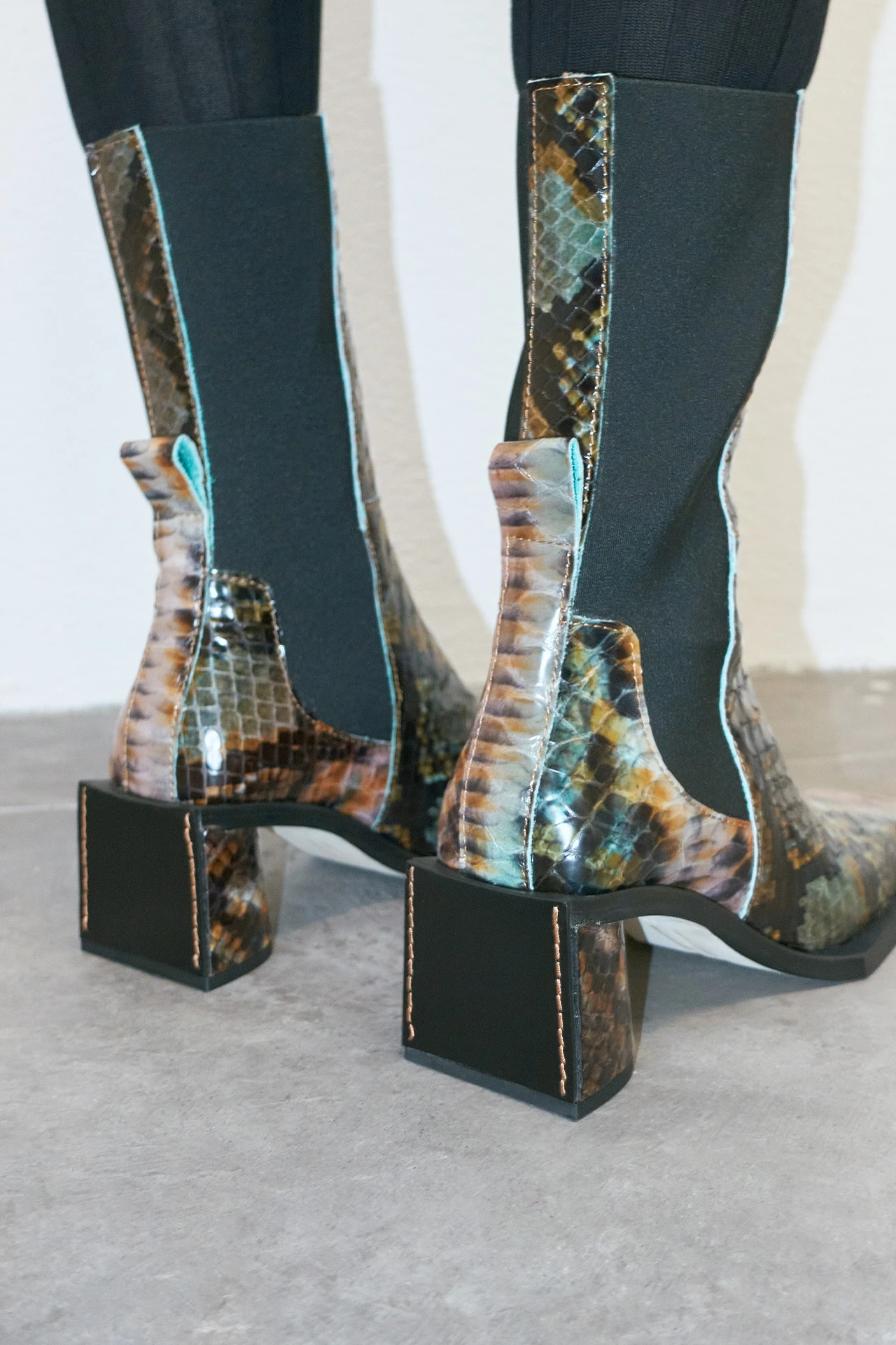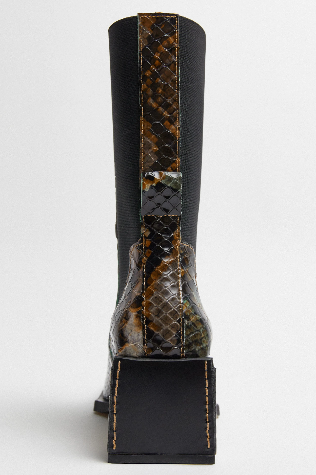 Formed of a patchwork of animal-skin effect leathers spanning multiple colours and patterns, Minnie reaches up to the mid-calf – forming a perfect fit thanks to her wide elastic side panelling and a pull tab to the rear. Raw edges to her seams bring a tough look to her finish – as does her elongated square toe. Her waterfall heel, too, is slightly elongated, darting out beyond her upper for an angular finish to the rear in contrast to its rounded front.