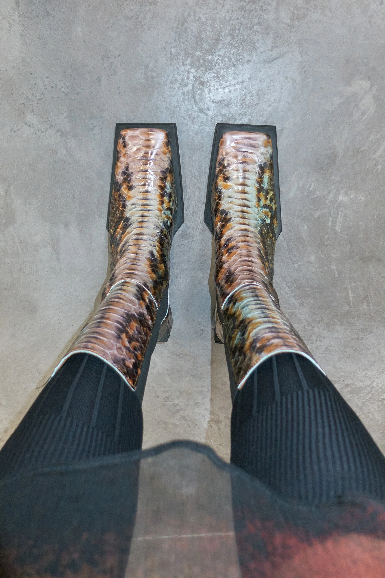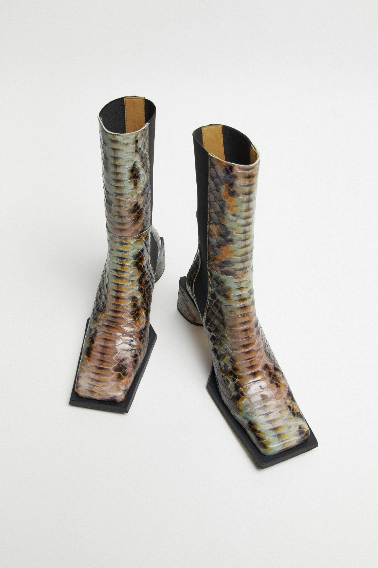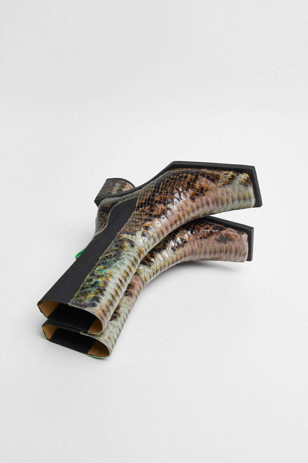 Formed of a patchwork of animal-skin effect leathers spanning multiple colours and patterns, Minnie reaches up to the mid-calf – forming a perfect fit thanks to her wide elastic side panelling and a pull tab to the rear. Raw edges to her seams bring a tough look to her finish – as does her elongated square toe. Her waterfall heel, too, is slightly elongated, darting out beyond her upper for an angular finish to the rear in contrast to its rounded front.