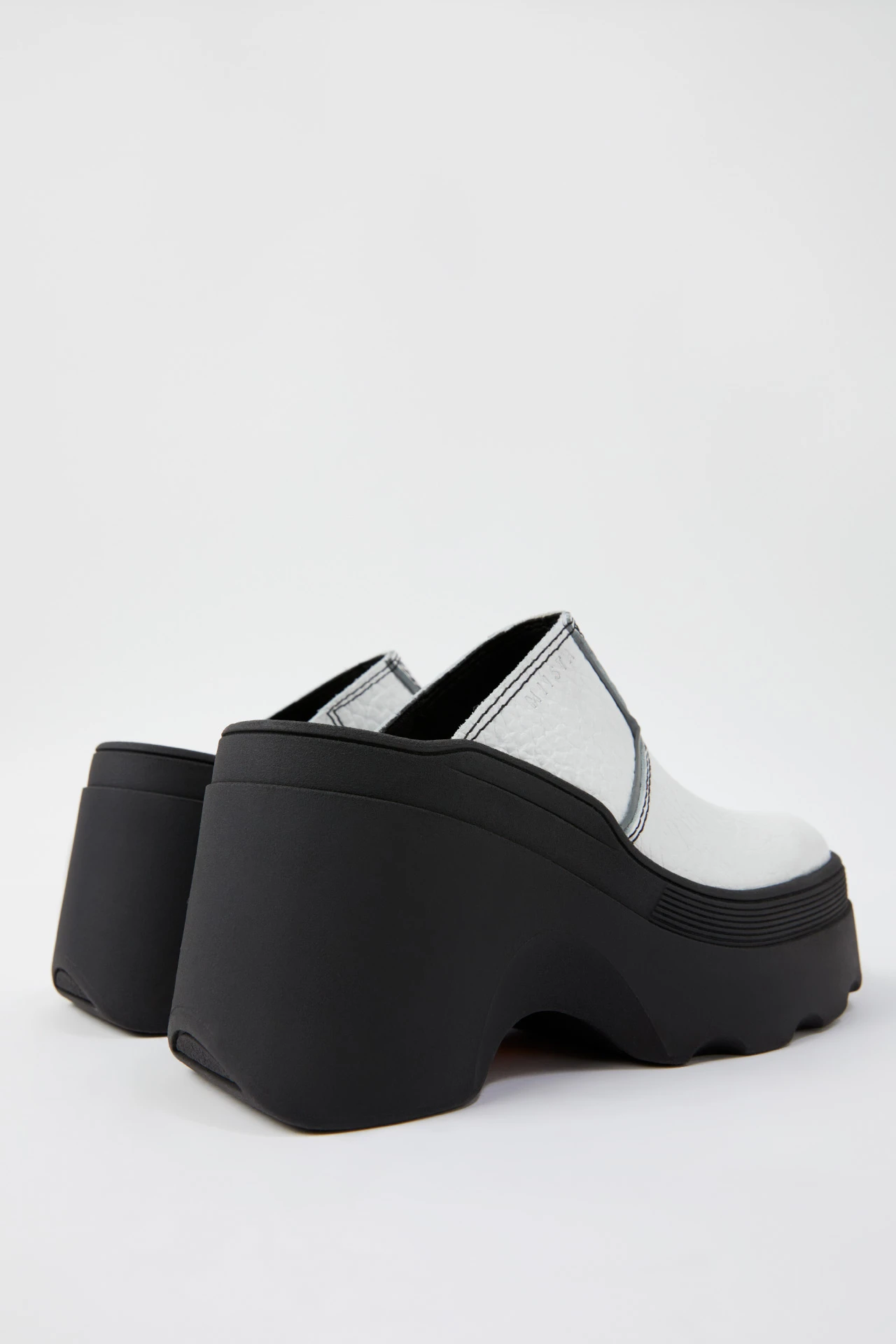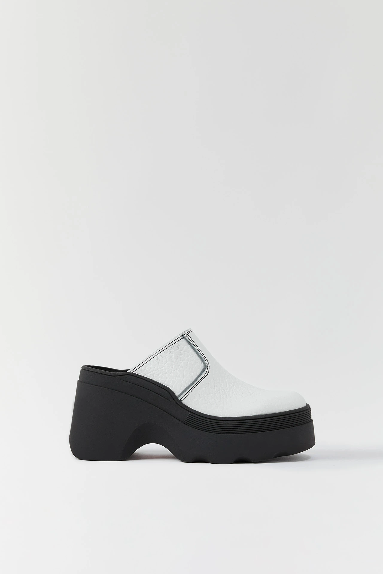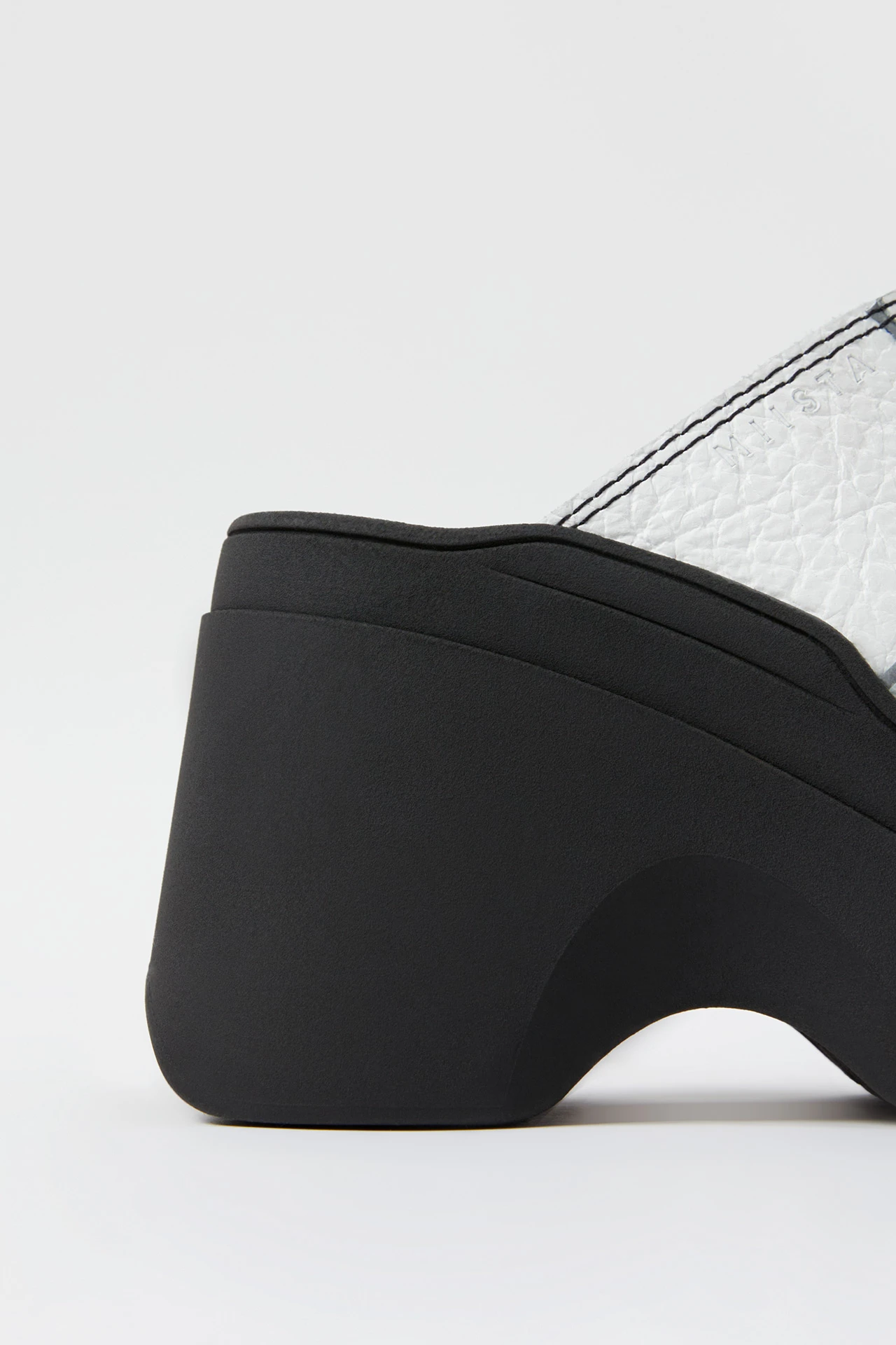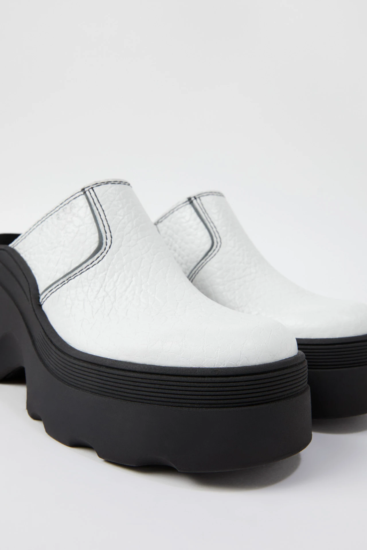 Mirabella is the toughened-up mule of tomorrow. Upon entry, her wearer’s foot sinks deep into her white cow tumble leather upper and thick, gripped rubber outsole – the edges of which extend above and beyond the insole, wrapping the back of the foot. It means Mirabella appears much higher than she feels – an effect that’s wholeheartedly supported by her thick flatformed frontage. Her upper is finished with black contrast stitching, Miista branding on the outer panel, and reflective 3M piping on her panels for day-to-night visibility.