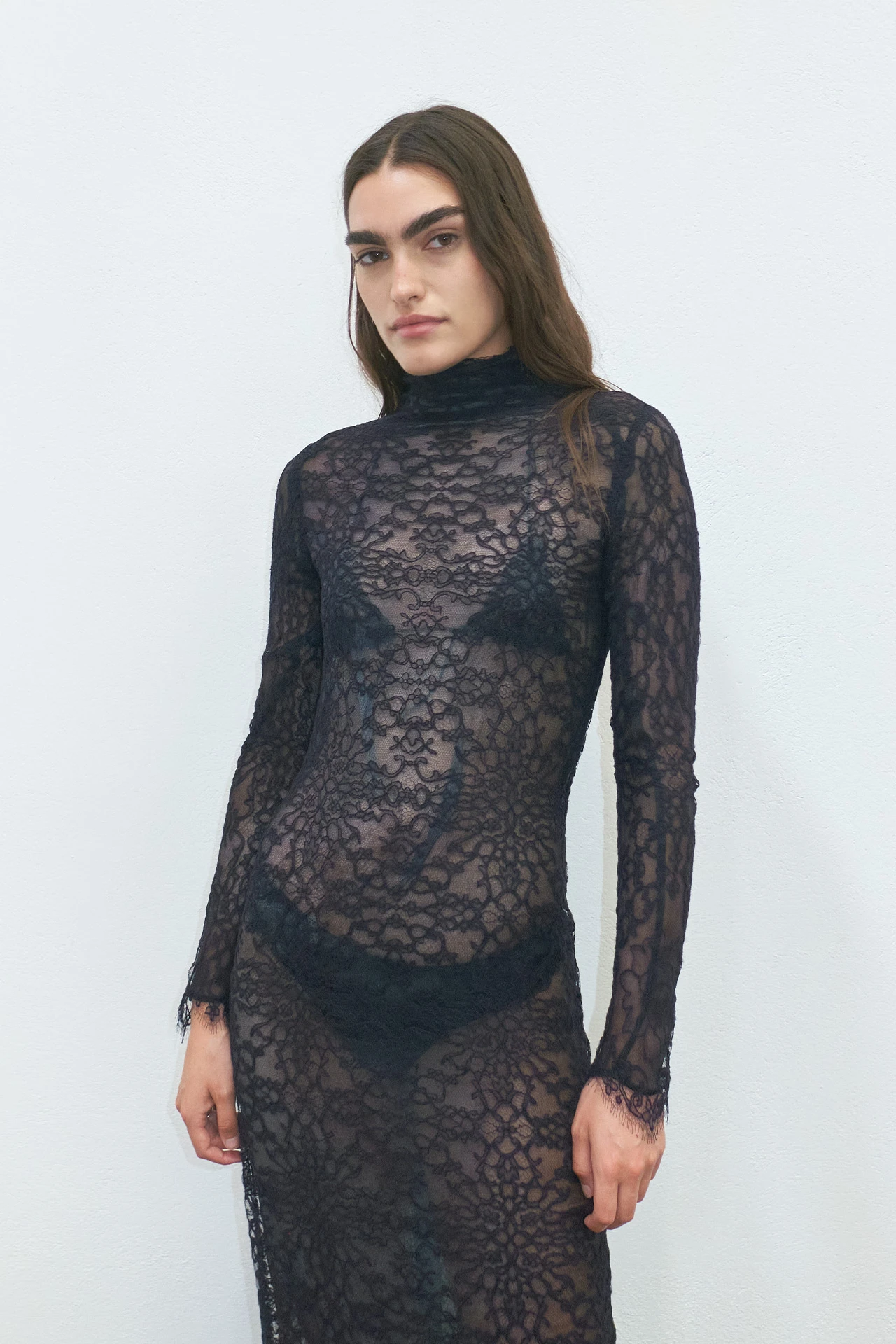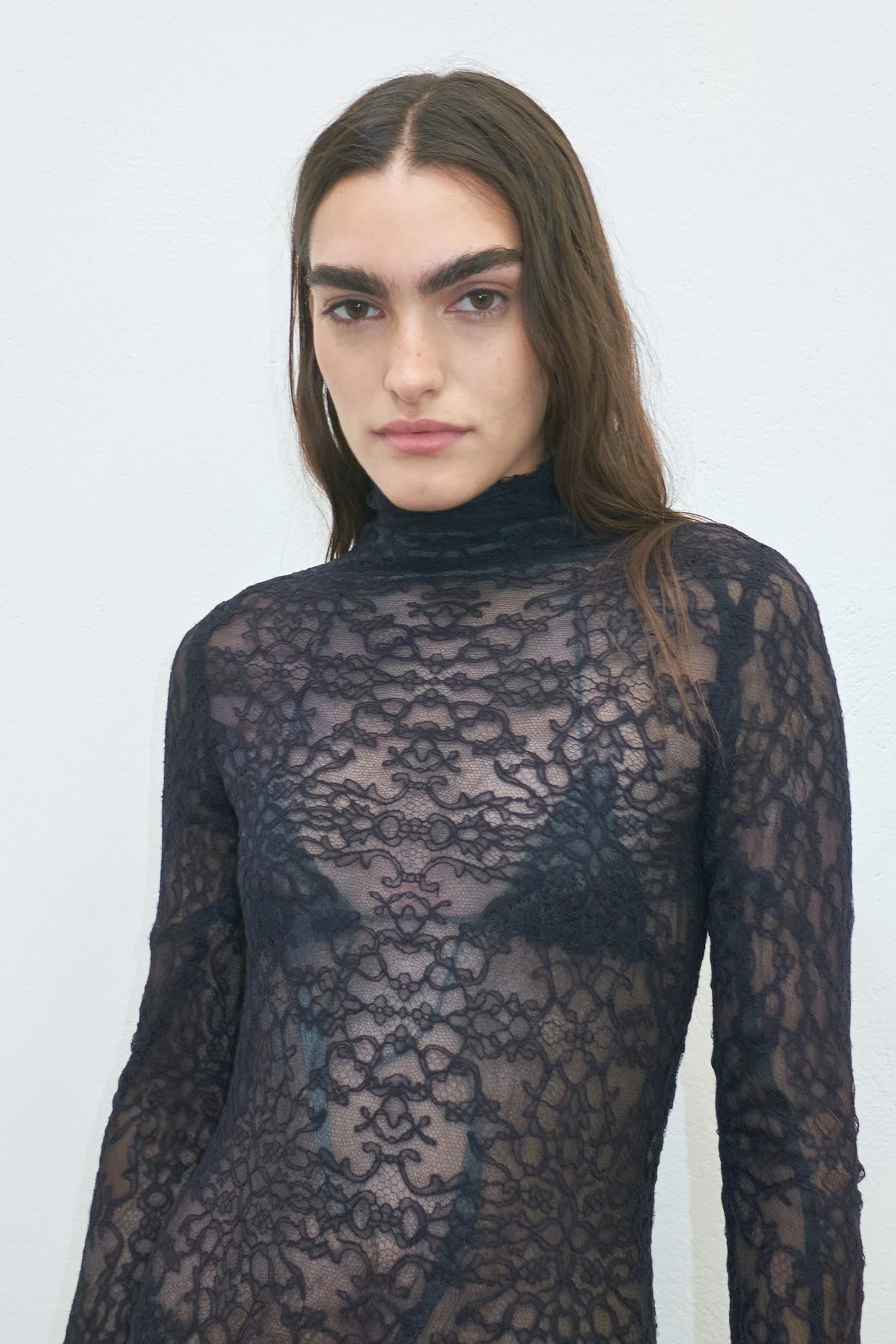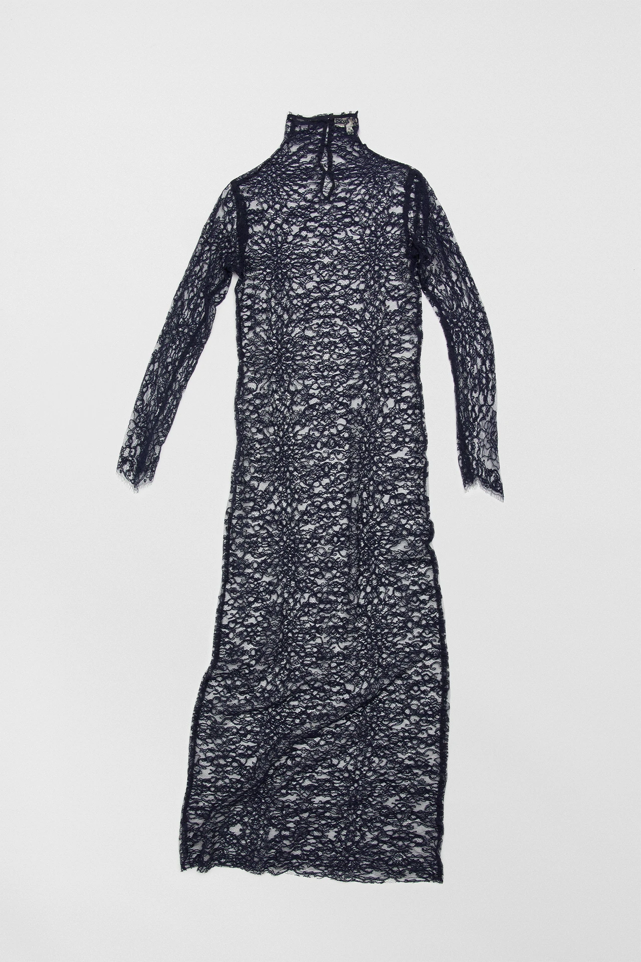 Like Alves, Miranda might be high-necked and long-sleeved, but she’s anything but prudish. Formed of elasticated navy blue lace, she weaves across the body like a second skin, forming floral-esque patterns as the lace’s density ebbs and flows. She clasps at the neck and reaches down in a long length. Layer her under or over – or with nothing else at all.
