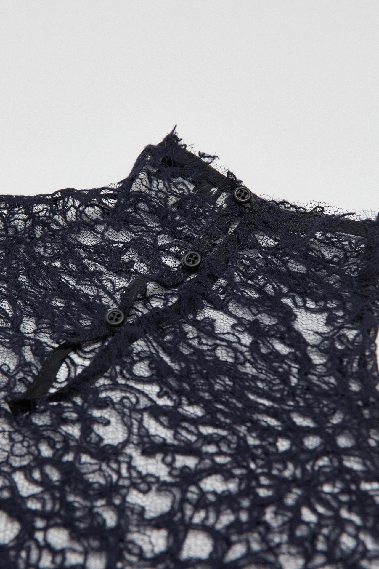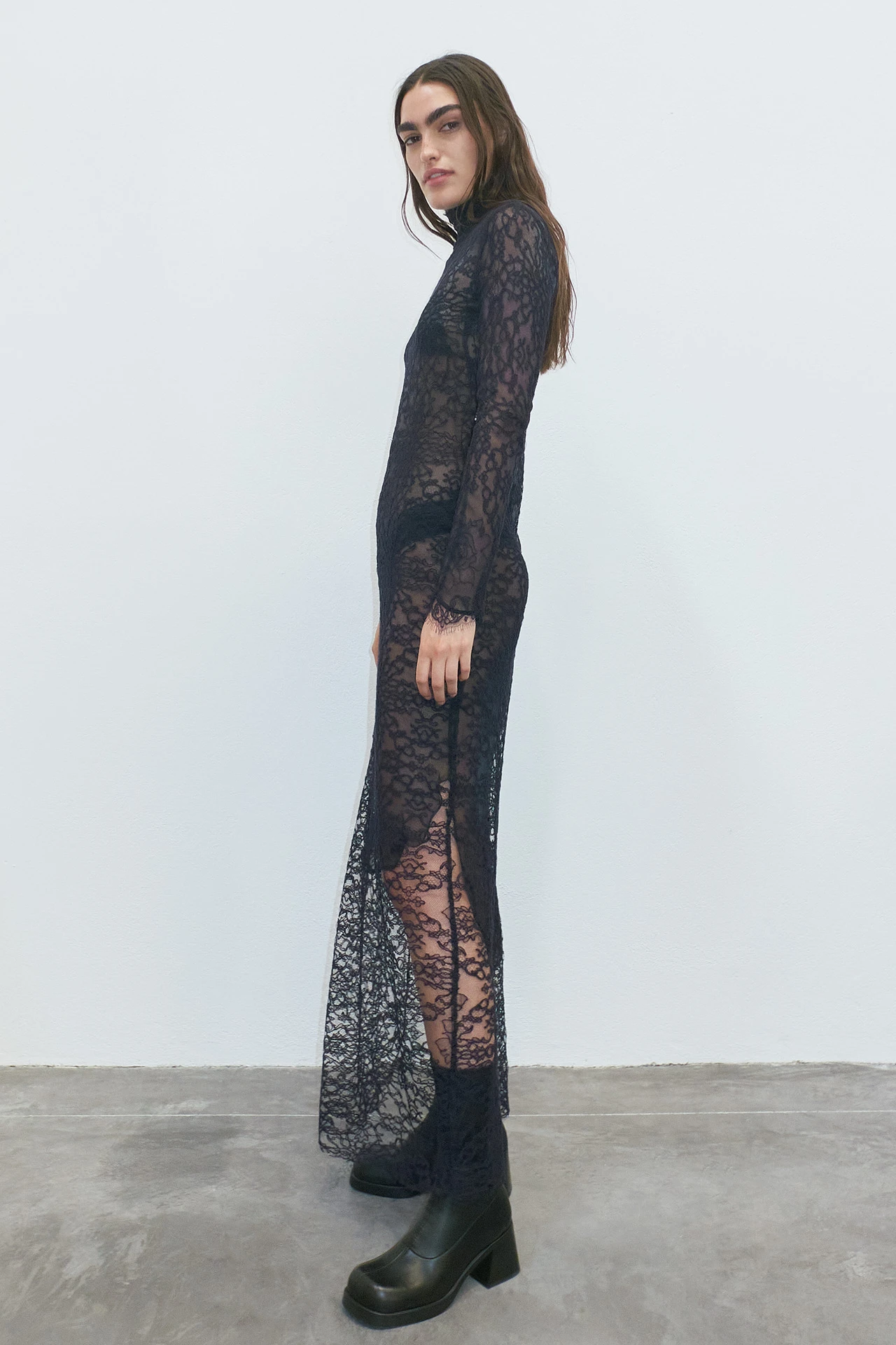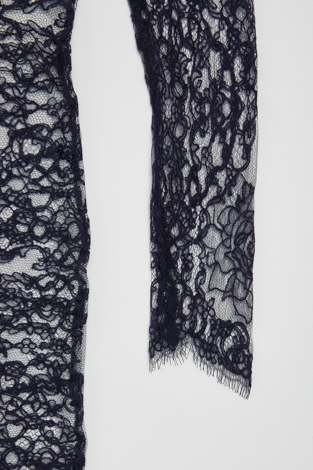 Like Alves, Miranda might be high-necked and long-sleeved, but she’s anything but prudish. Formed of elasticated navy blue lace, she weaves across the body like a second skin, forming floral-esque patterns as the lace’s density ebbs and flows. She clasps at the neck and reaches down in a long length. Layer her under or over – or with nothing else at all.