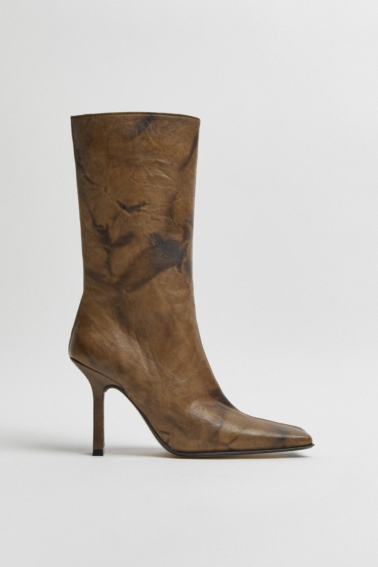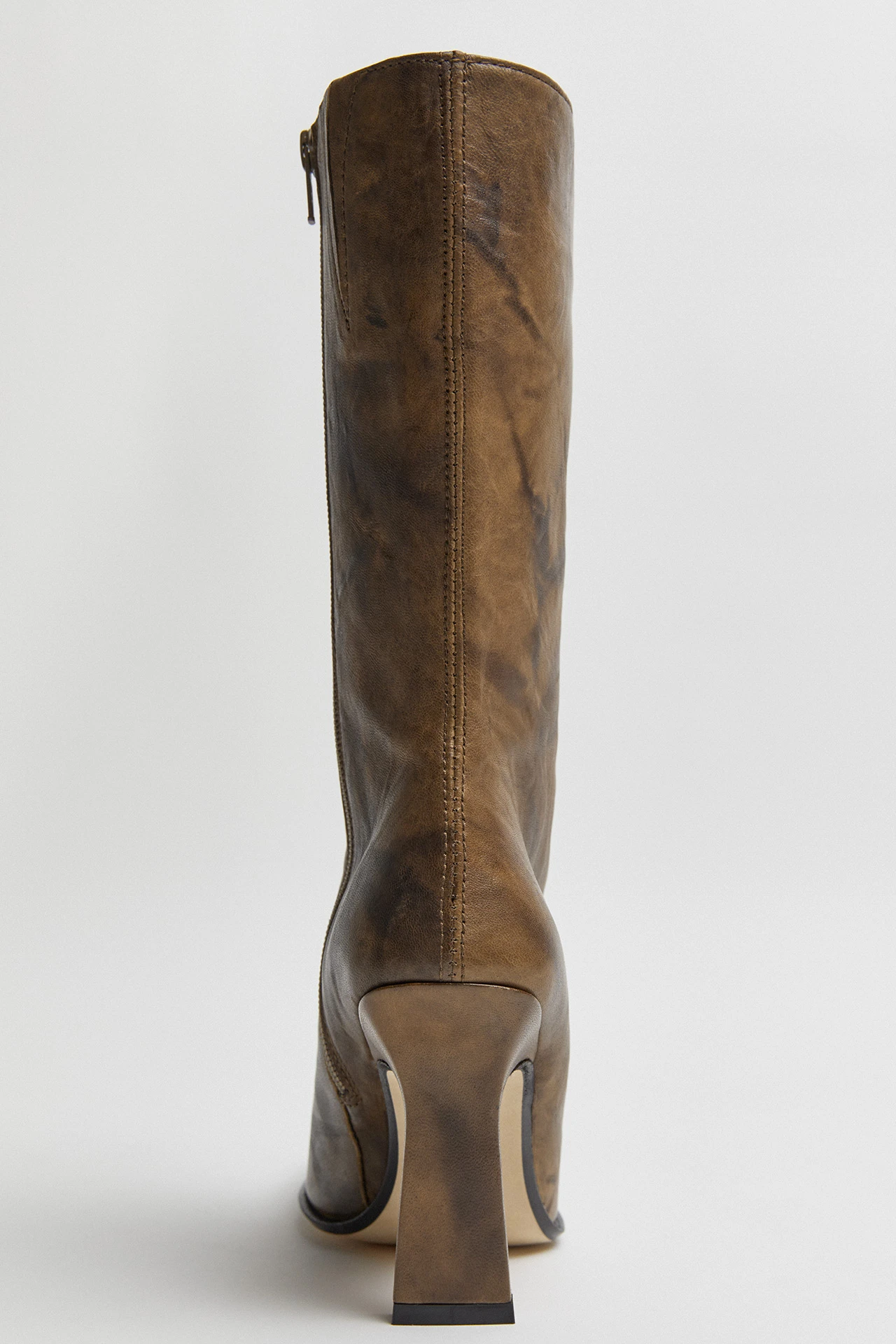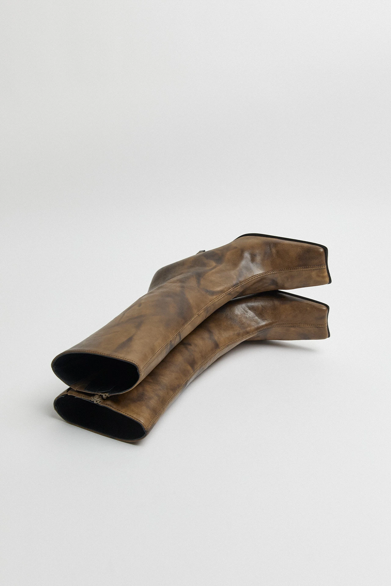 Reaching the mid-calf, Noor sports a sharp, leather-coated kickback heel, and a swooping, swirling brown leather upper – complete with a central seam running to her revered concave toe. Her inside zip and its accompanying subtle elastic gusset allow Noor’s wearers the perfect fit, with memory foam insoles offering enhanced comfort. Her lining is crafted from vegetable tan cow leather for breathability, and the same materiality features on her sole, too – finished with a rubber top piece heel and invected toe for durability. Noor is not a boot, she’s an Icon.