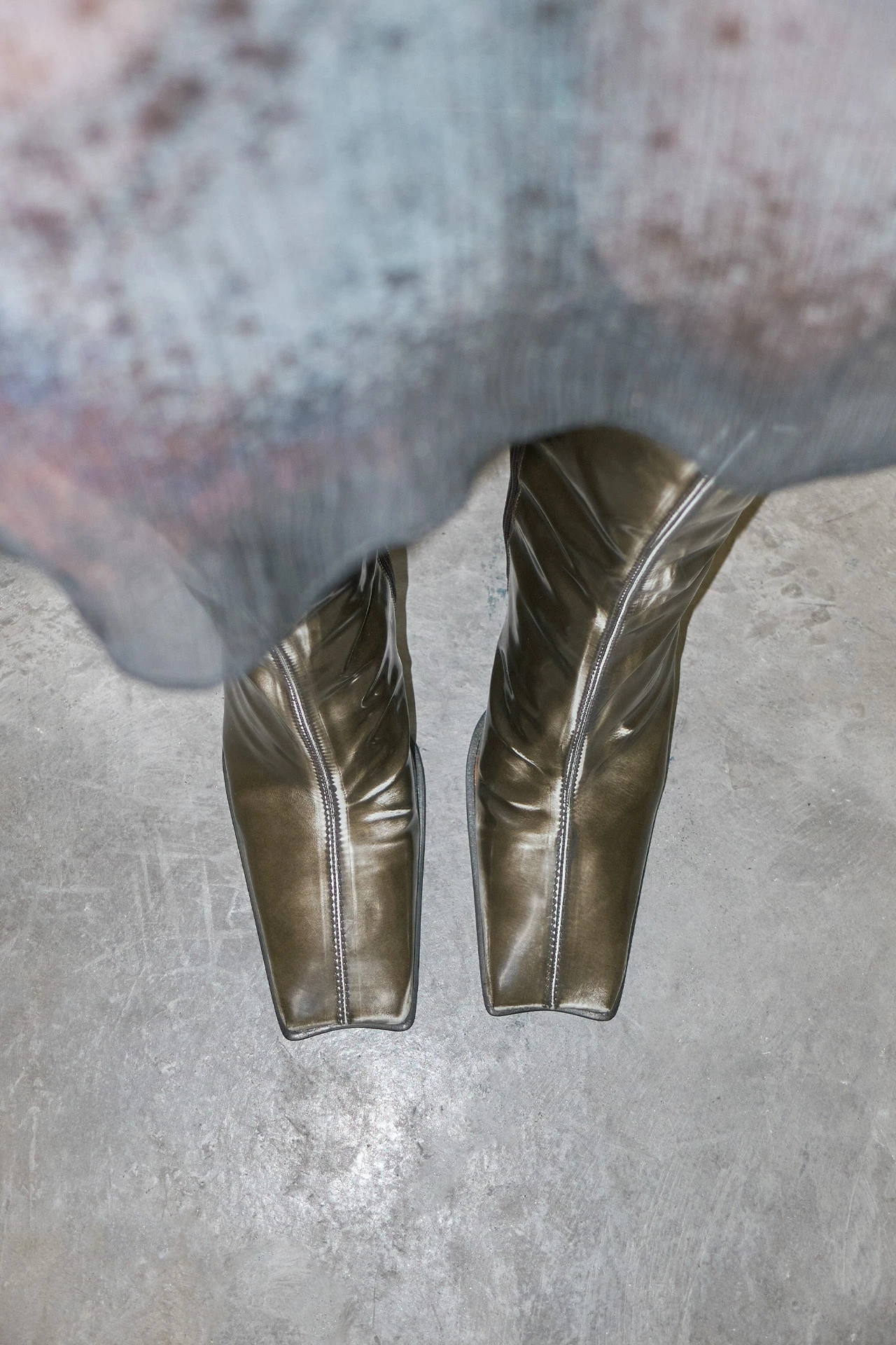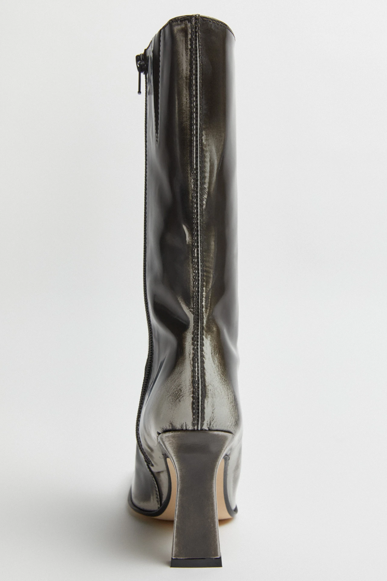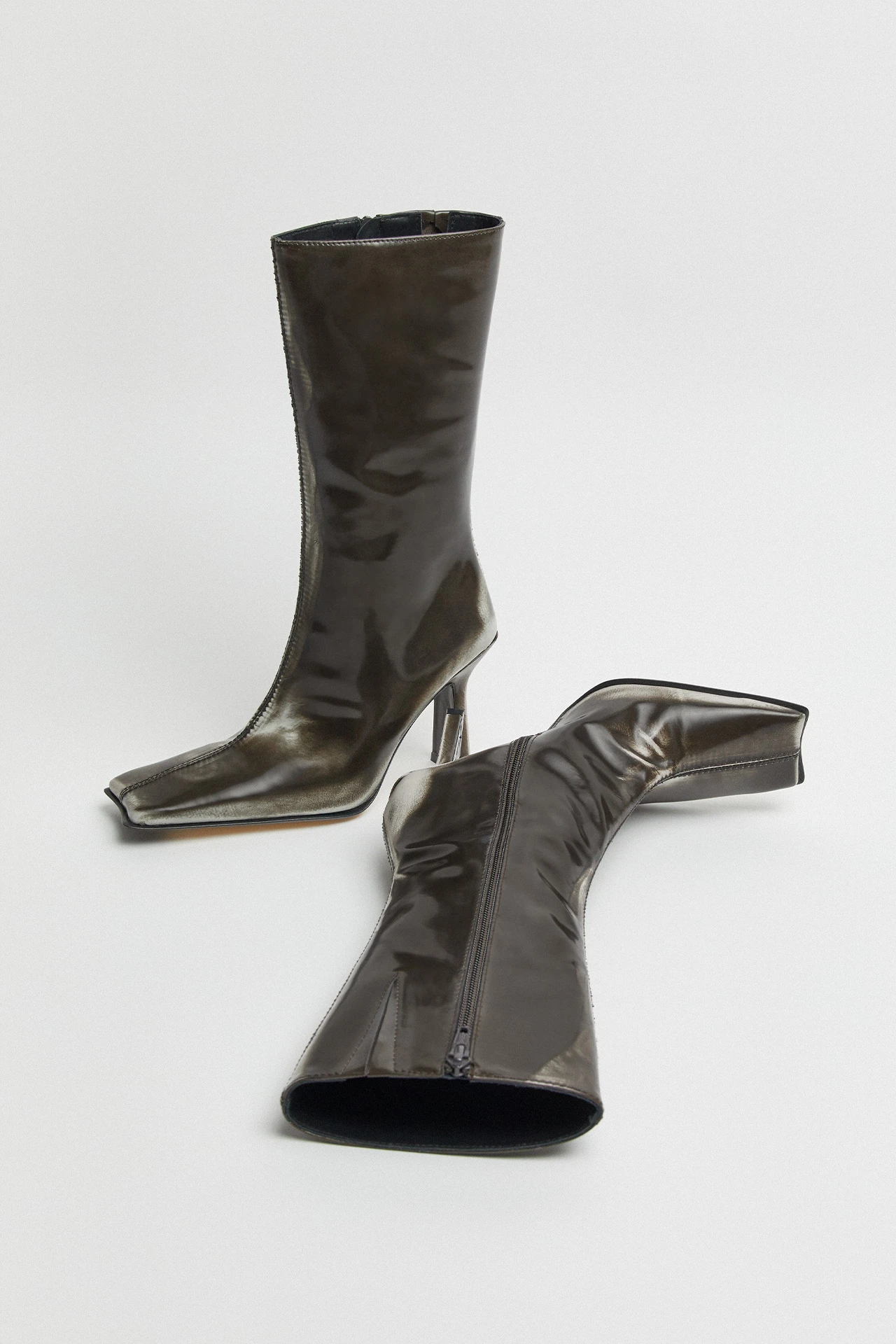 Reaching the mid-calf, Noor sports a sharp, leather-coated kickback heel, and a swooping dark grey patent leather upper – complete with a central seam running to her revered concave toe, which has been gently brushed to reveal a light grey distressed effect beneath. Her inside zip and its accompanying subtle elastic gusset allow Noor’s wearers the perfect fit, with memory foam insoles offering enhanced comfort. Her lining is crafted from vegetable tan cow leather for breathability, and the same materiality features on her sole, too – finished with a rubber top piece heel and invected toe for durability. Noor is not a boot, she’s an Icon.