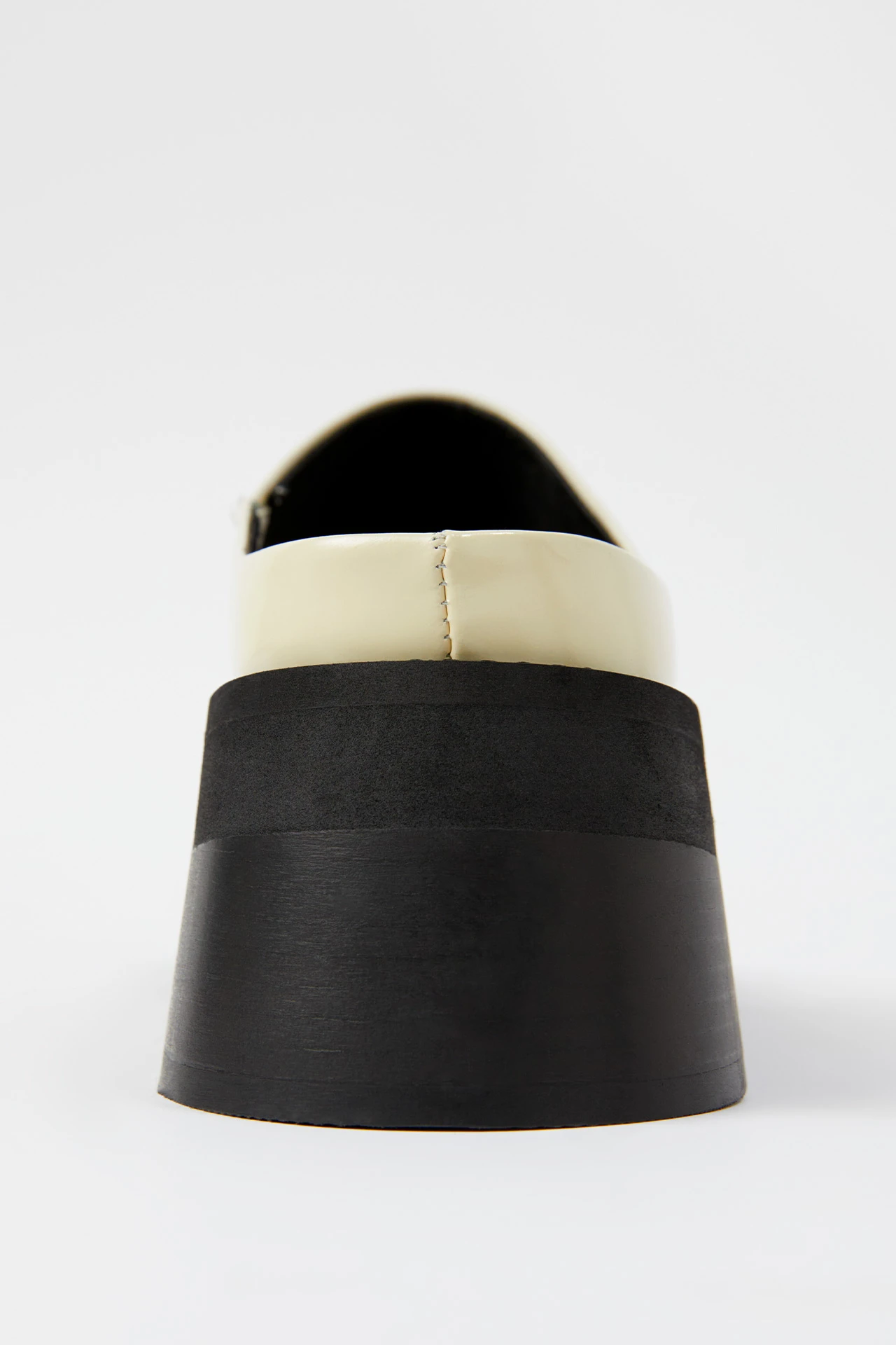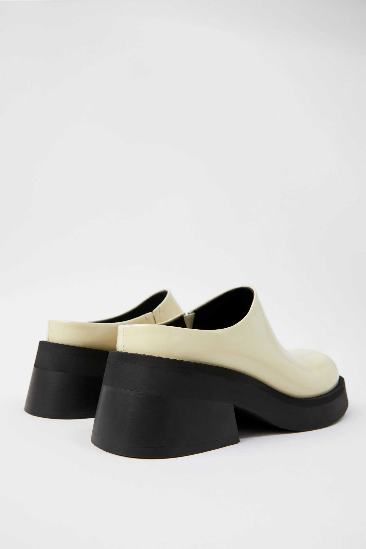 Where mule meets clog, Odile makes strides. Formed of beige box shiny leather to her upper with no visible stitching, her lines hug the lower ankle and flow down to robust curved frontage that flicks up slightly to the toe. She’s complete with a discreet elastic gusset for giving added stretch to the cuff, and sits atop a robust, slightly flared rubber sole and mid heel in black for enduring wearability and signature E8 impact. Heel Height: 6 cm This style is true to size. We recommend selecting your standard European size.