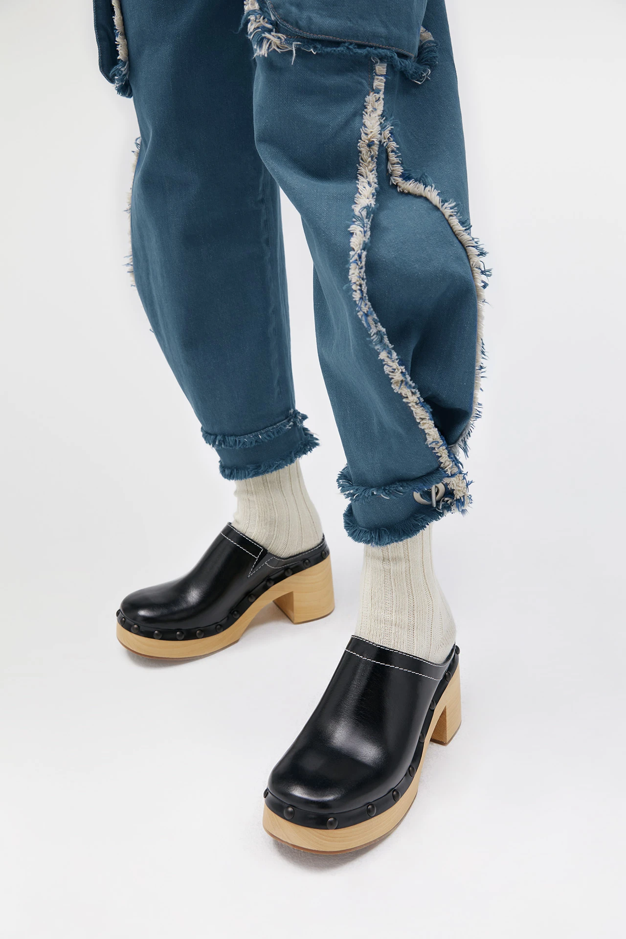 If confidence could be found in a pair of clogs. Ophelia’s smooth black leather upper is paired with tonal black studs, contrast white stitching and a chunky high wooden platform clog for comfort and height. Finished with ultra-cushioned memory foam insoles, leather lining, wooden soles and rubber outsole. Heel height 8cm. This style is true to size. We recommend selecting your standard European size.