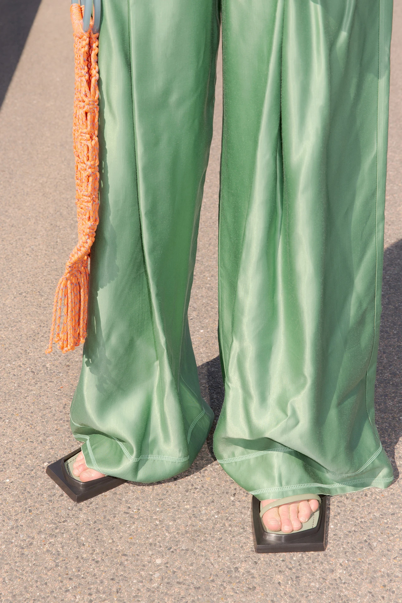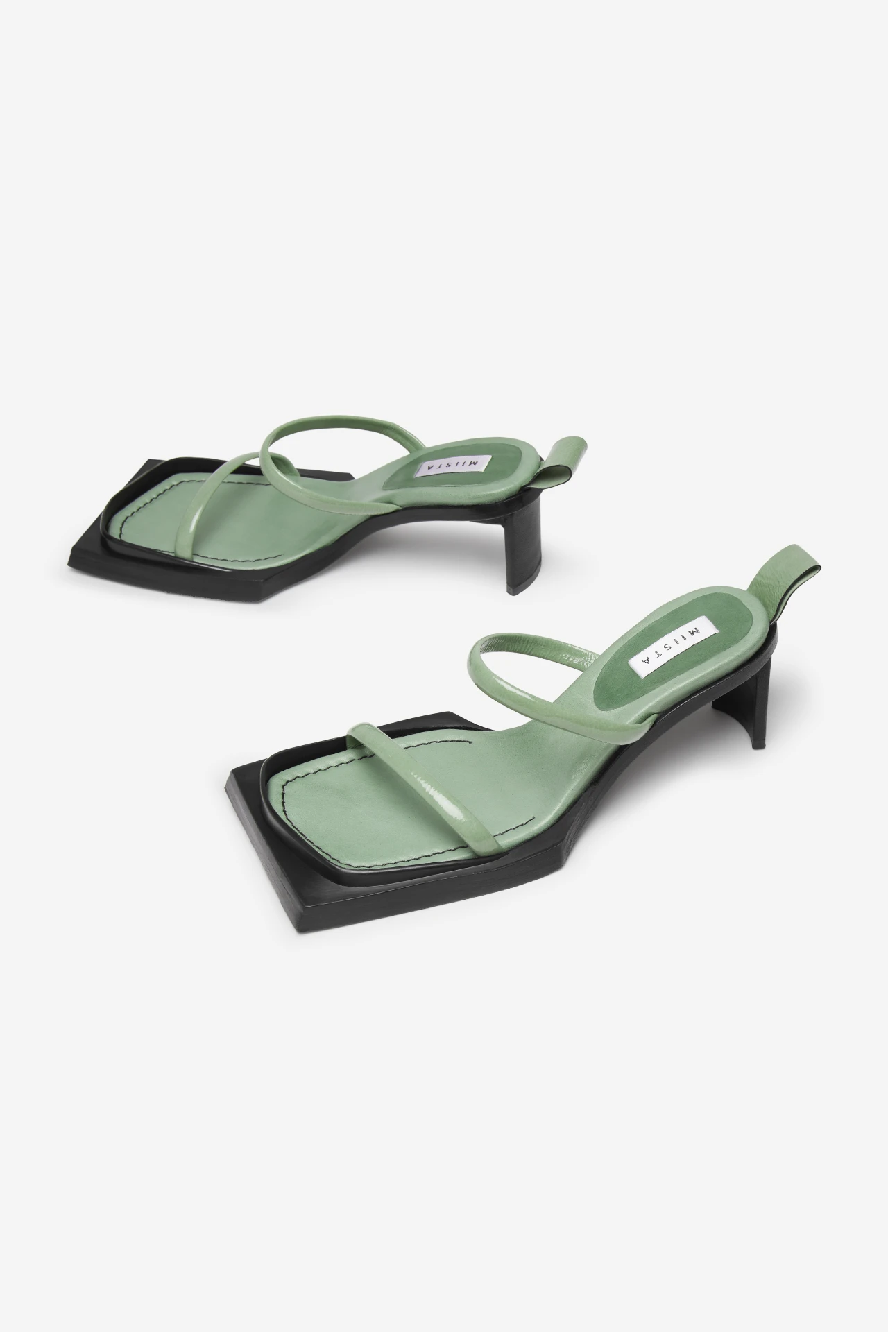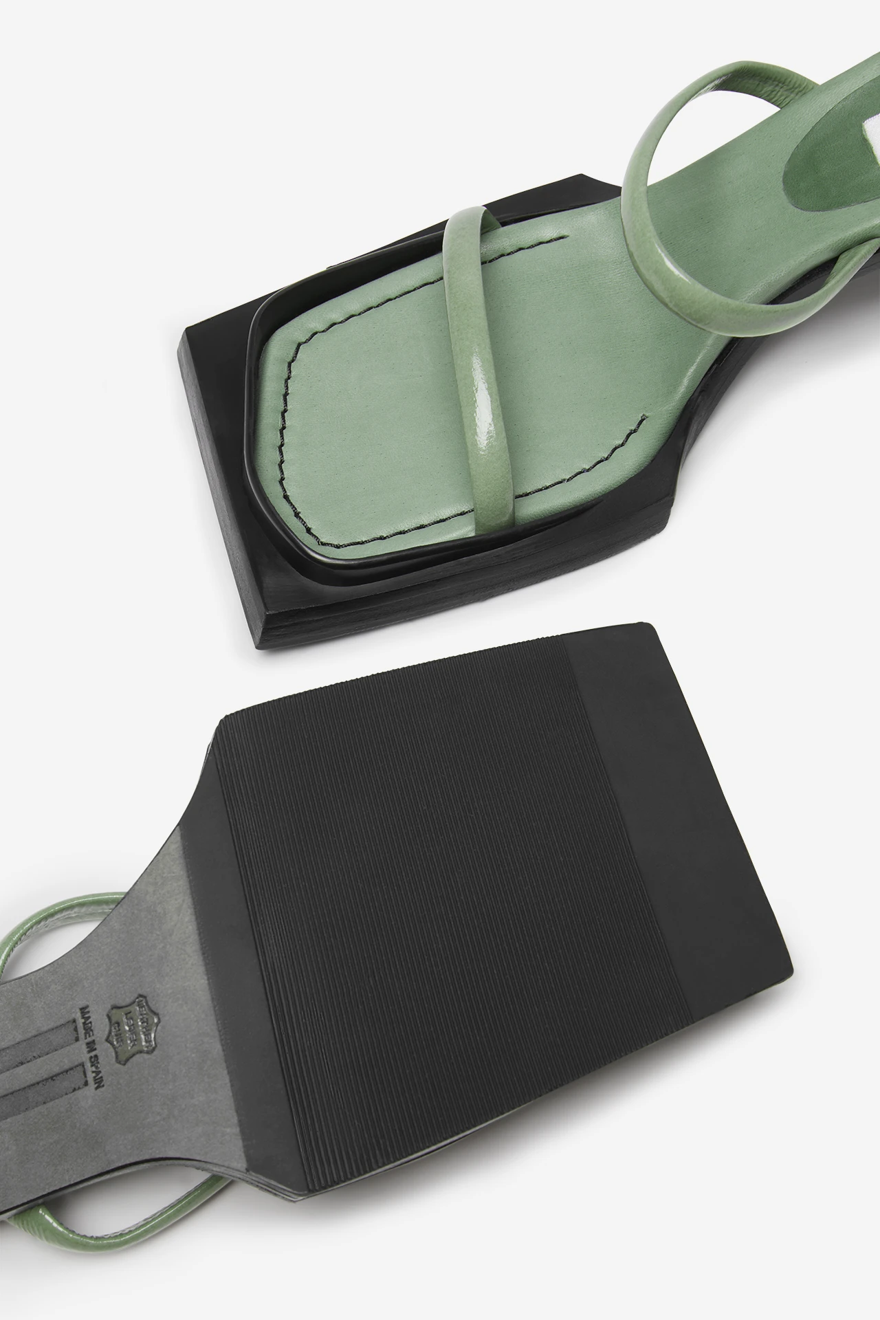 An extreme square toe is imperfectly balanced by an uber-thin vertical heel in the Phyllis sandals. Featuring green patent leather straps, a leather pull tab and a raised rubberised toe cap border to encase toes with a protective edge for high octane style. Finished with ultra-cushioned memory foam insoles, calf leather lining and leather outsoles injected with rubber details for added grip and endurance. This style is true to size. We recommend selecting your standard European size. Designed in London | Handcrafted in Spain